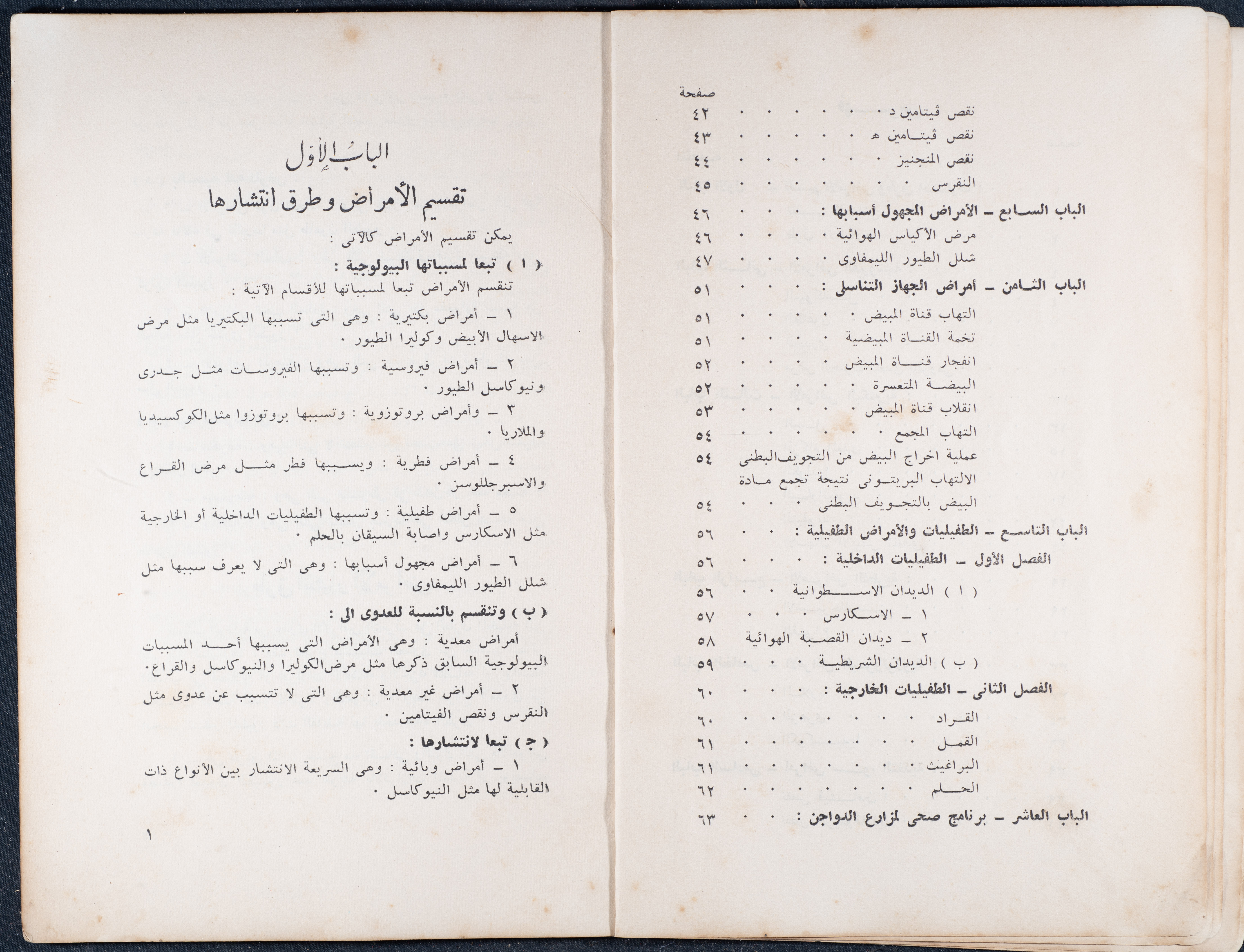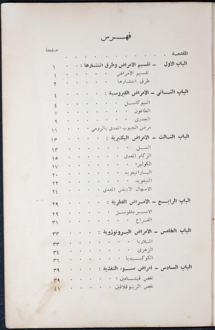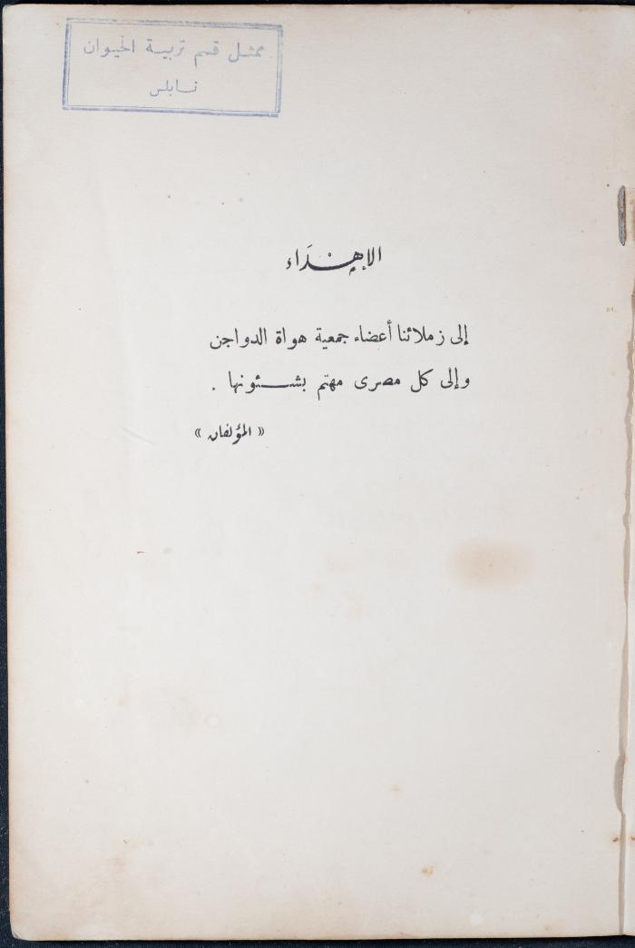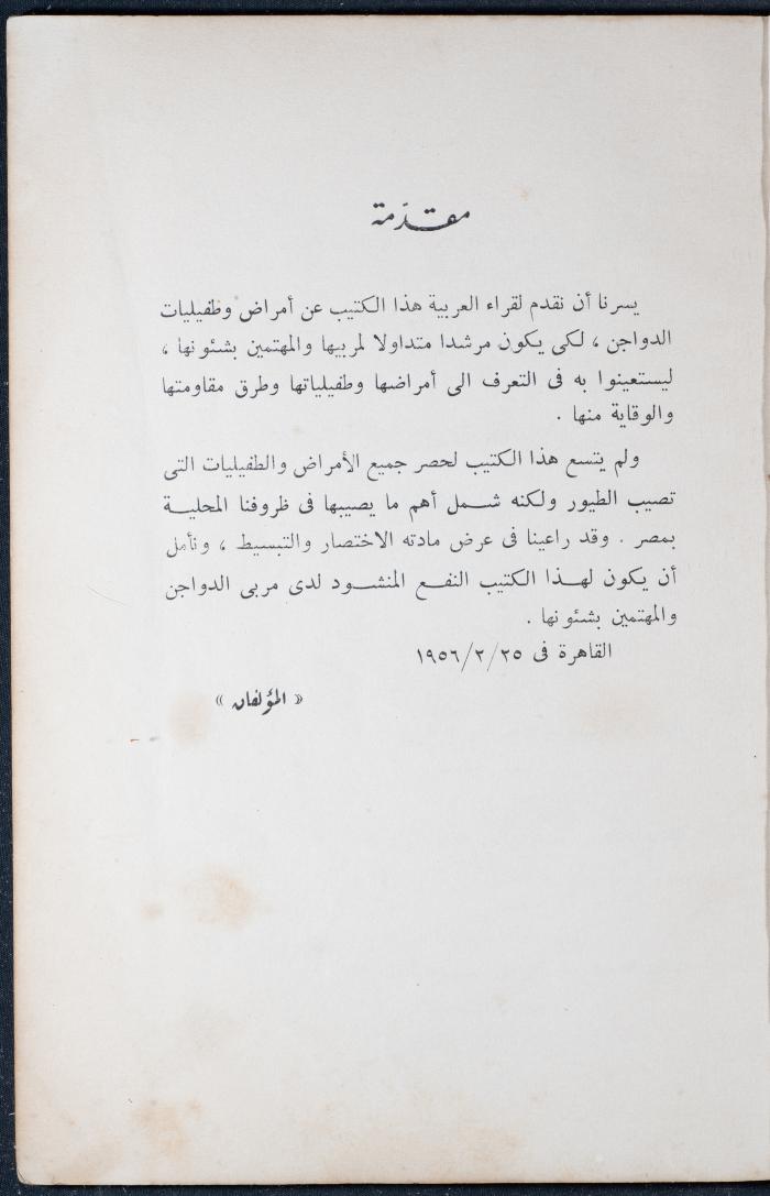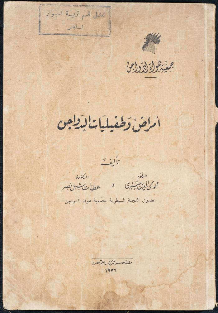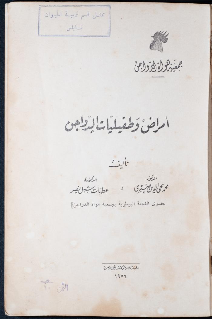 وثيقة مطبوعة باللغة العربية، تتضمن جزء من كتاب أمراض وطفيليات الدواجن، نشر في القاهرة سنة 1956، يضم الكتاب فهرس حول تقسيم الأمراض وأنواعها وطرق انتشارها إضافة لبرنامج صحي لمزارع الدواجن، ويظهر على الغلاف ختم وجيه عبد الباقي وهو ممثل قسم تربية الحيوان في نابلس.