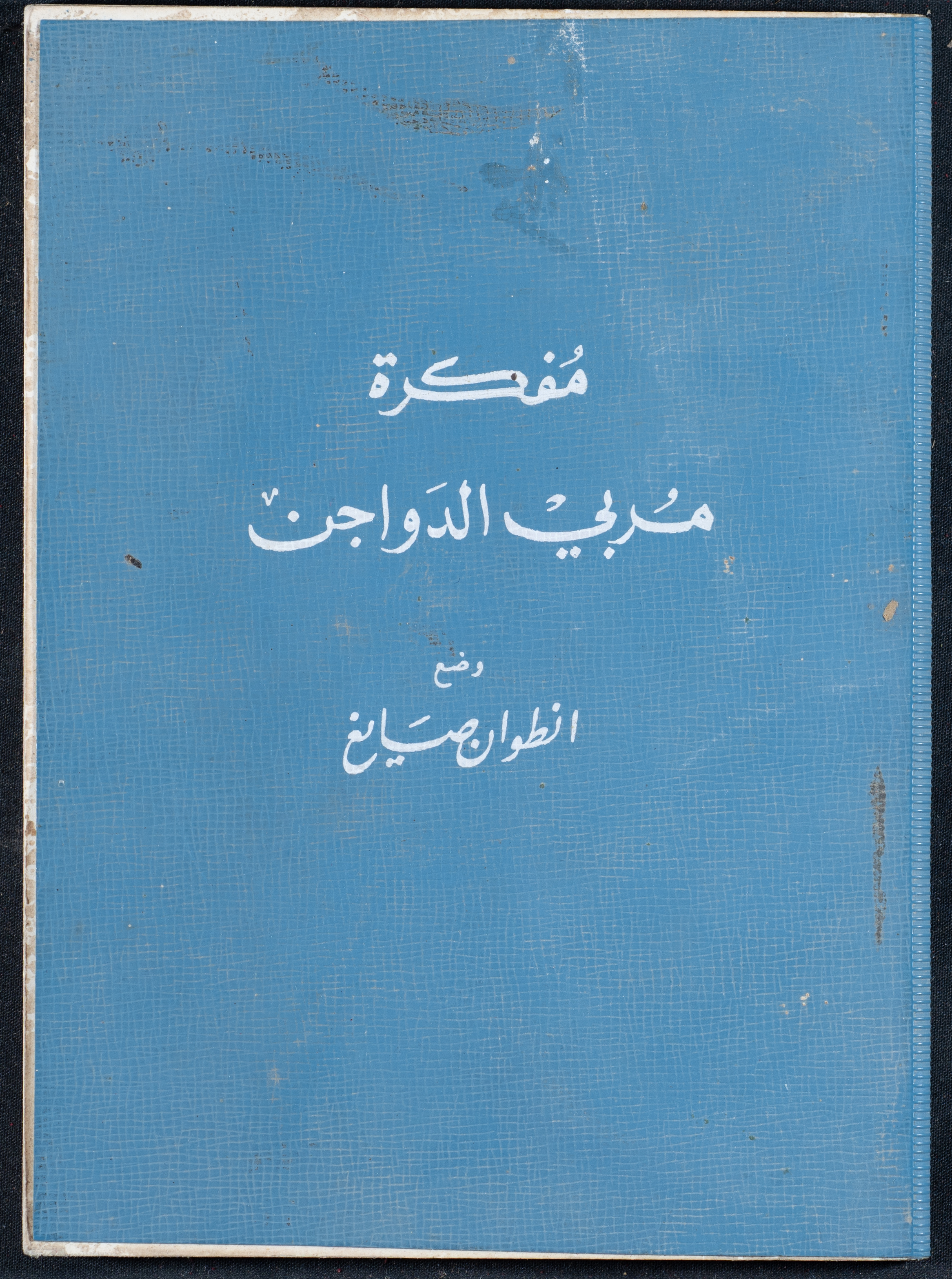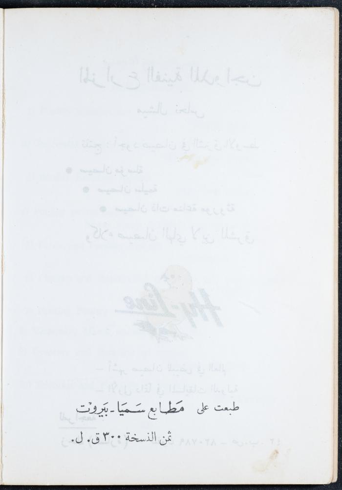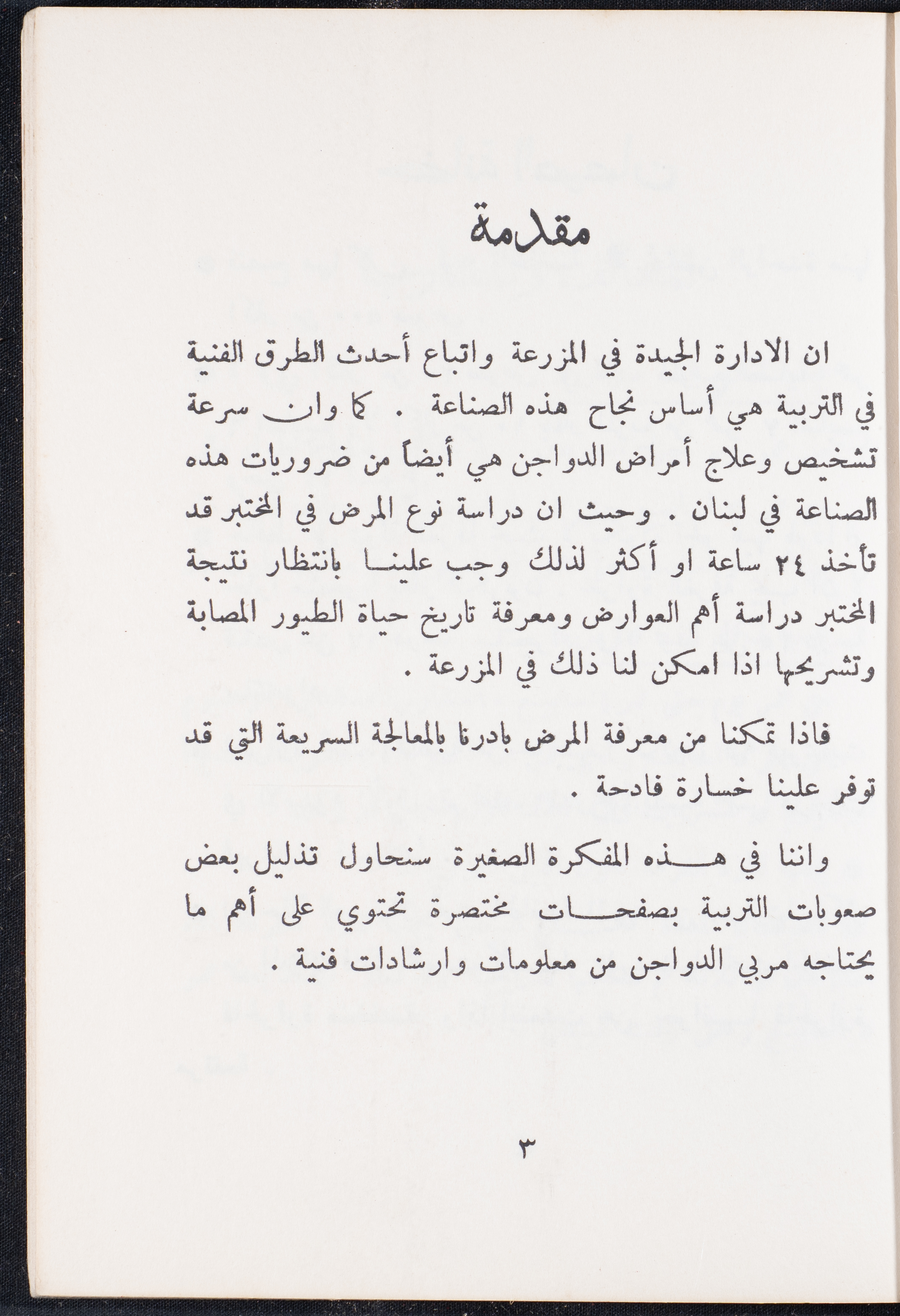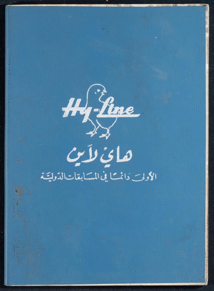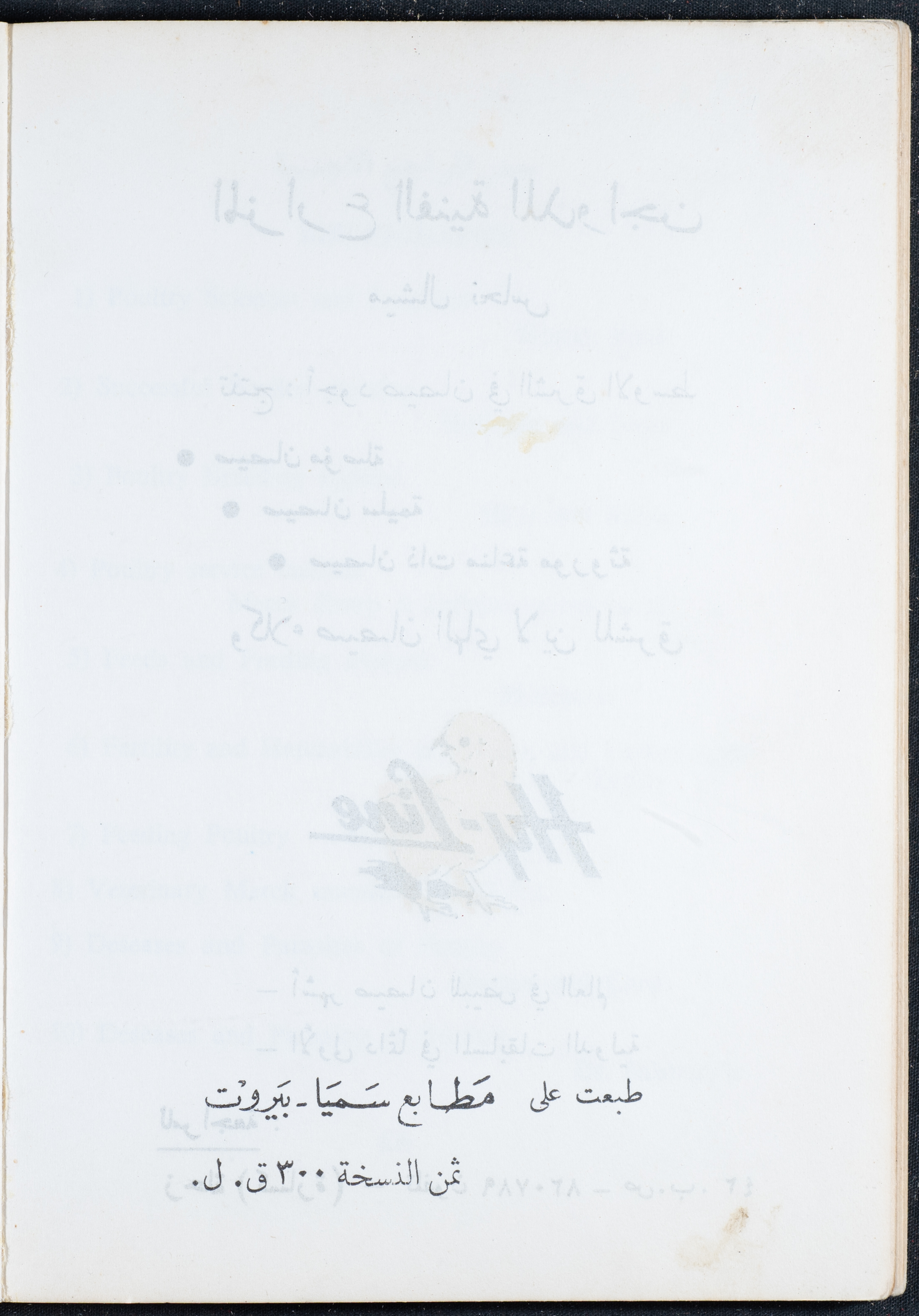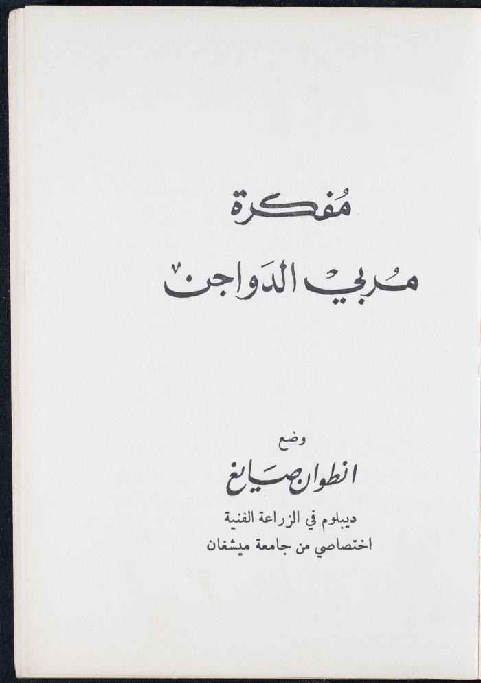 Printed in Arabic and found in the Wajeh Abdel-Baqi Collection; who is the representative of Animal Husbandry in Nablus, this document shows parts of a book titled "Poultry Farmer Agenda" by Antoine Sayegh, issued at Simya Printing Shop in Beirut in 1956, it has topics about poultry farming and guidelines for farmers to help them in poultry breeding.