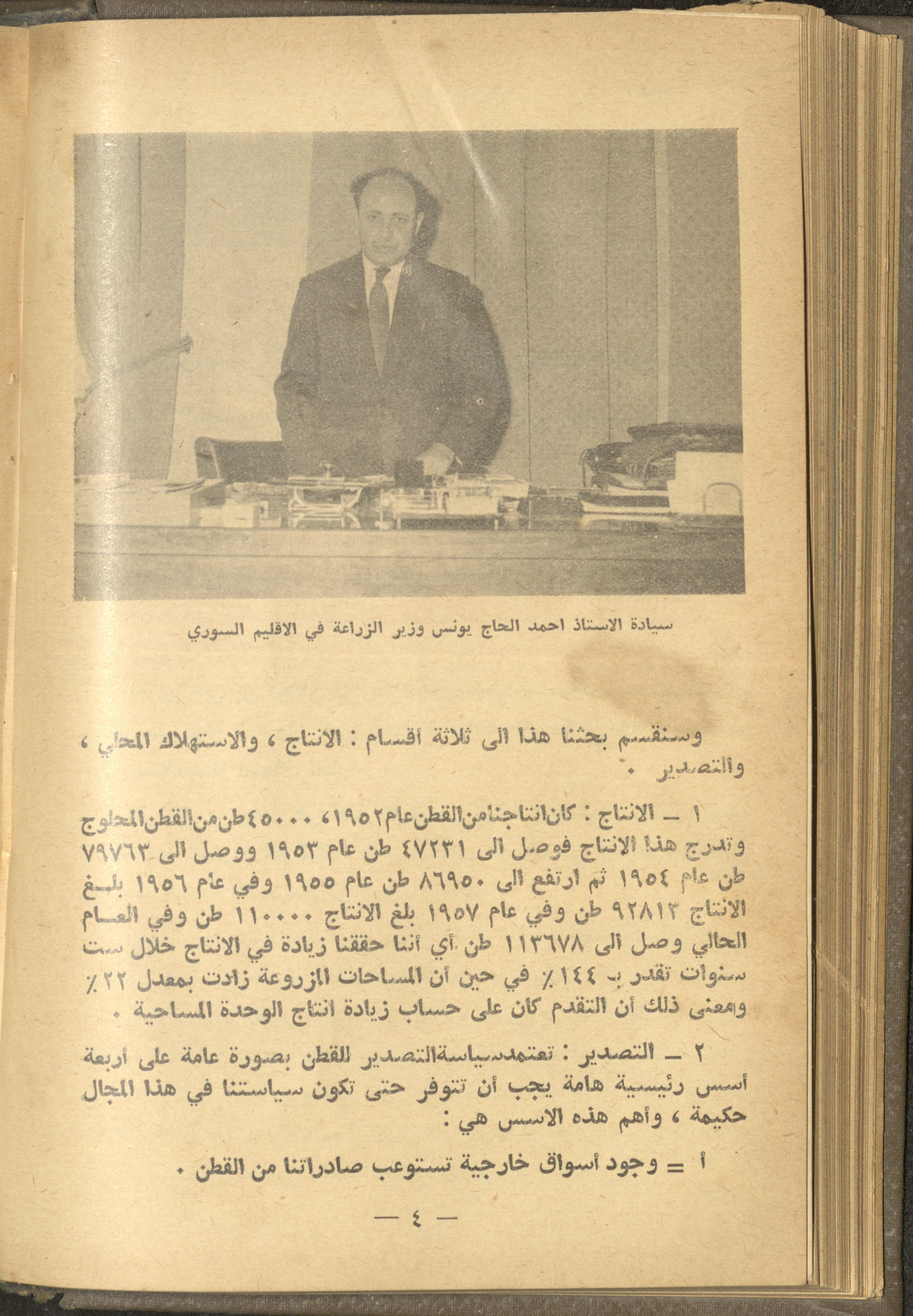 وثيقة مطبوعة باللغة العربية، تتكون من 4 صفحات، وهي جزء من من العدد الخامس عشر من مجلة الإرشاد الزراعي، الصادرة في تشرين الثاني عام 1958، وهي مجلة شهرية مجانية تصدرها دائرة الإرشاد الزراعي في وزارة الزراعة بالإقليم السوري، وتحتوي هذه الجزئية من العدد مقال بعنوان "حقائق وأرقام عن القطن السوري" بقلم أحمد الحاج يونس، وزير الزراعة في الإقليم الشمالي.