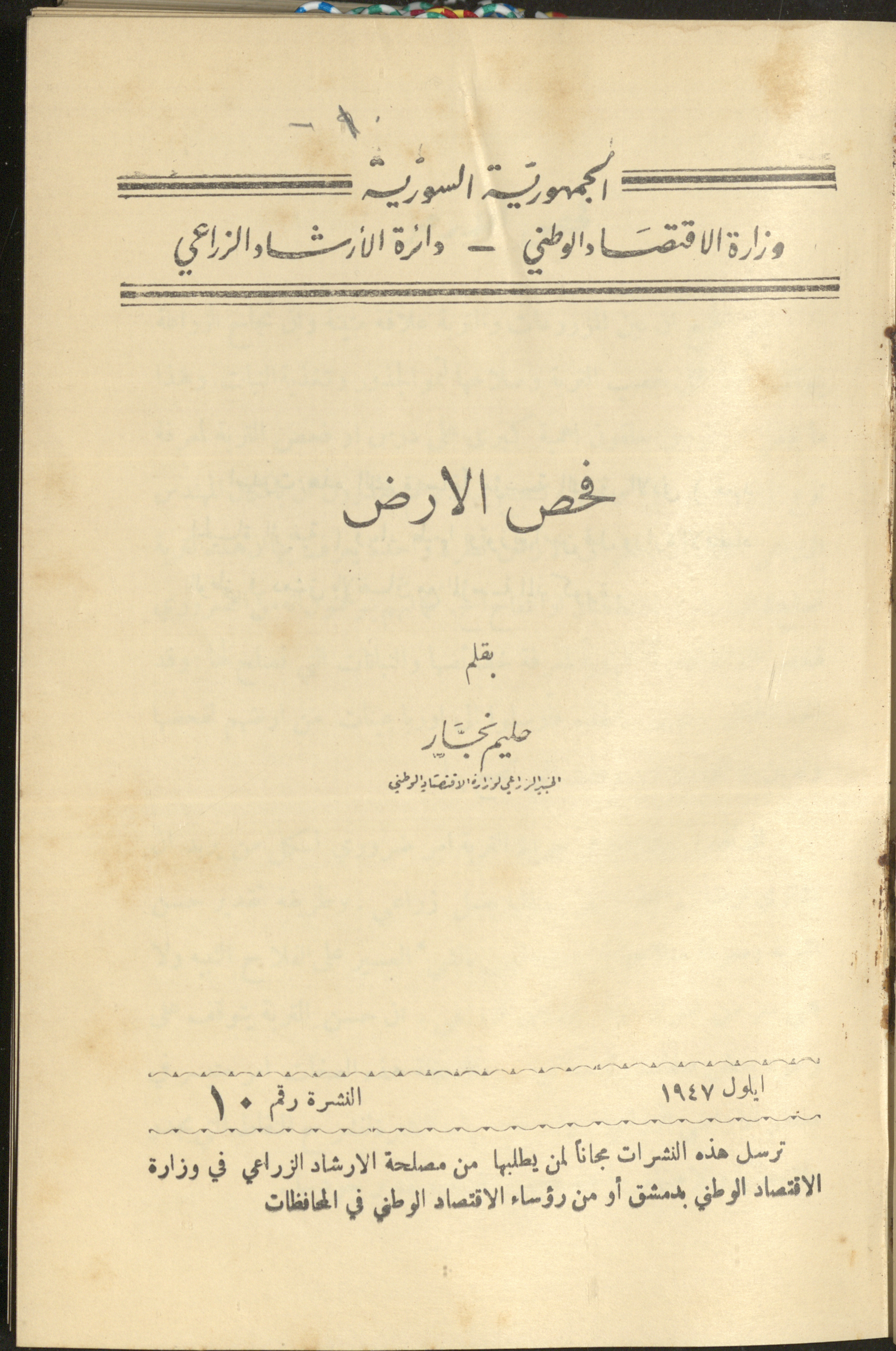 وثيقة مطبوعة باللغة العربية، تتكون من صفحتين، وهي غلاف النشرة العاشرة عن دائرة الإرشاد الزراعي، الصادرة في أيلول عام 1947، وهي نشرة مجانية تصدر عن مصلحة الإرشاد الزراعي في وزارة الاقتصاد الوطني في دمشق، وقد أصدرت هذه النشرة سابقاً مؤسسة الشرق الأدنى "معهد الحياة الريفية" ويعاد طبعها وتوزيعها من قبل وزارة الاقتصاد الوطني في دمشق بالاتفاق مع المؤسسة السابقة الذكر، وتحتوي النشرة على مقال بعنوان "فحص الأرض" بقلم حليم نجار.