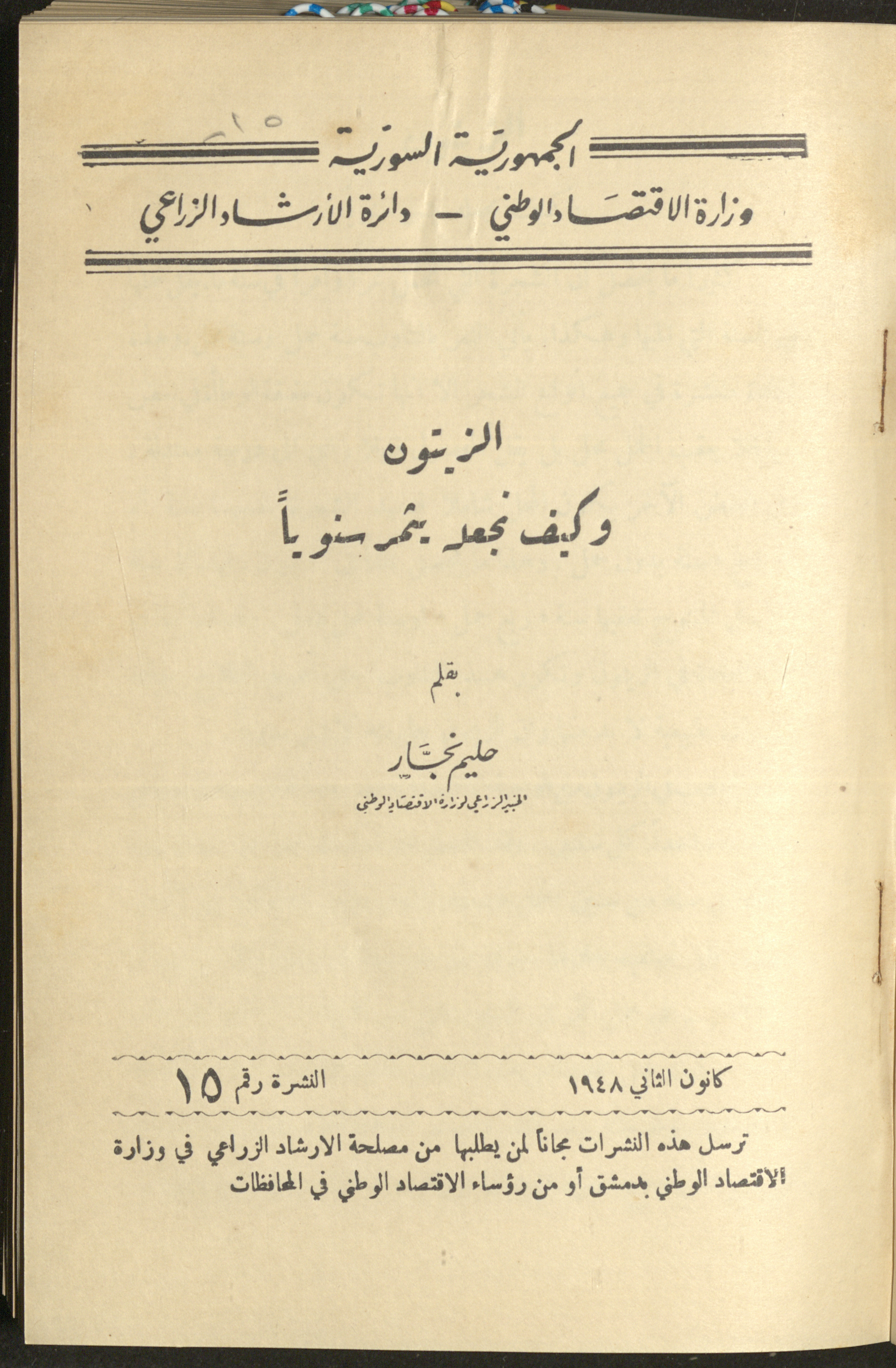 وثيقة مطبوعة باللغة العربية، تتكون من صفحتين، وهي غلاف النشرة الخامسة عشر عن دائرة الإرشاد الزراعي، الصادرة في كانون الثاني عام 1948، وهي نشرة مجانية تصدر عن مصلحة الإرشاد الزراعي في وزارة الاقتصاد الوطني في دمشق، وقد أصدرت هذه النشرة سابقاً مؤسسة الشرق الأدنى "معهد الحياة الريفية" ويعاد طبعها وتوزيعها من قبل وزارة الاقتصاد الوطني في دمشق بالاتفاق مع المؤسسة السابقة الذكر، وتحتوي النشرة على مقال بعنوان "الزيتون وكيف نجعله يثمر سنوياً" بقلم حليم نجار.