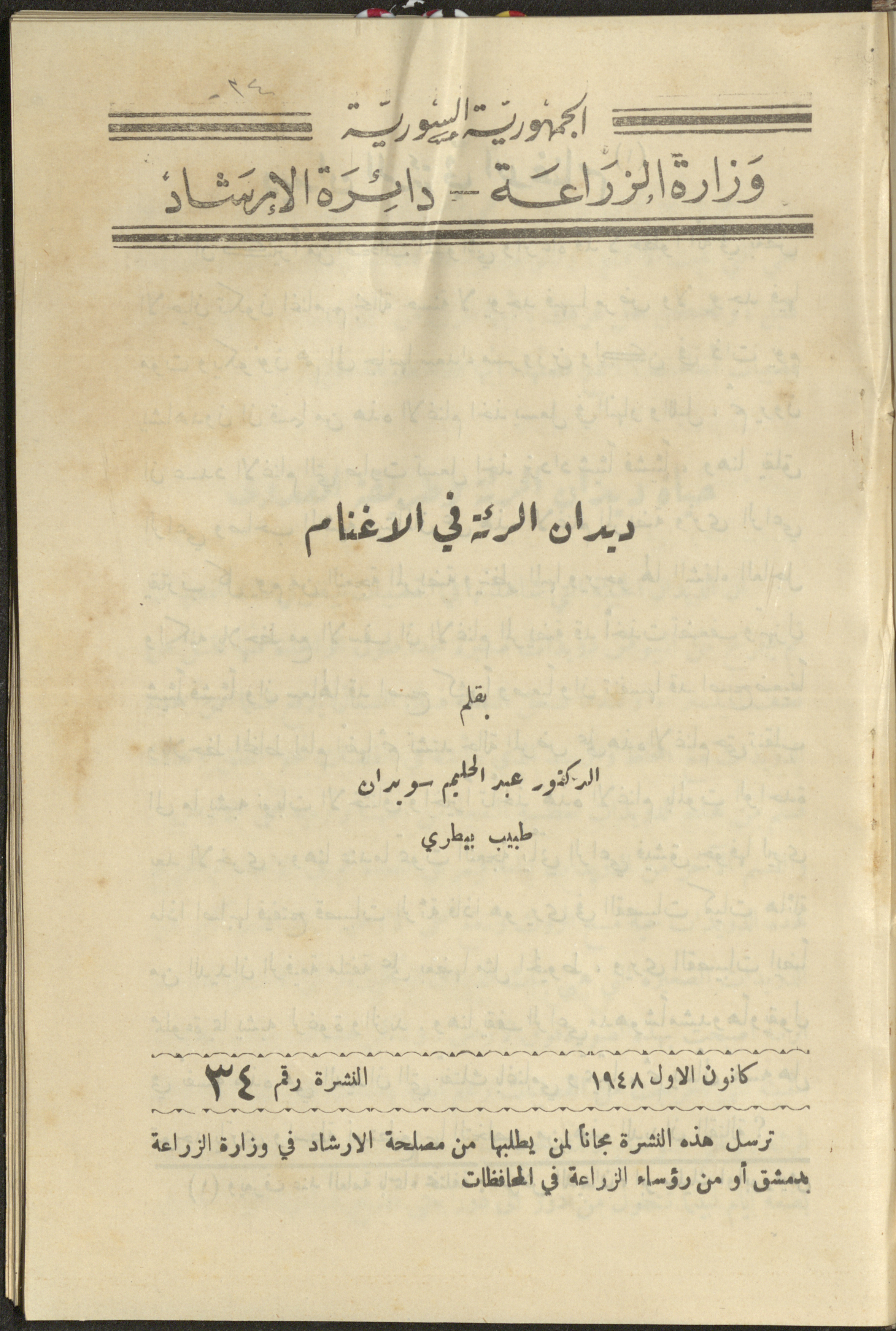 وثيقة مطبوعة باللغة العربية، تتكون من صفحتين، وهي غلاف النشرة الرابعة والثلاثين عن دائرة الإرشاد الزراعي، الصادرة في كانون الأول عام 1948، وهي نشرة مجانية تصدر عن مصلحة الإرشاد الزراعي في وزارة الاقتصاد الوطني في دمشق، وقد أصدرت هذه النشرة سابقاً مؤسسة الشرق الأدنى "معهد الحياة الريفية" ويعاد طبعها وتوزيعها من قبل وزارة الاقتصاد الوطني في دمشق بالاتفاق مع المؤسسة سابقة الذكر، وتحتوي النشرة على مقال بعنوان "ديدان الريّ في الأغنام" بقلم عبد الحليم سويدان.