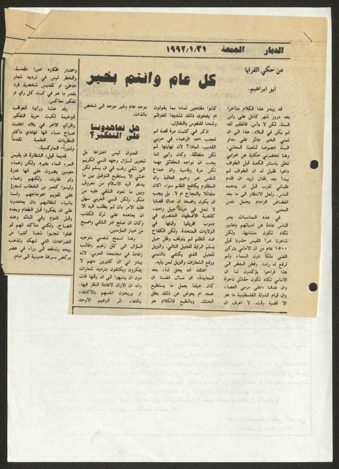 قصاصة من صحيفة الديار صادرة في تاريخ 21 كانون الثاني 1992 تحتوي على مقال لحنا إبراهيم بعنوان "من حكي القرايا".