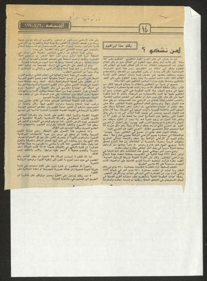 قصاصة من مجلة نداء الأسوار صادرة في تاريخ 20 تموز 1990 تحتوي على مقال لحنا إبراهيم بعنوان "لمن نشكو؟".