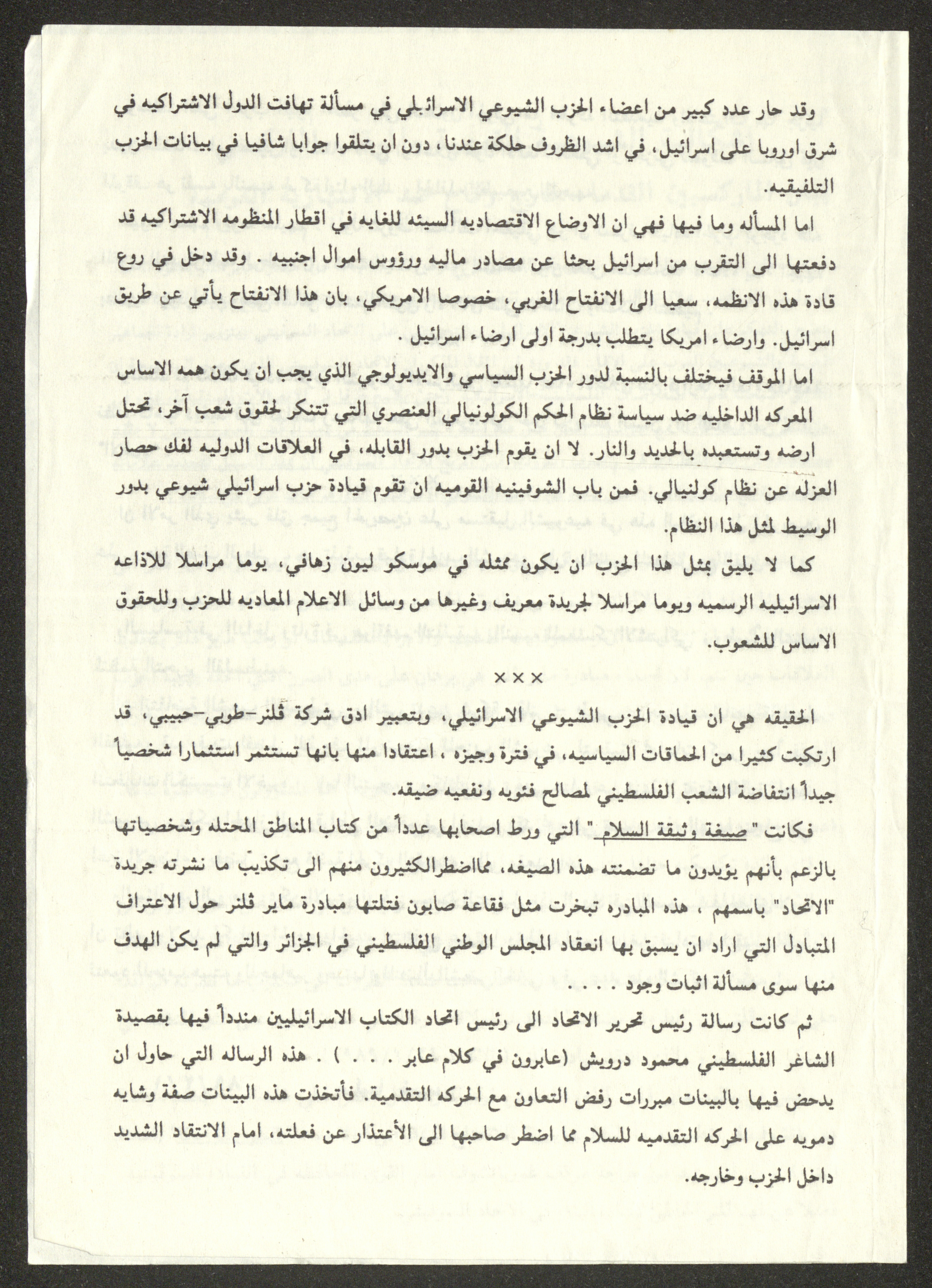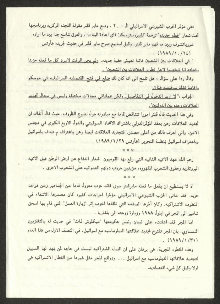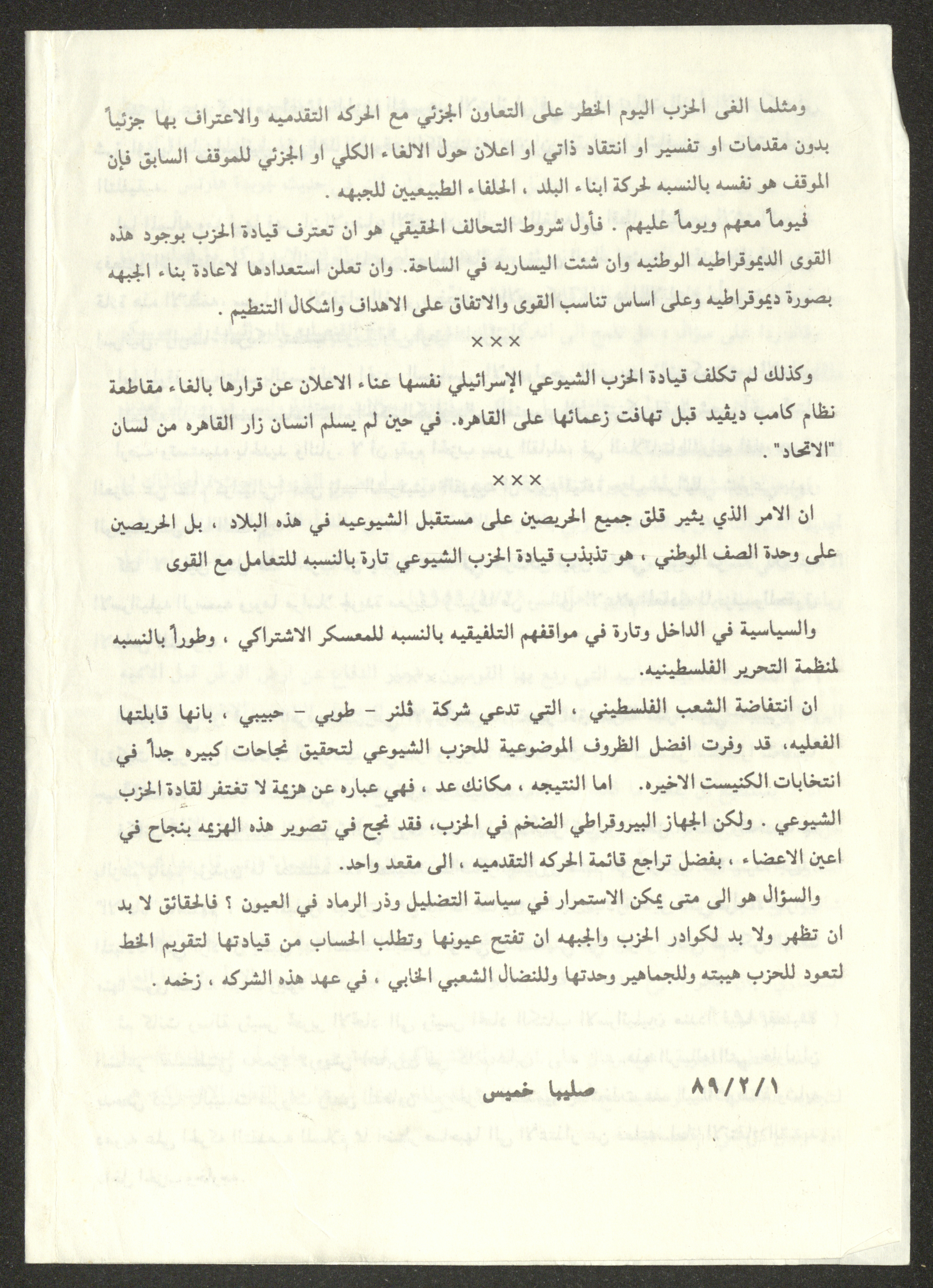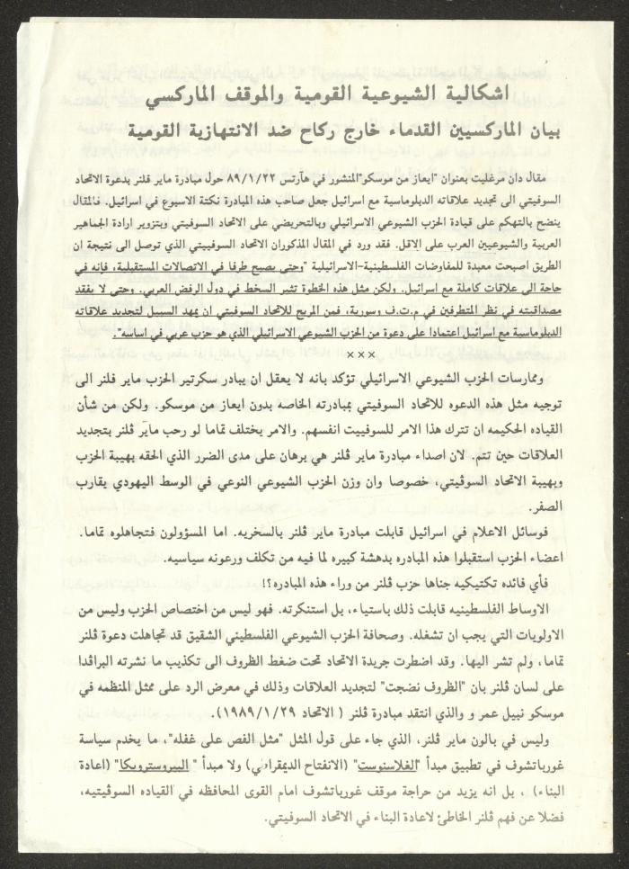 توثق هذه المادة الأرشيفية مقالًا صدر بتاريخ 1 شباط 1989 لصليبا حنا خميس بعنوان "إشكالية الشيوعية القومية والموقف الماركسي، بيان الماركسيين القدماء خارج ركاح ضد الانتهازية القومية".