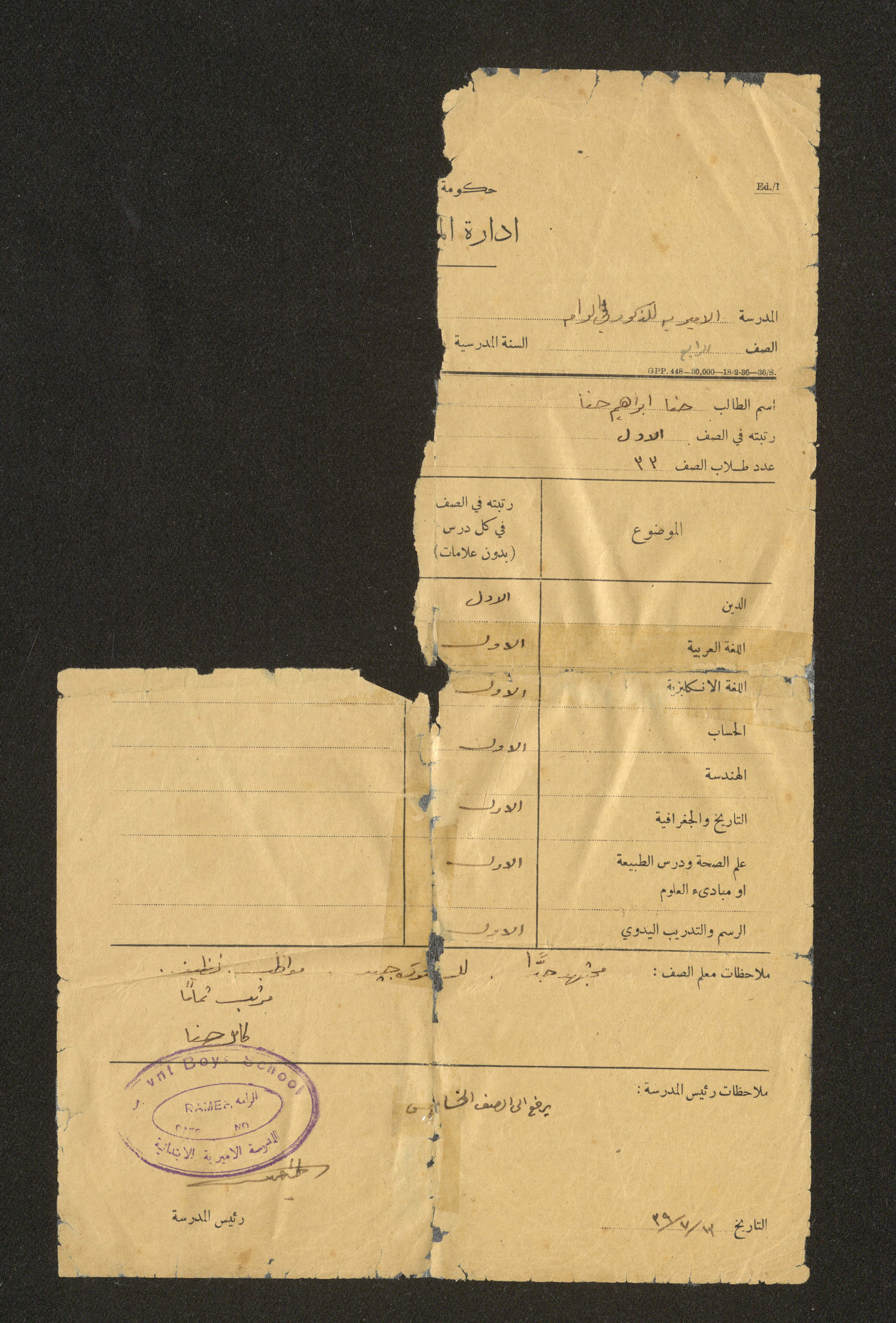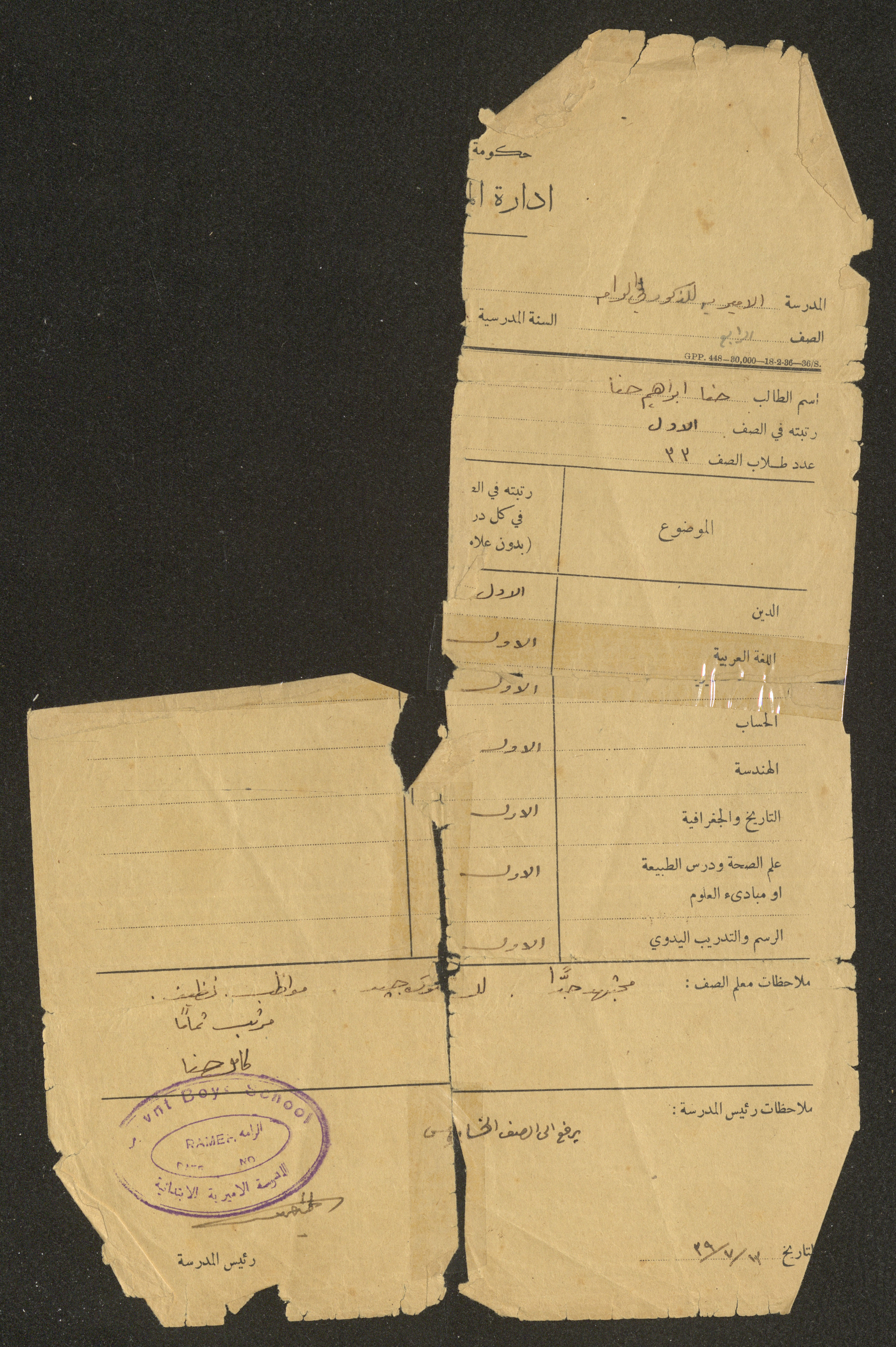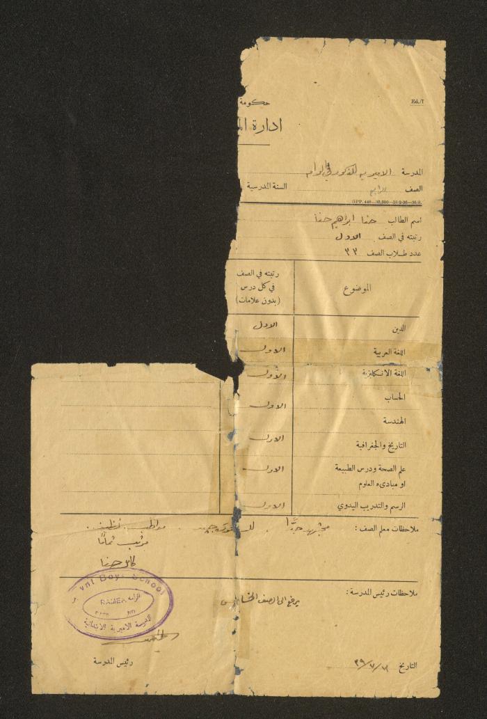 شهادة الصف الرابع لحنا إبراهيم صادرة عن المدرسة الاميرية الابتدائية التابعة لإدارة المعارف بتاريخ 14 تموز 1939.