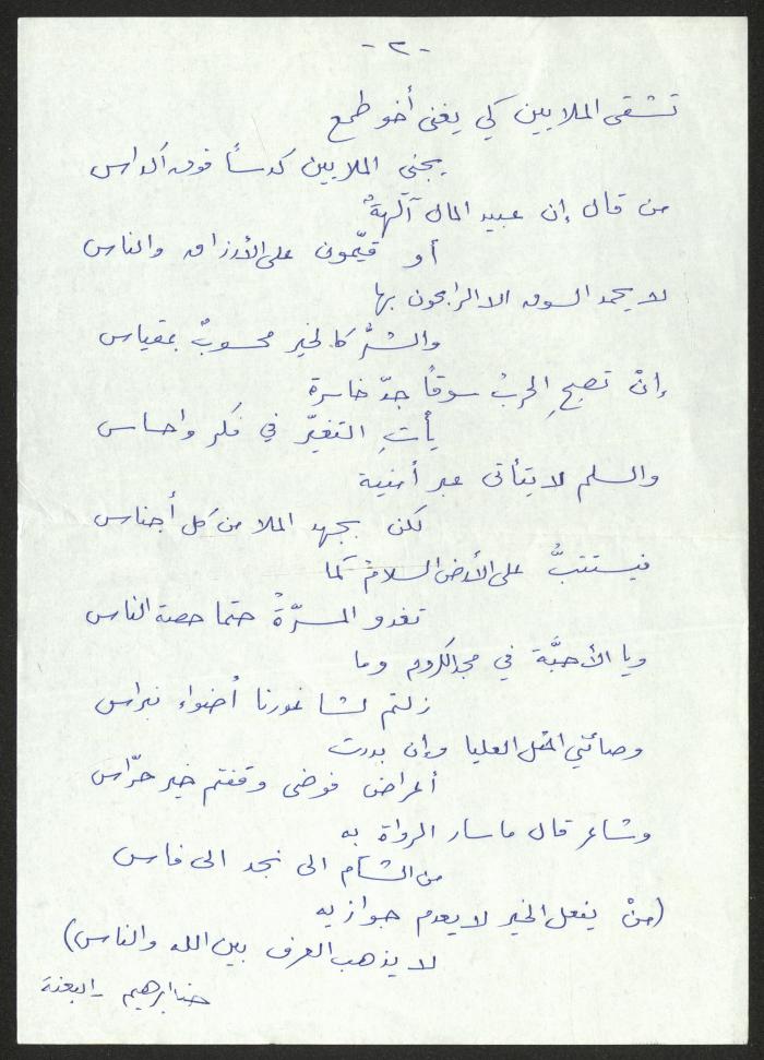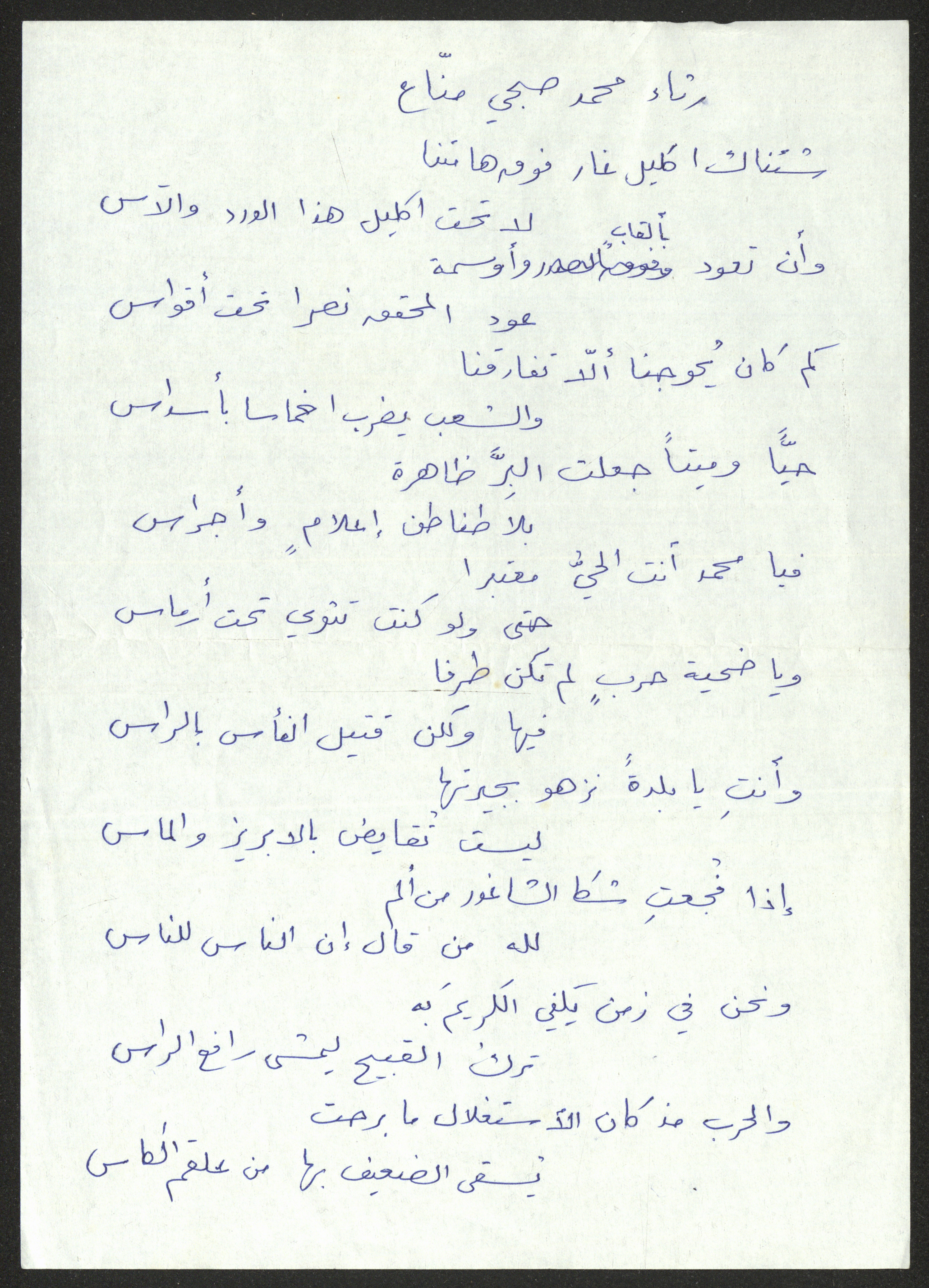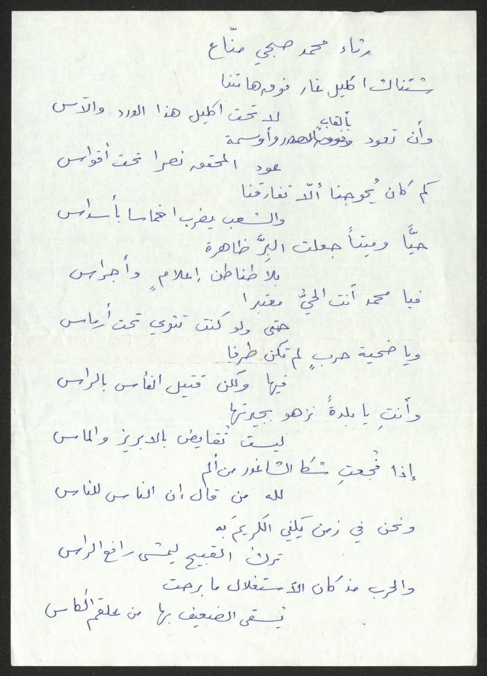 توثق هذه المادة المكتوبة بخط اليد رثاء لحنا إبراهيم كتبه لمحمد صبحي مناع.