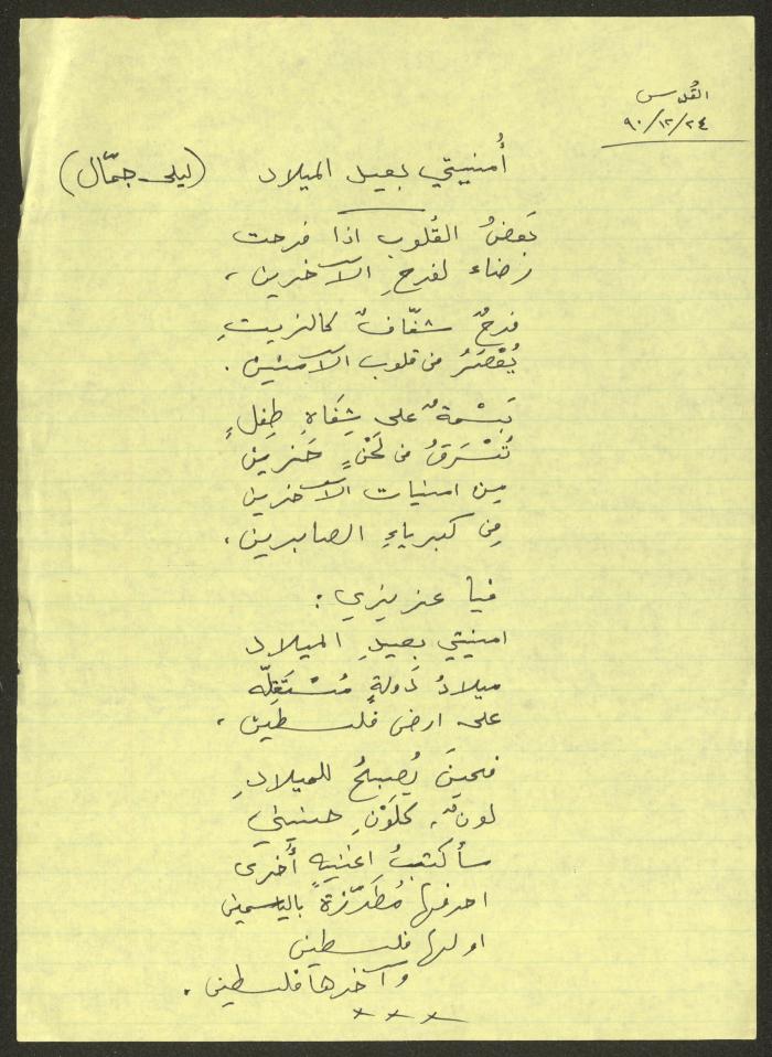 Handwritten on 24 December 1990, this document shows a poem by Laila Jamal titled "Omneyati Bi Eid al-Milad (My Wish for Christmas)".