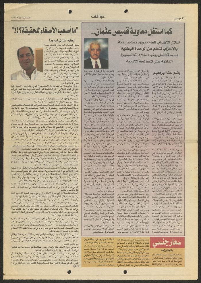 قصاصة من جريدة الأهالي صادرة في تاريخ 1 نيسان 2004 تحتوي على مقال لحنا إبراهيم بعنوان "كما استغل معاوية قميص عثمان..".