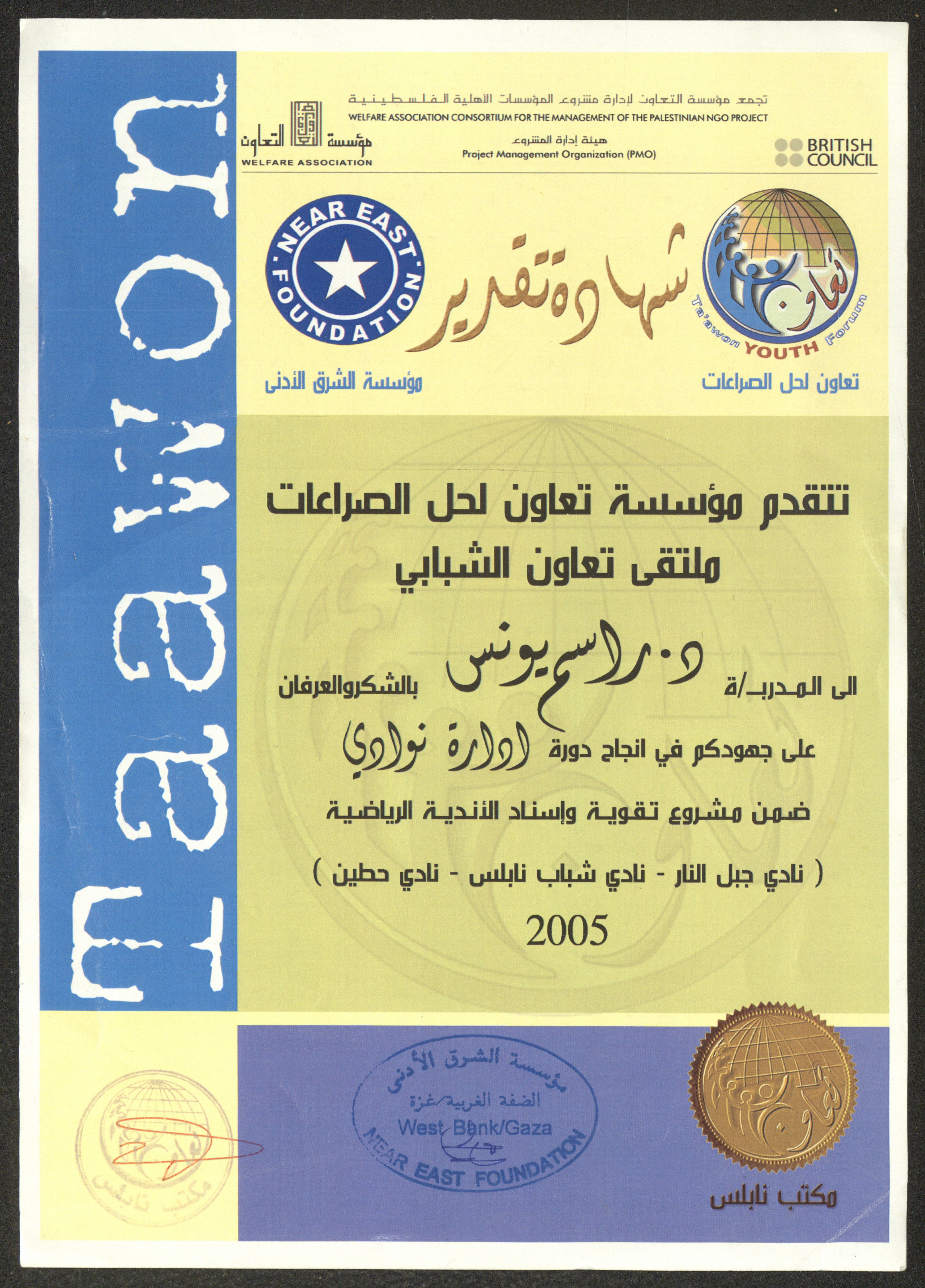 "A Certificate of Appreciation" from the Welfare Association to Rasim Yunis, Nablus, 2005