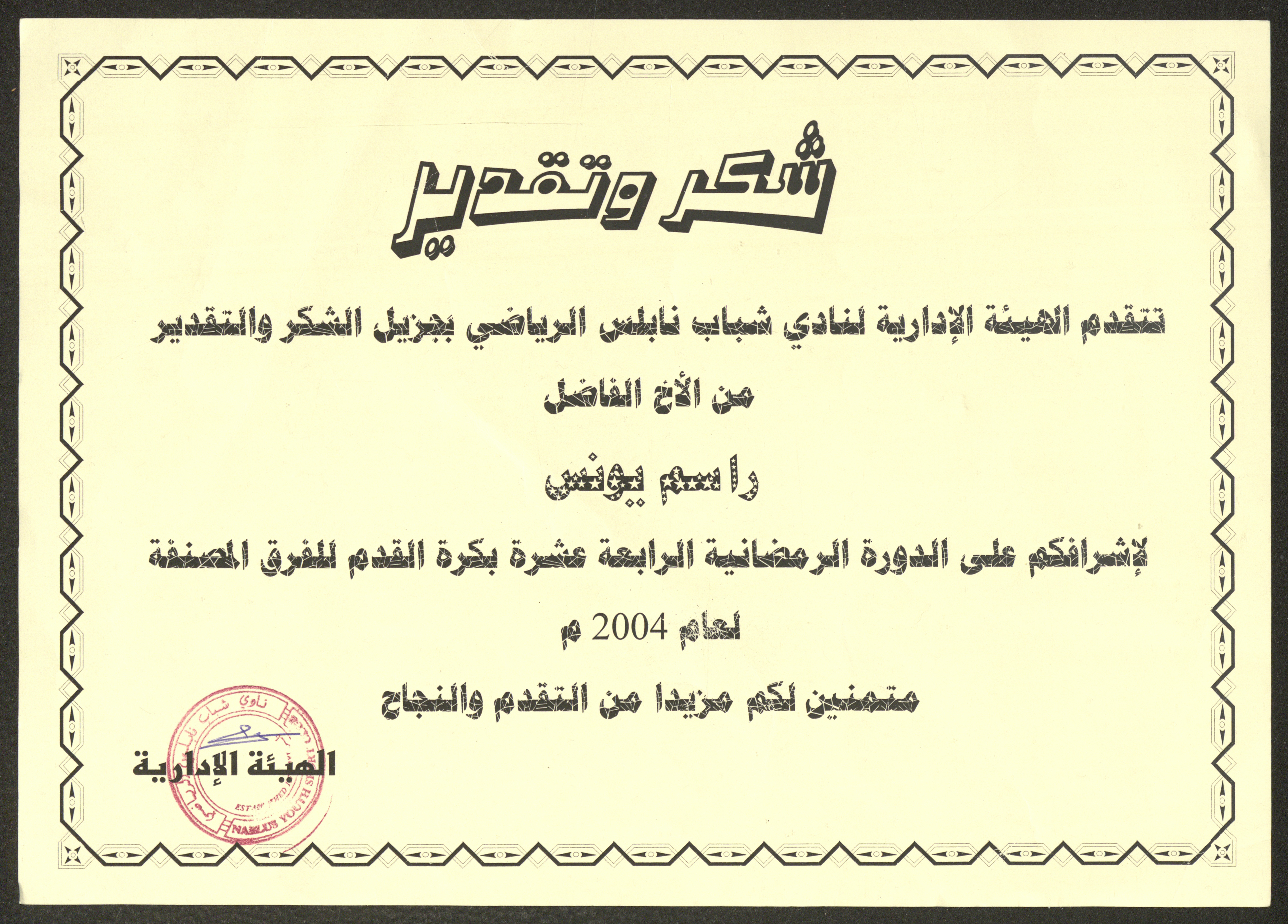 "An Appreciation Certificate" from the Nablus Sports Youth Club to Rasim Yunis, Nablus, 2004