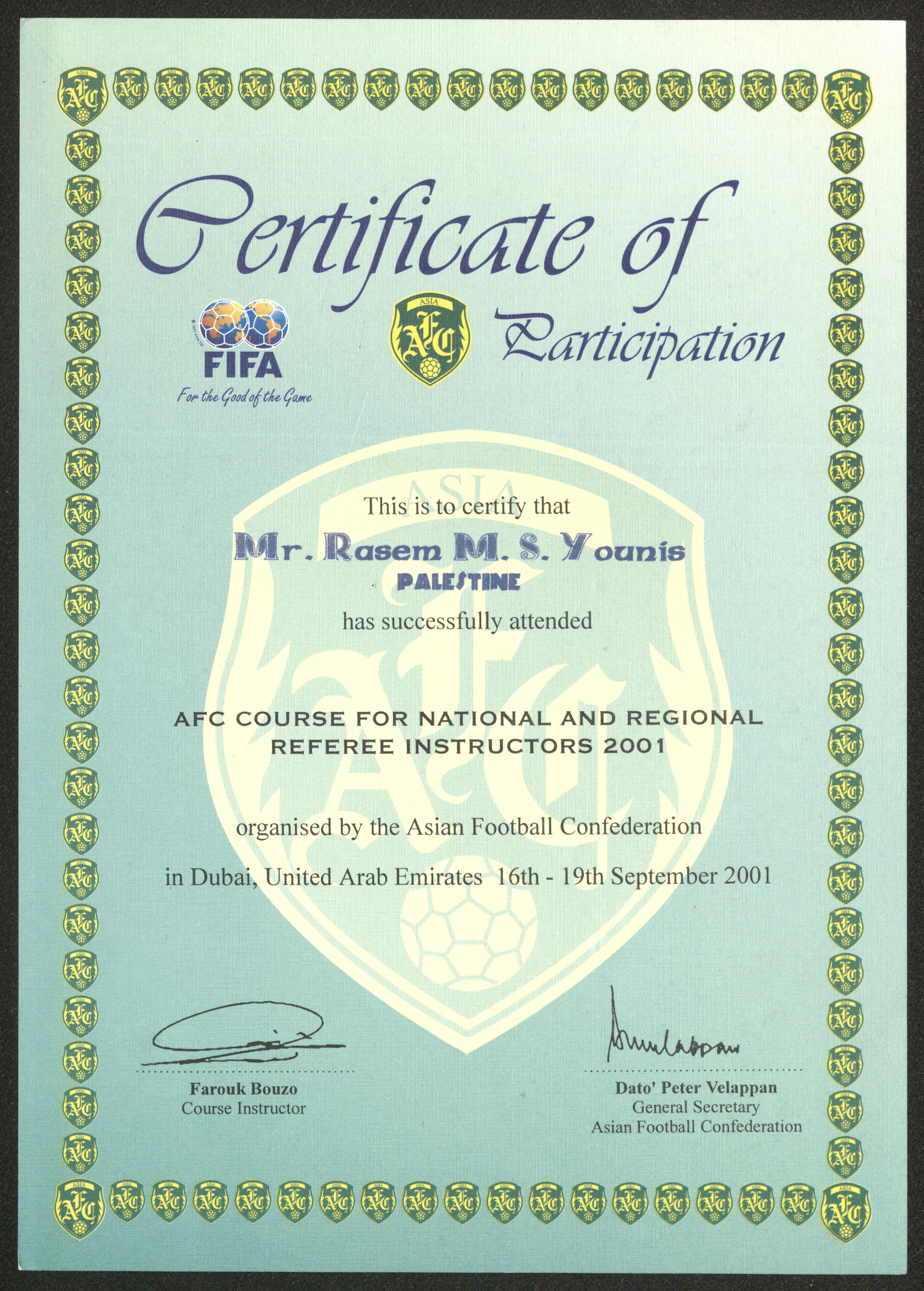 A Certificate from the Asian Football Confederation to Rasim Yunis, Dubai, September 2001