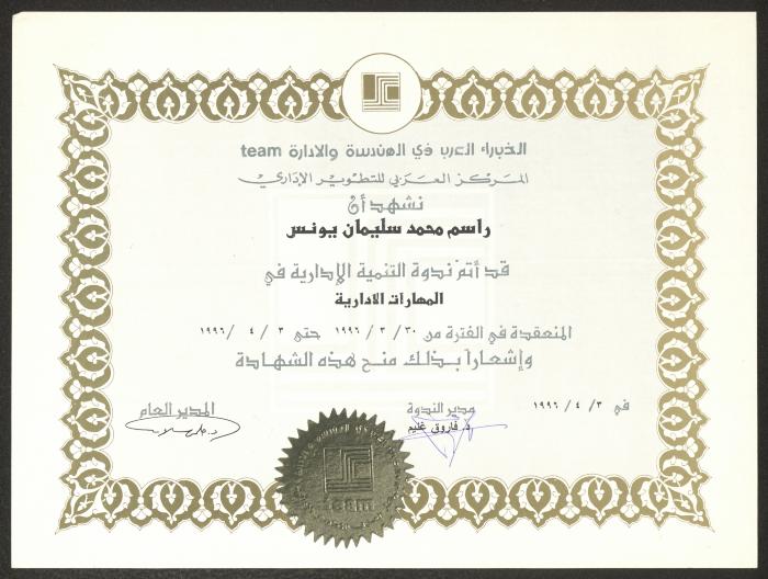 "An Appreciation Certificate" from the Arab Center for Administrative Development to Rasim Yunis, Nablus, 3 April 1996