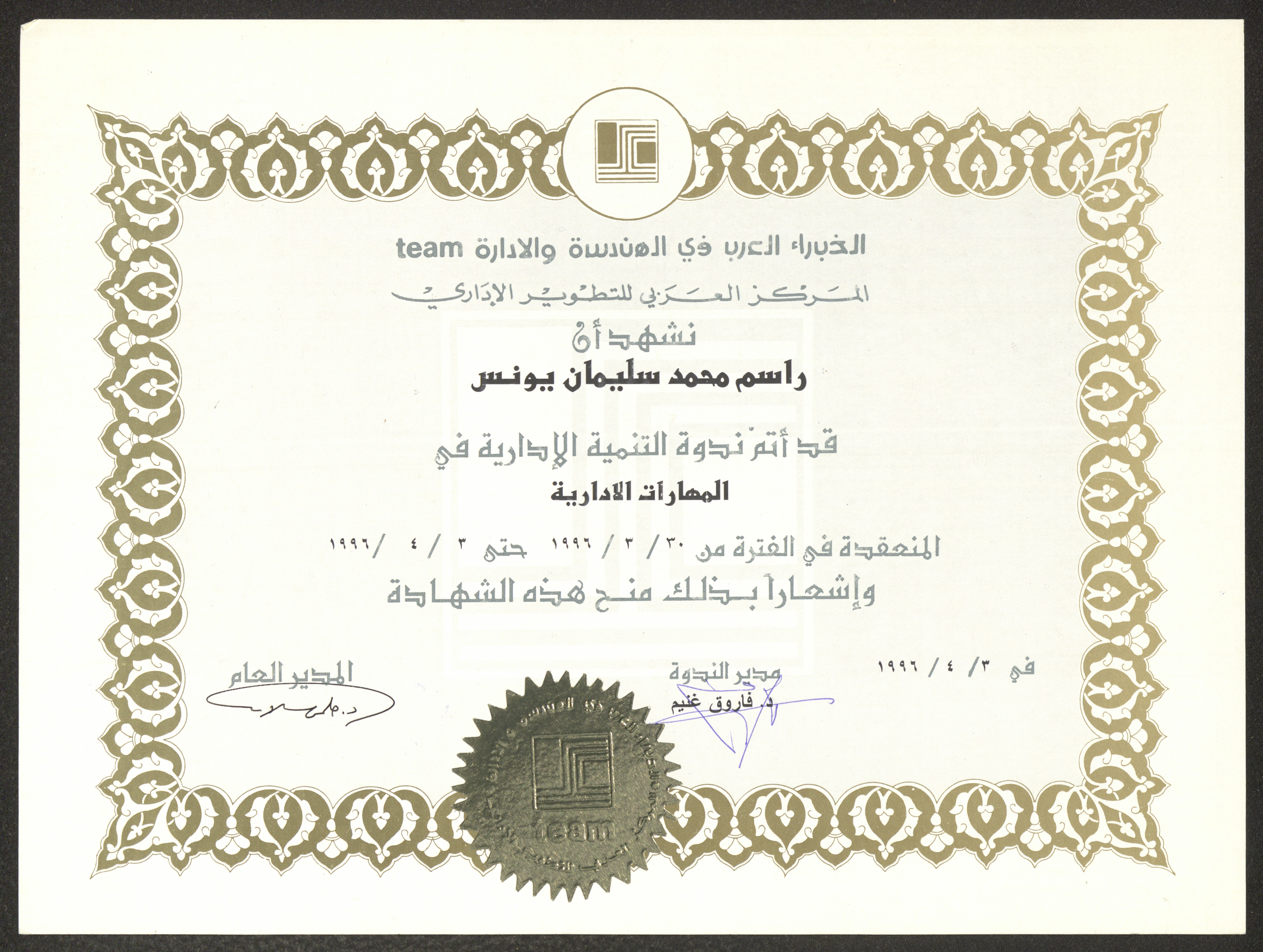 Issued by the Arab Center for Administrative Development on 3 April 1996, this document shows an appreciation certificate for Rasim Yunis after he finished the administrative development seminar in administrative skills.