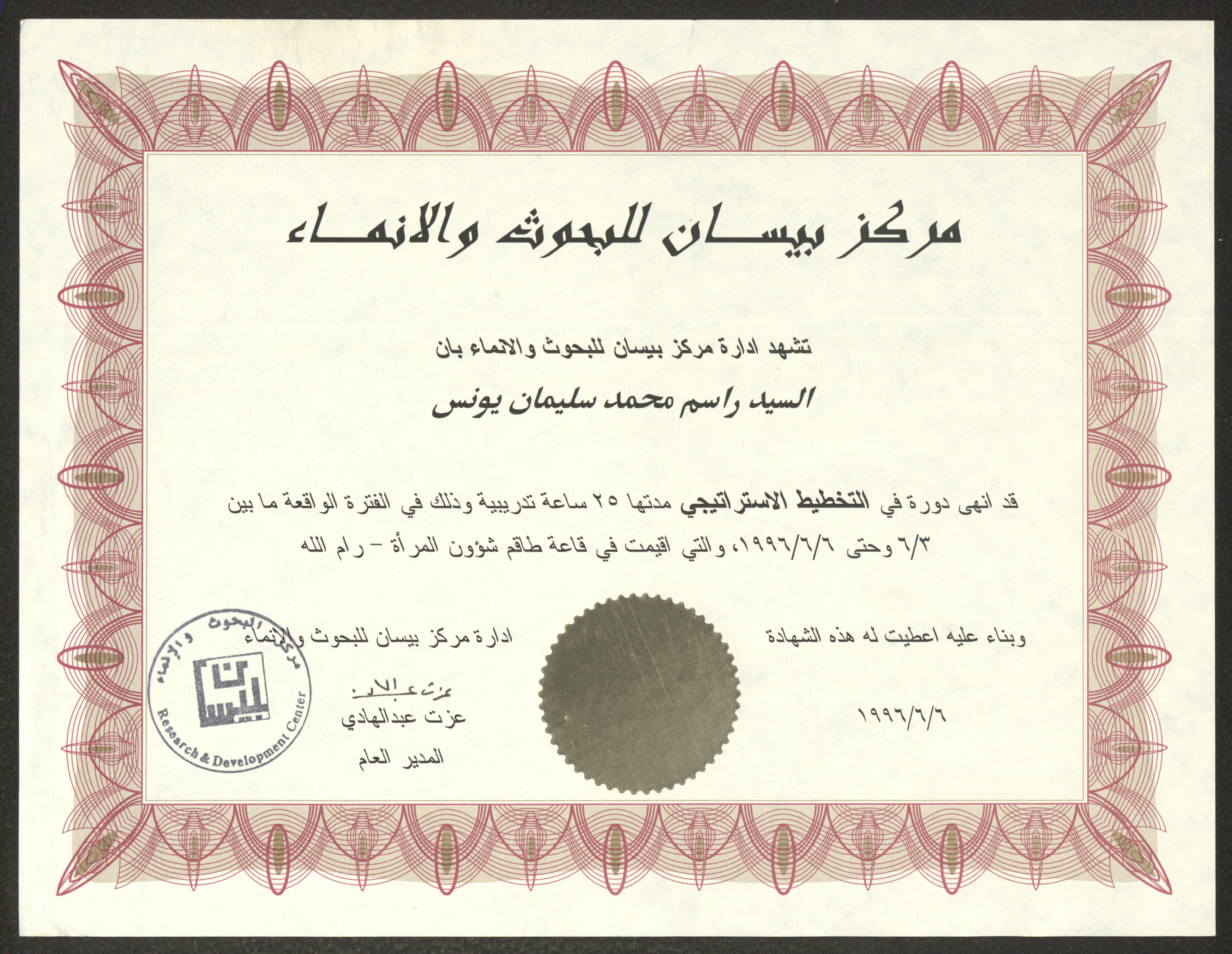 Issued by the Bisan Center for Research and Development on 6 June 1996, this document shows an appreciation certificate for Rasim Yunis after he finished a 25-hour strategic planning course.