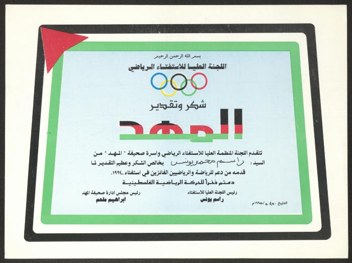 Issued by al-Mahd Newspaper and the Higher Committee for Sports Referendum on 25 May 1995, this document shows an appreciation certificate for Rasim Yunis, thanking him for his continuous support of the sports movement in Palestine.
