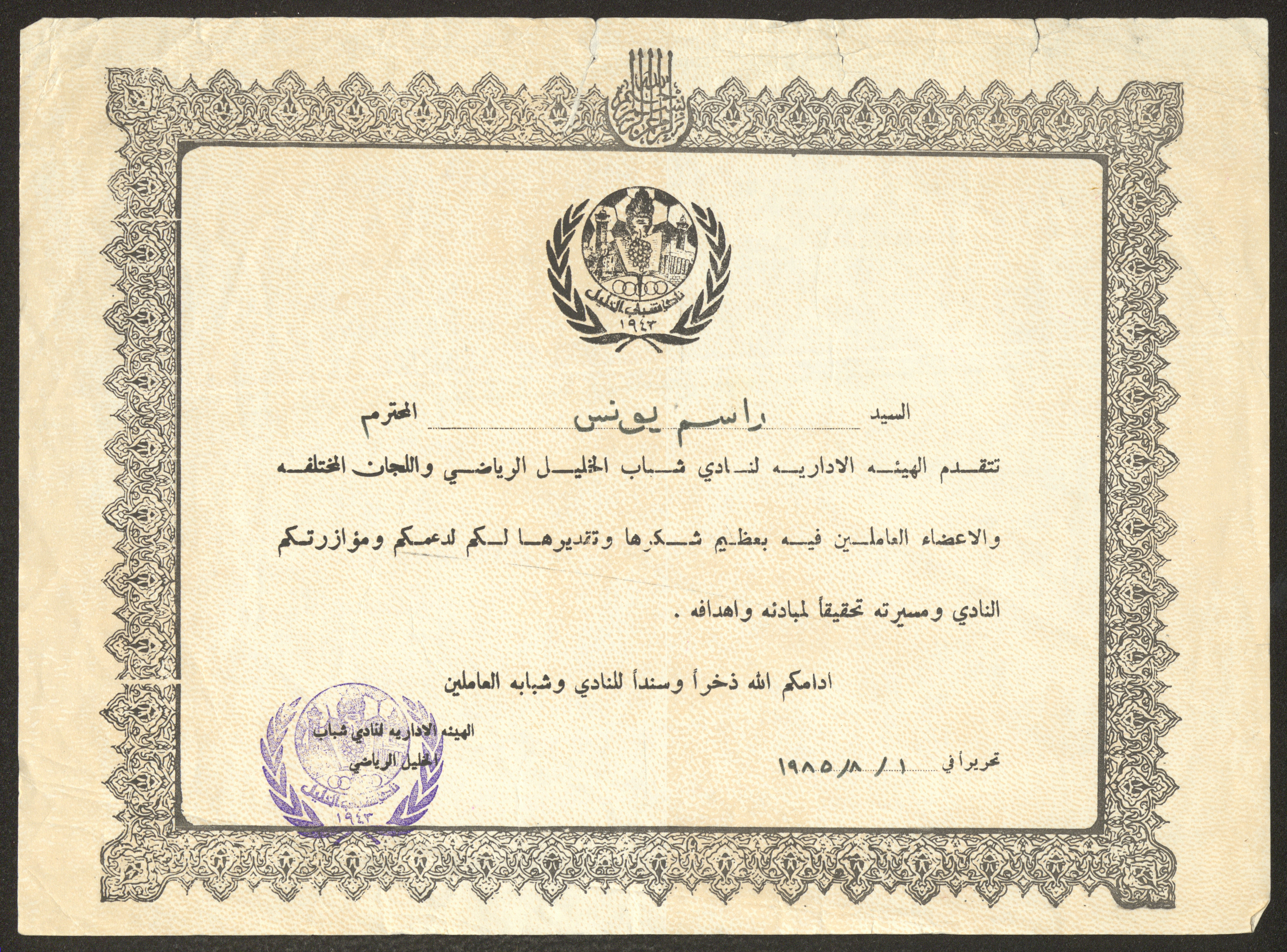 "An Appreciation Certificate" from the Shabab al-Khalil Sports Club to Rasim Yunis, Hebron, 1 August 1985