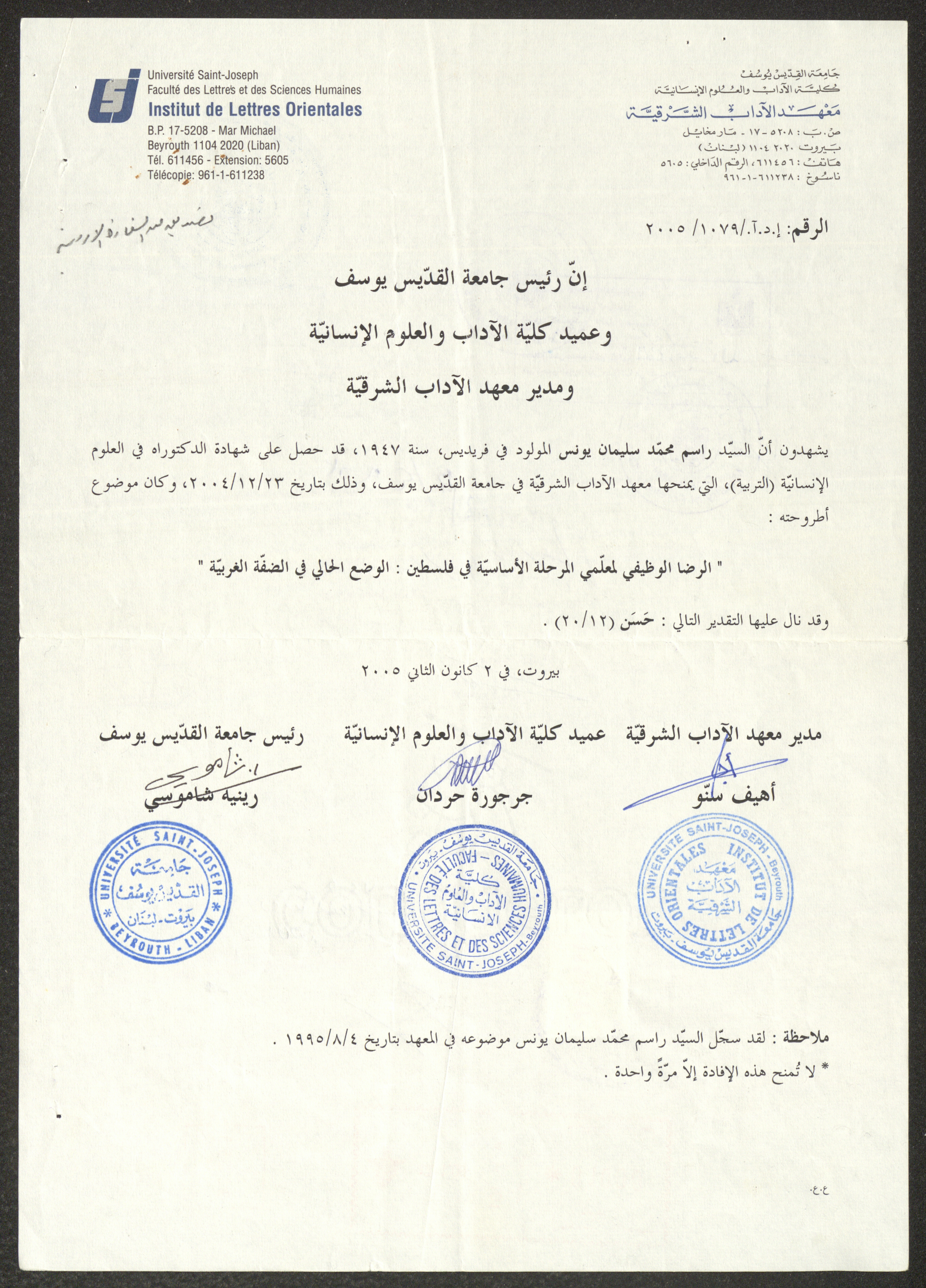 This document shows a letter addressed by Saint Joseph University of Beirut to whom it may concern on 2 January 2005, where it acknowledges that Rasim Yunis has completed his studies there and obtained a doctorate in Human Science- education. Signed by the Director of the Institute of Oriental Arts, the Dean of the Faculty of Arts, and the President of the University.