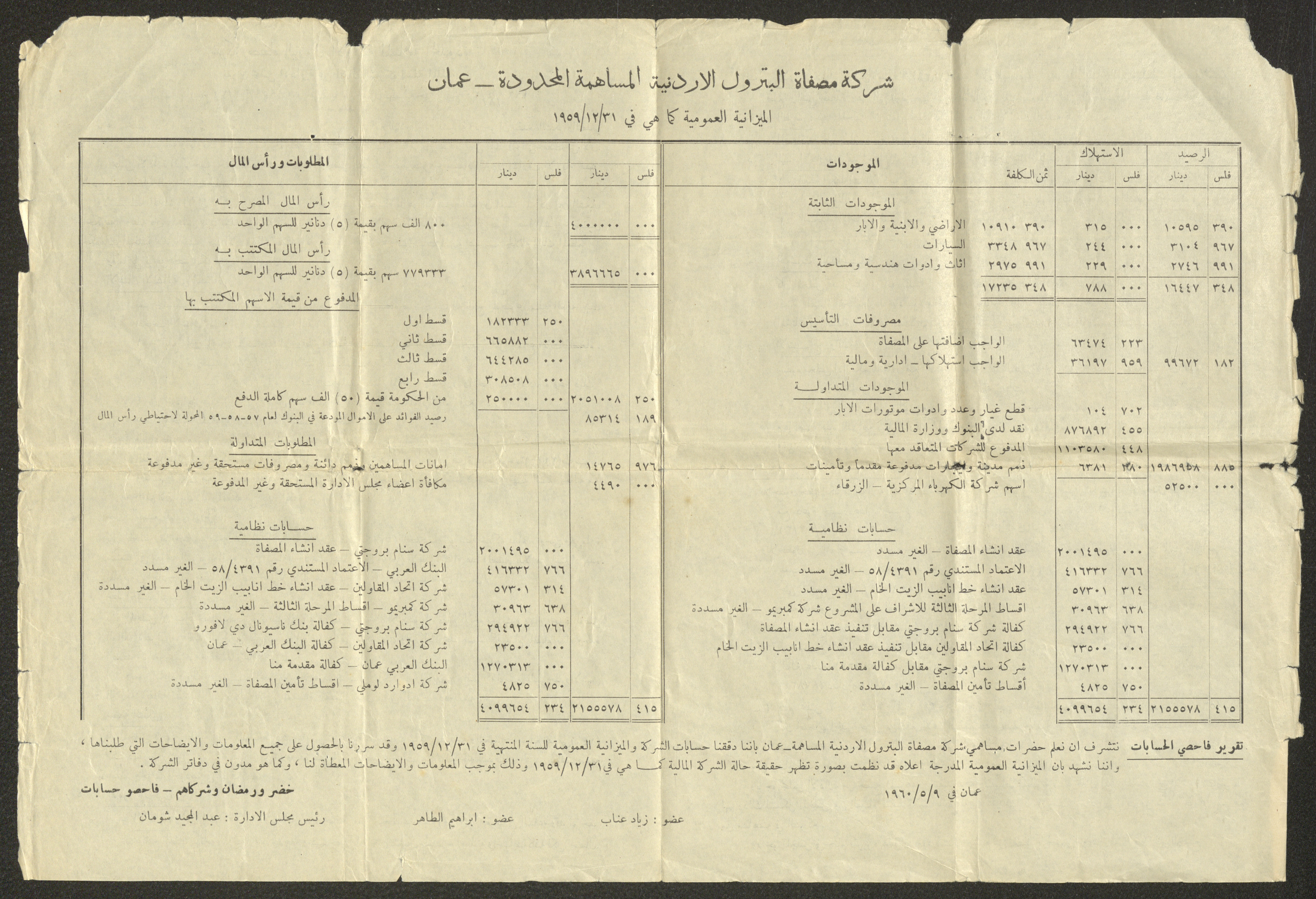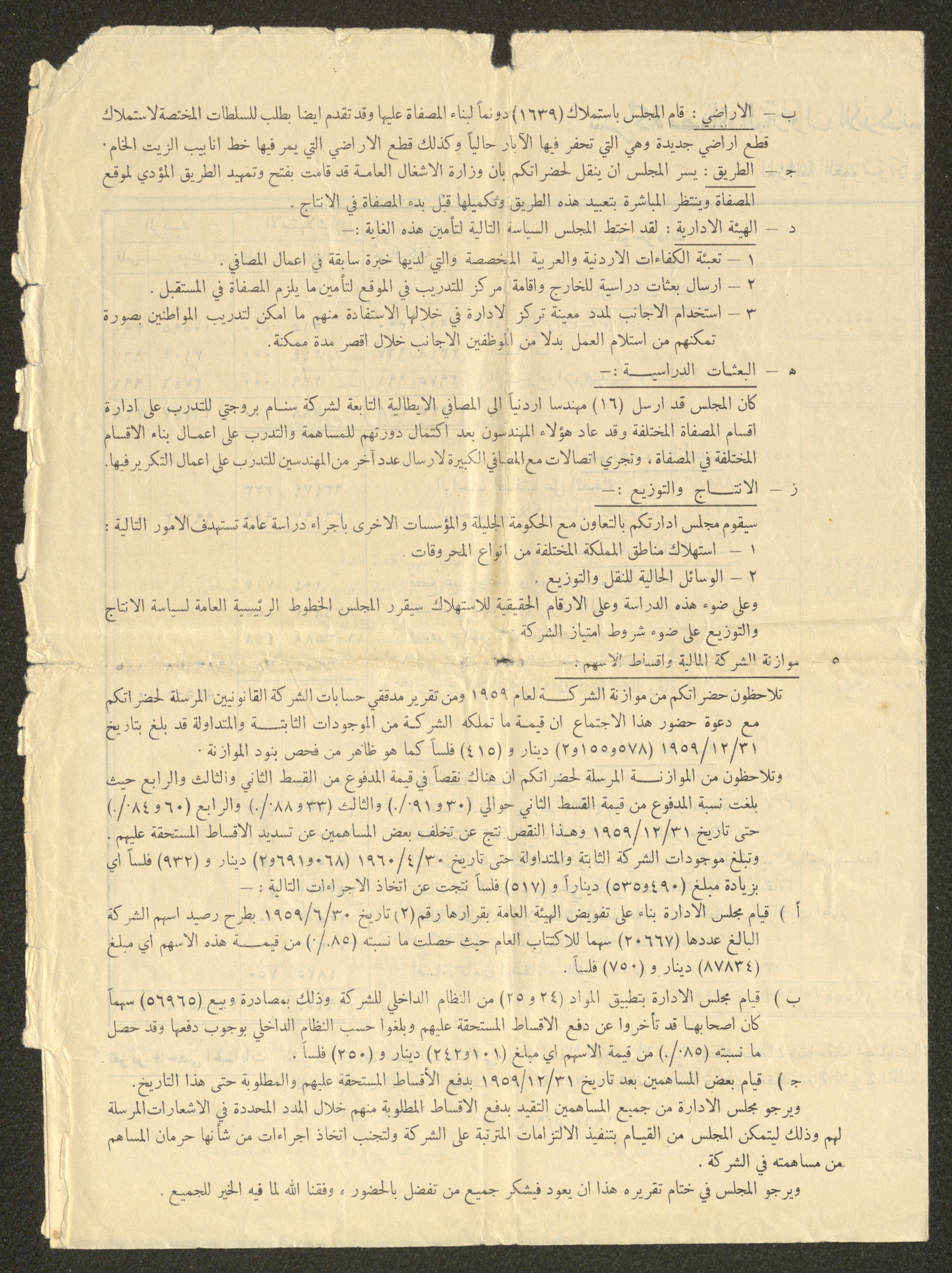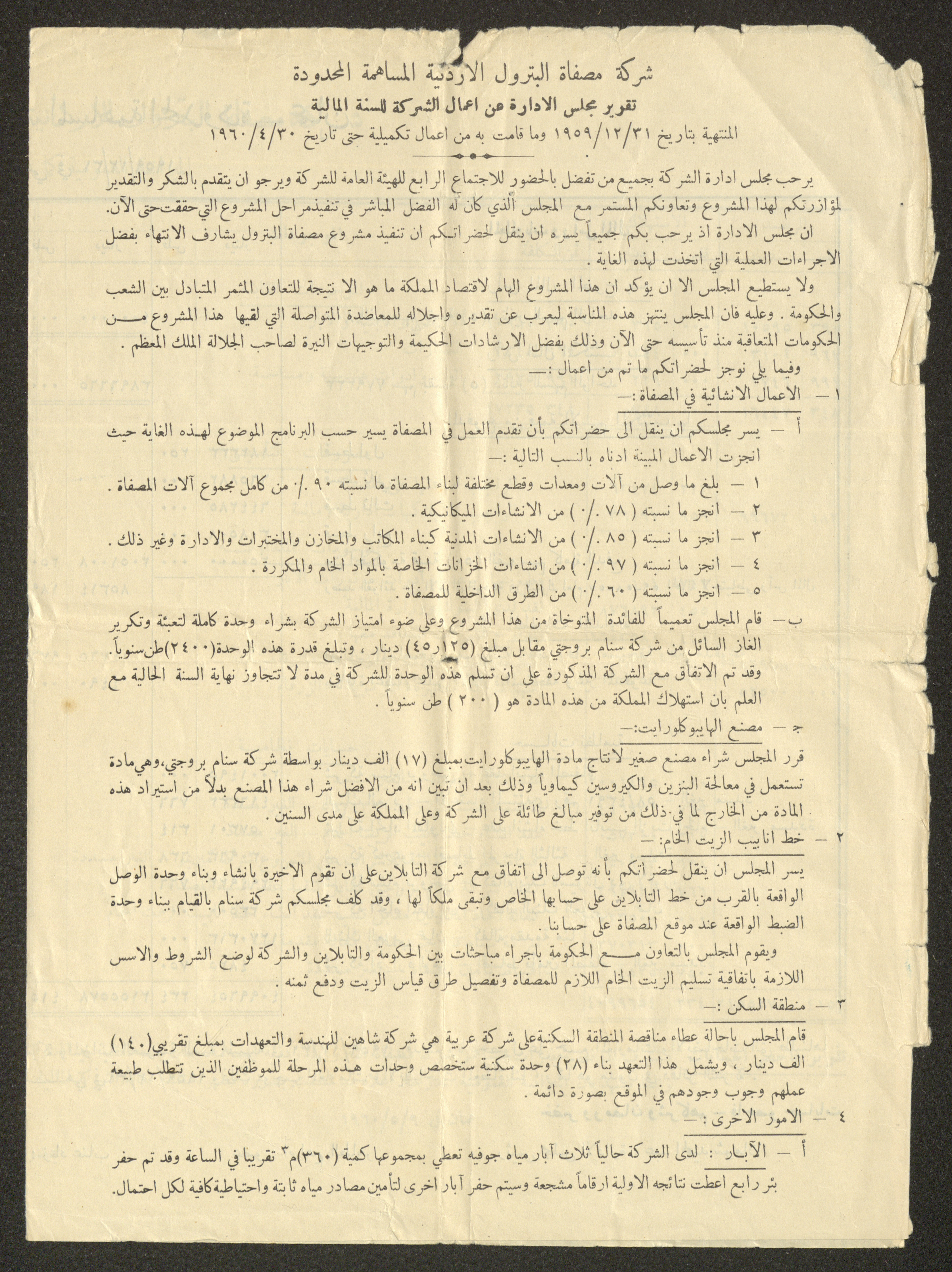 تتضمن هذة المادة الأرشيفية تقريرًا صادرًا عن شركة مصفاة البترول الأردنية المساهمة المحدودة إلى مجلس الإدارة، يدور حول أعمال الشركة للسنة المالية المنتهية بتاريخ 31 كانون الأول 1959، وما قامت به من أعمال تكميلية حتى تاريخ 30 نيسان 1960.