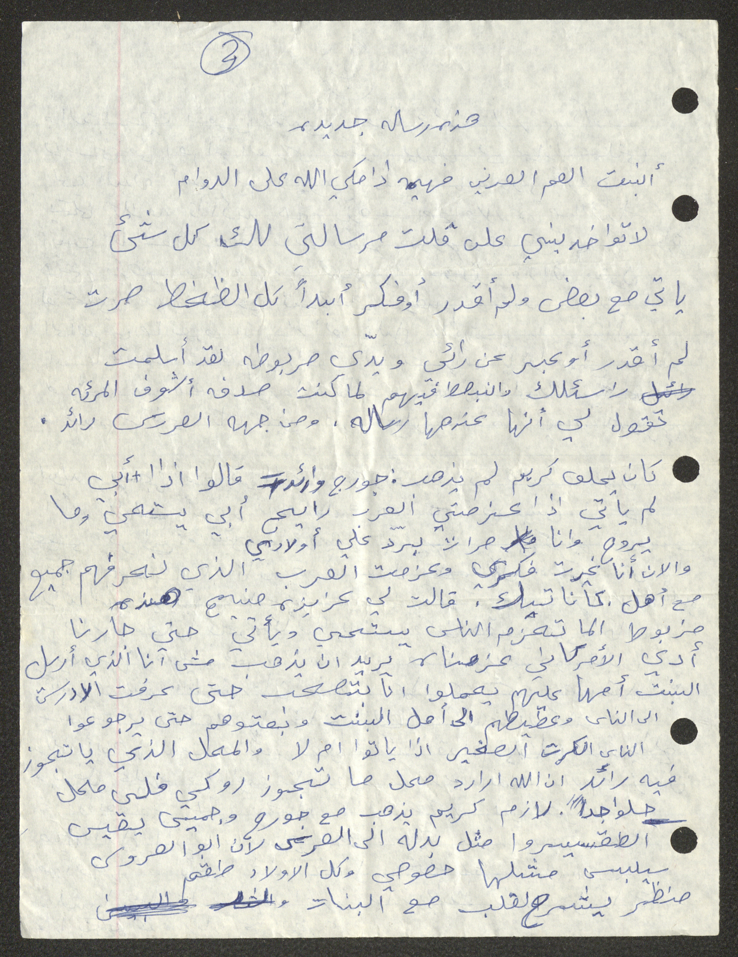 تتضمن هذه المادة الارشيفية المكتوبة بخط اليد، رسالة مرسلة إلى فهيمة عبدالله من ابنة عمها بتاريخ 30 تموز 1989، في بداية الرسالة تطمئن عن أخبارها وصحتها وتتمنى لها ثبات الصحة والعافية وتبلغها اشتياقها، ومن ثم تخبرها بأن عائلة أبو عيسى الجورج قد زارتها، ويهدون سلامهم لجميع العائلة.
