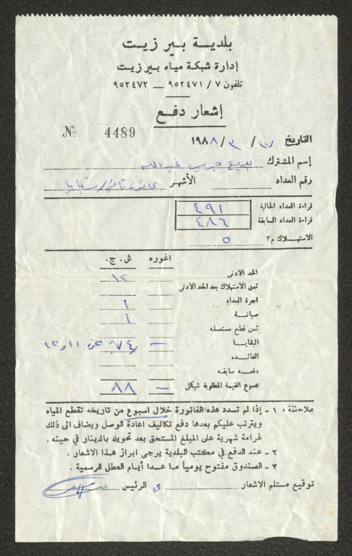 تتضمن هذه المادة الأرشيفية، إشعار دفع من بلدية بيرزيت لبديع جريس عبد الله بتاريخ 17 آذار 1988 لتسديد فاتورة مياه قيمتها 88 شيكل، وإن لم تسدد خلال أسبوع من تاريخه، تُقطع المياه عنهم، ويترتب عليهم دفع تكاليف إعادة الوصل، ويضاف إلى ذلك غرامة شهرية.