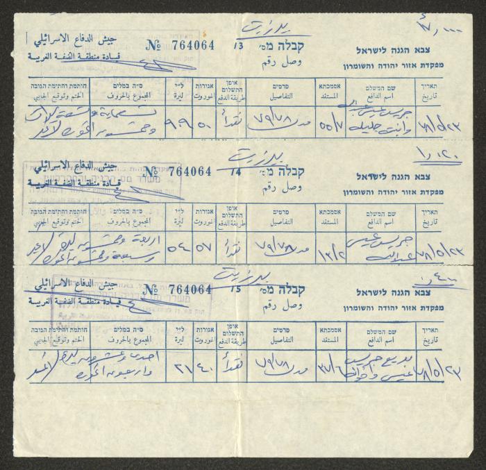 "وصول مالية"، صادرة عن قوات الاحتلال الإسرائيلي