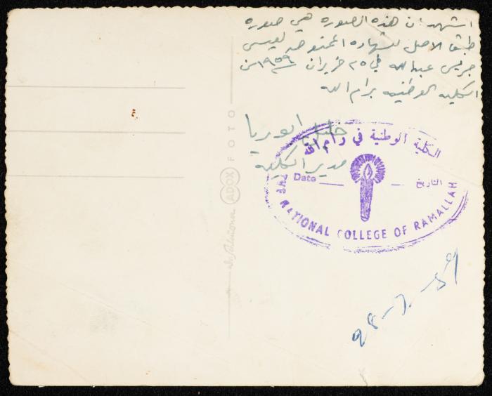 صورة عن شهادة الصف الخامس الثانوي لعيسى جريس عبدالله، صادرة ع الكلية الوطنية في رام الله بتاريخ 25 حزيران 1959.
