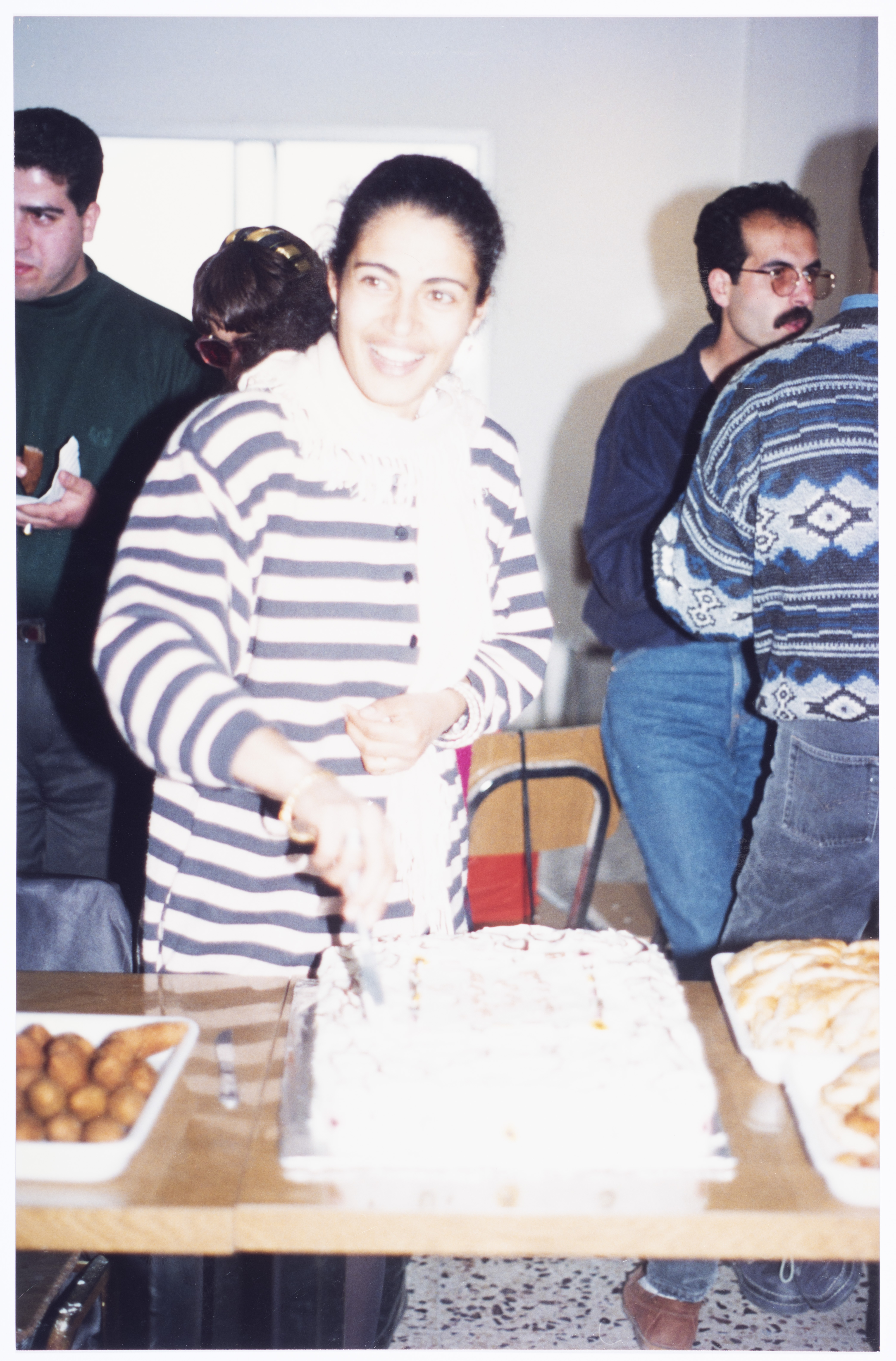 Taken in 1994, this photograph shows Joana Rafidi, a member of el-Funoun Palestinian Popular Dance Troupe celebrating the troupe's anniversary at the Popular Art Center in al-Bireh.