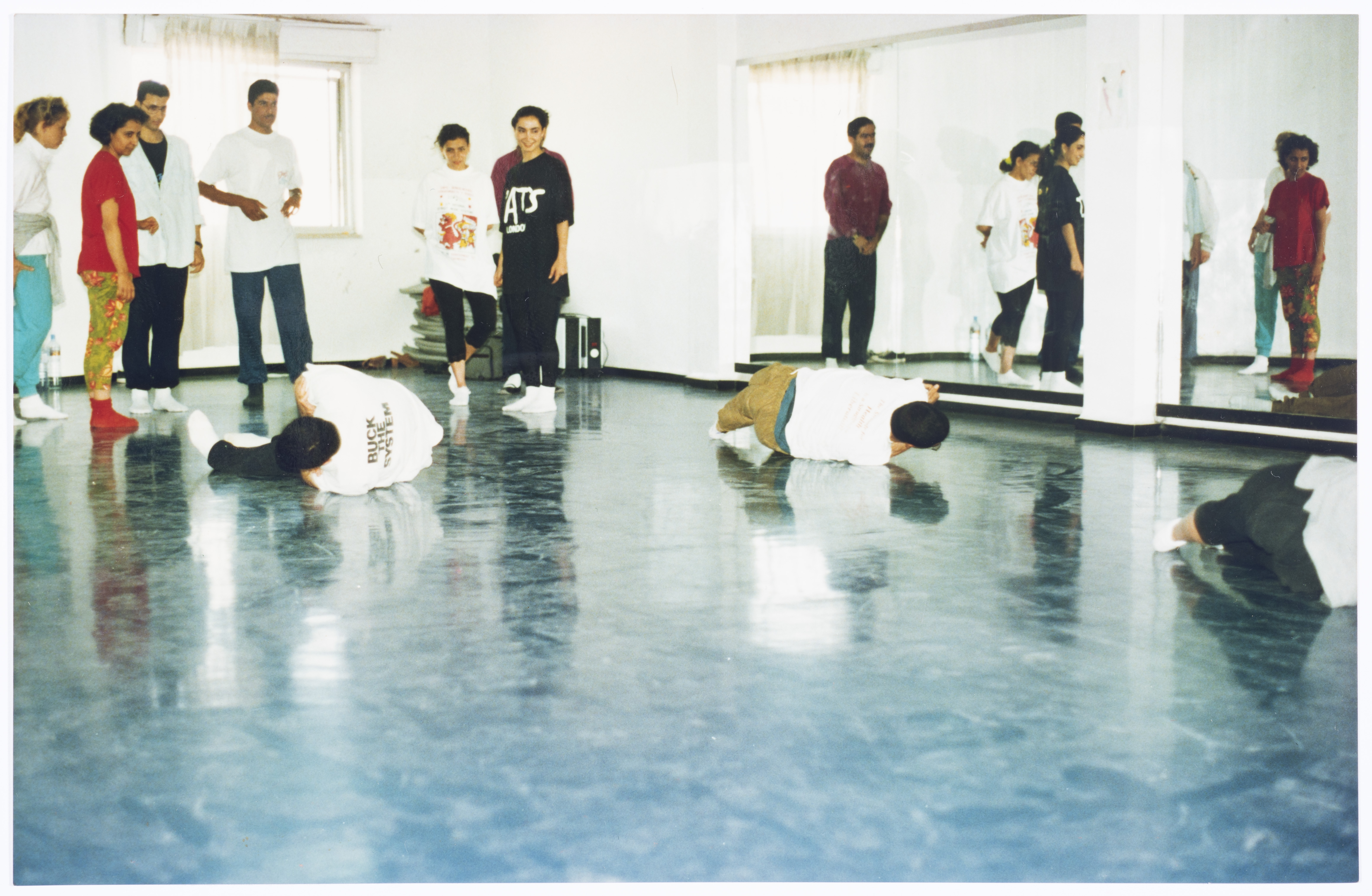 Taken in 1994-1995, this photograph shows members of el-Funoun Palestinian Popular Dance Troupe during their participation in a workshop with the French Dancing Troupe "Fattoumi Lamoureux" at the training halls of the Popular Art Center in al-Bireh. Appearing in the photograph are Lana abu Hejleh, a guy from the Odeh Family, Omar Barghouthi and Serene Huleileh.