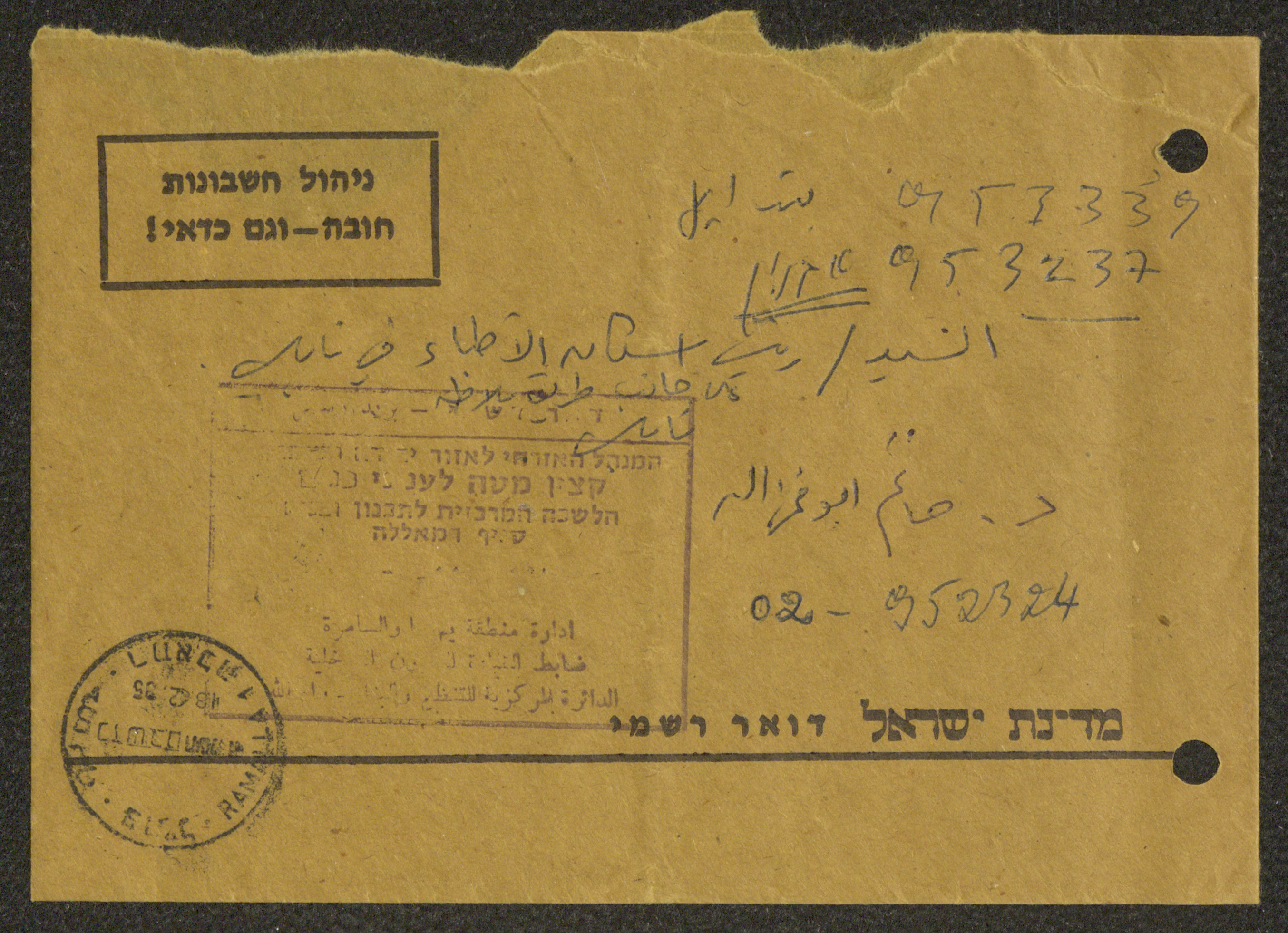 Dated 1985, this document shows an envelope of a letter that was sent to Hatem abu Ghazaleh, Head of the Doctors' Housing in Nablus, and was sealed by several parties, including the Central Department for Organization at the Judea and Samaria District Administration.