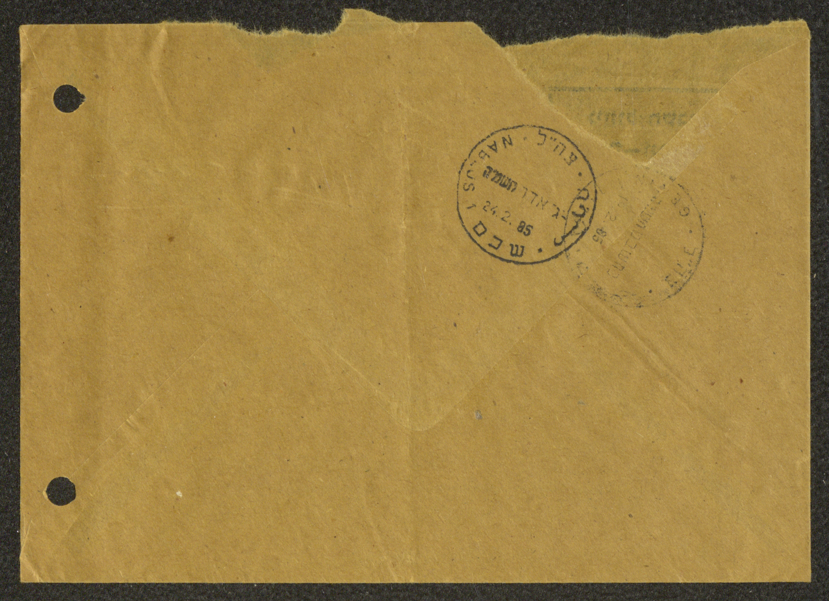 An Envelope of a Letter Delivered to the Head of Doctors' Housing in Nablus, 1985