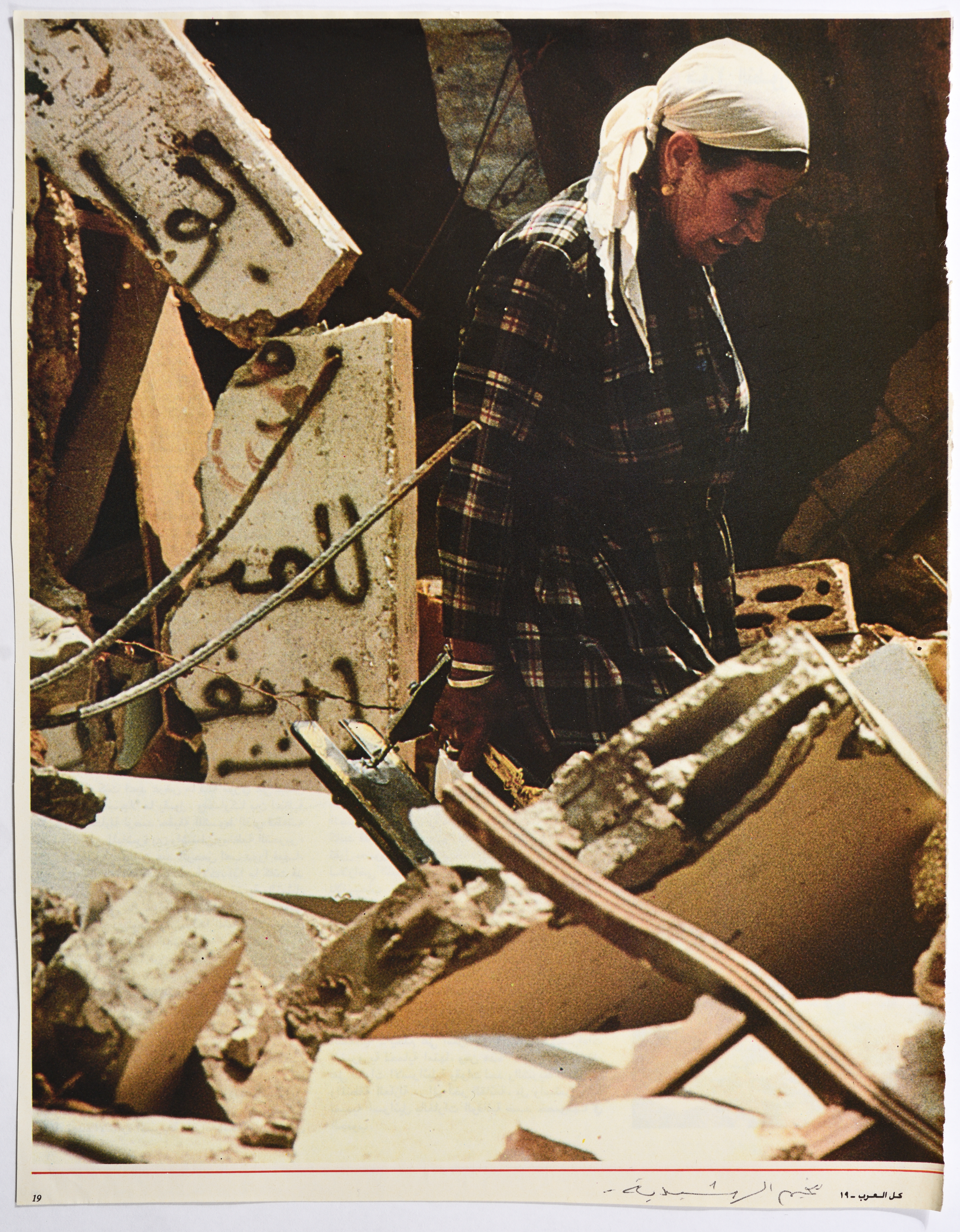 قصاصة من مجلة كل العرب صادرة ما بين عاميّ 1982 و1987، تحتوي على صورة لامرأة وسط الركام في مخيم الرشيدية للاجئين الفلسطينيين قرب مدينة صور بلبنان.