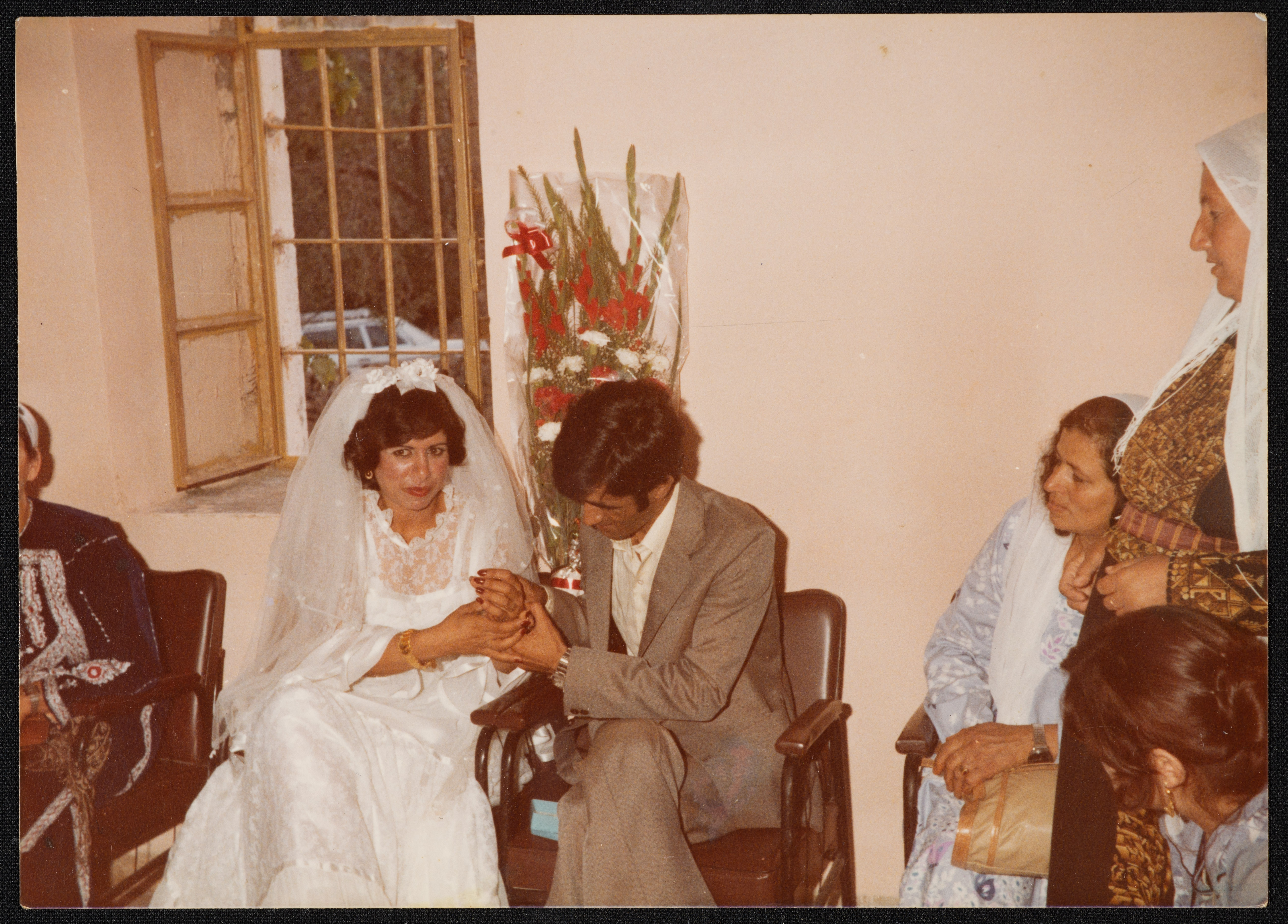 Taken on 13 August 1981, this photograph shows Ahmad Sa'dat and Abla al-Rimawi at their wedding in Beit Rima.