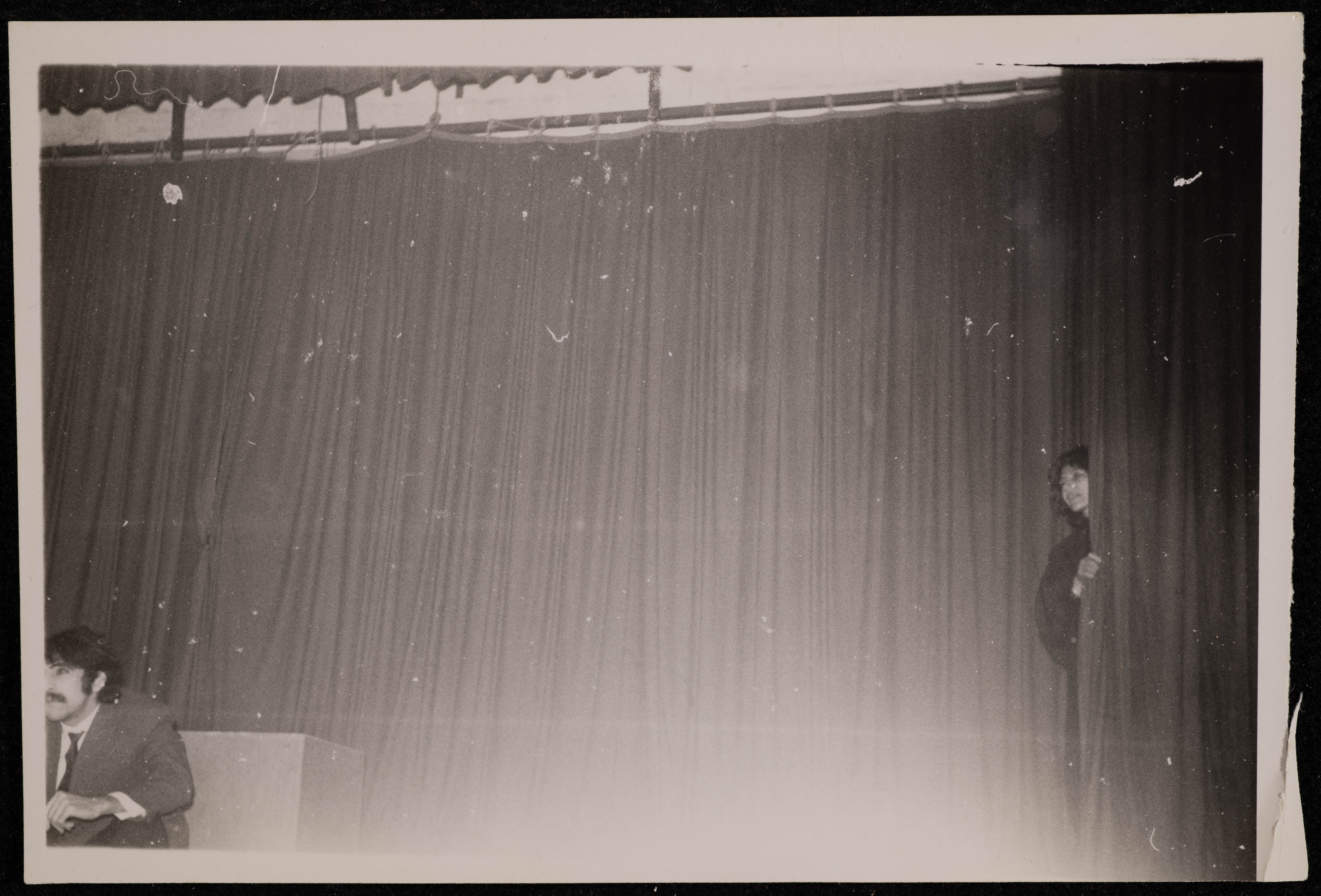 Performed by the Balalin Theatre Troupe in August 1974, this photograph shows Suheir Abdel-Hadi and Emil Ashrawi performing a scene from the "Ta’ Kharfak Ya Sahbi (Let Me Tell You Something, My Friend)".