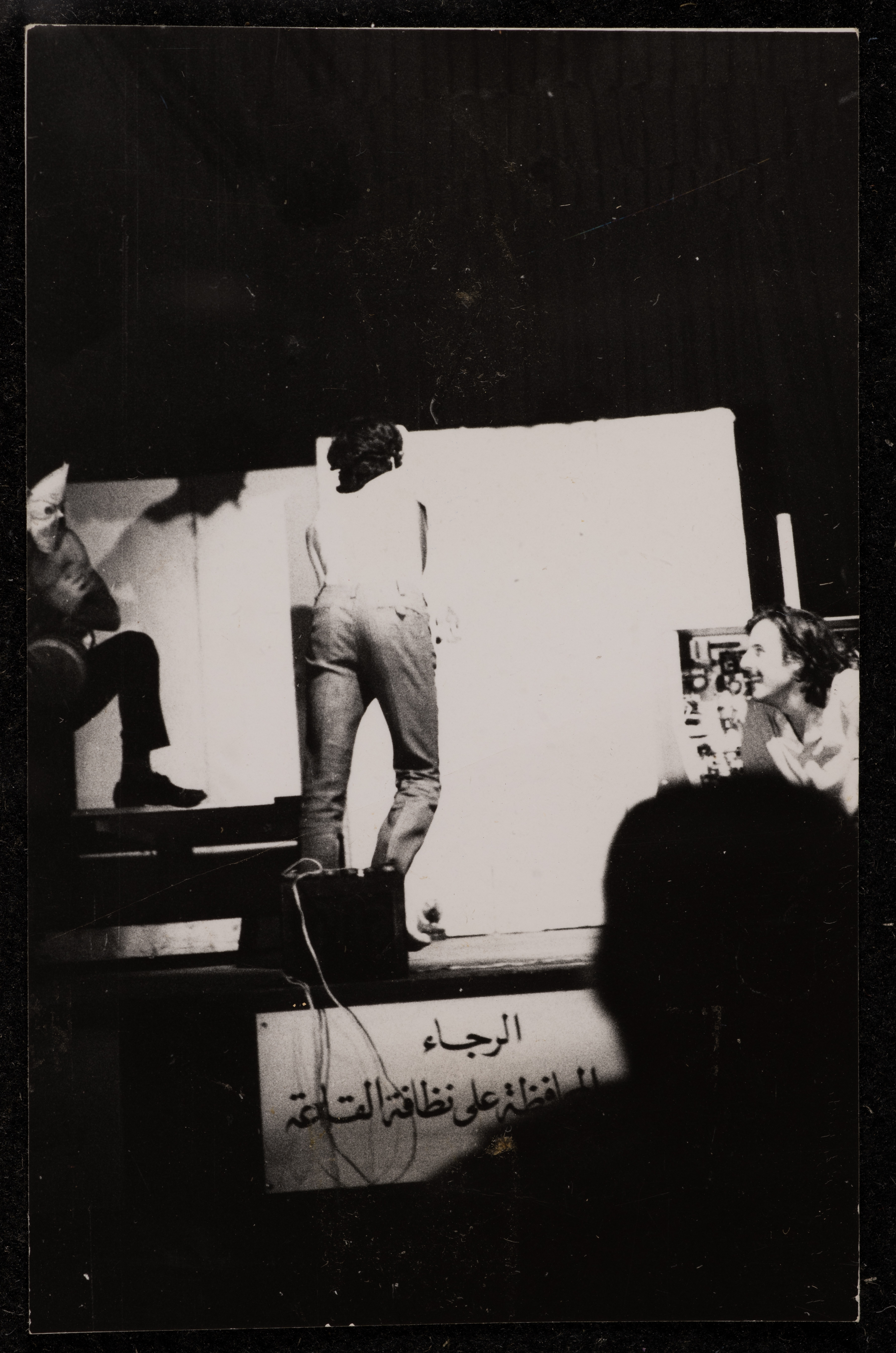 This photograph shows a scene from the "Al-Atma (Darkness)" play performed by the Balalin Theatre Troupe in September and December 1972, which included François Abou Salem and two others.