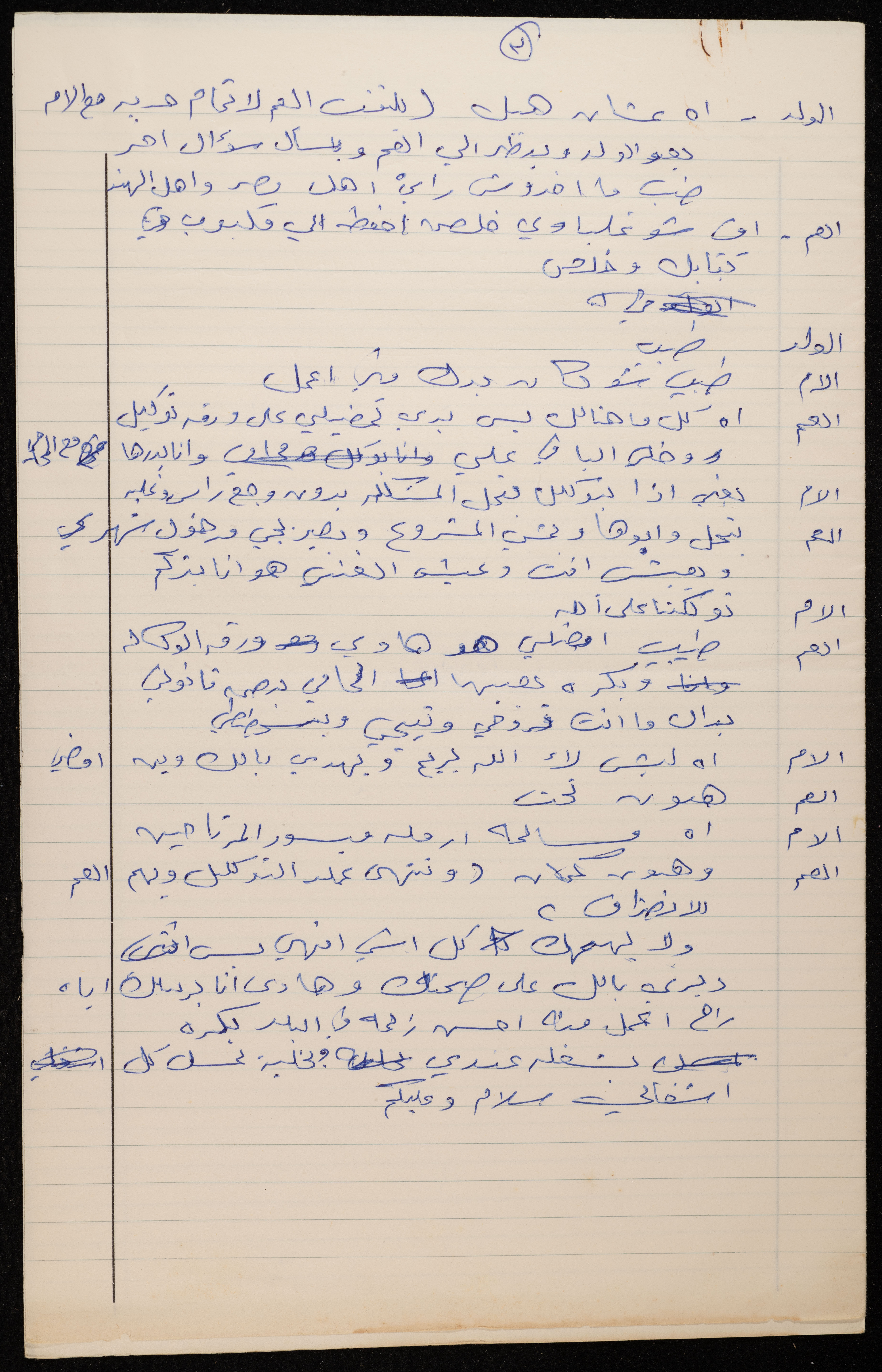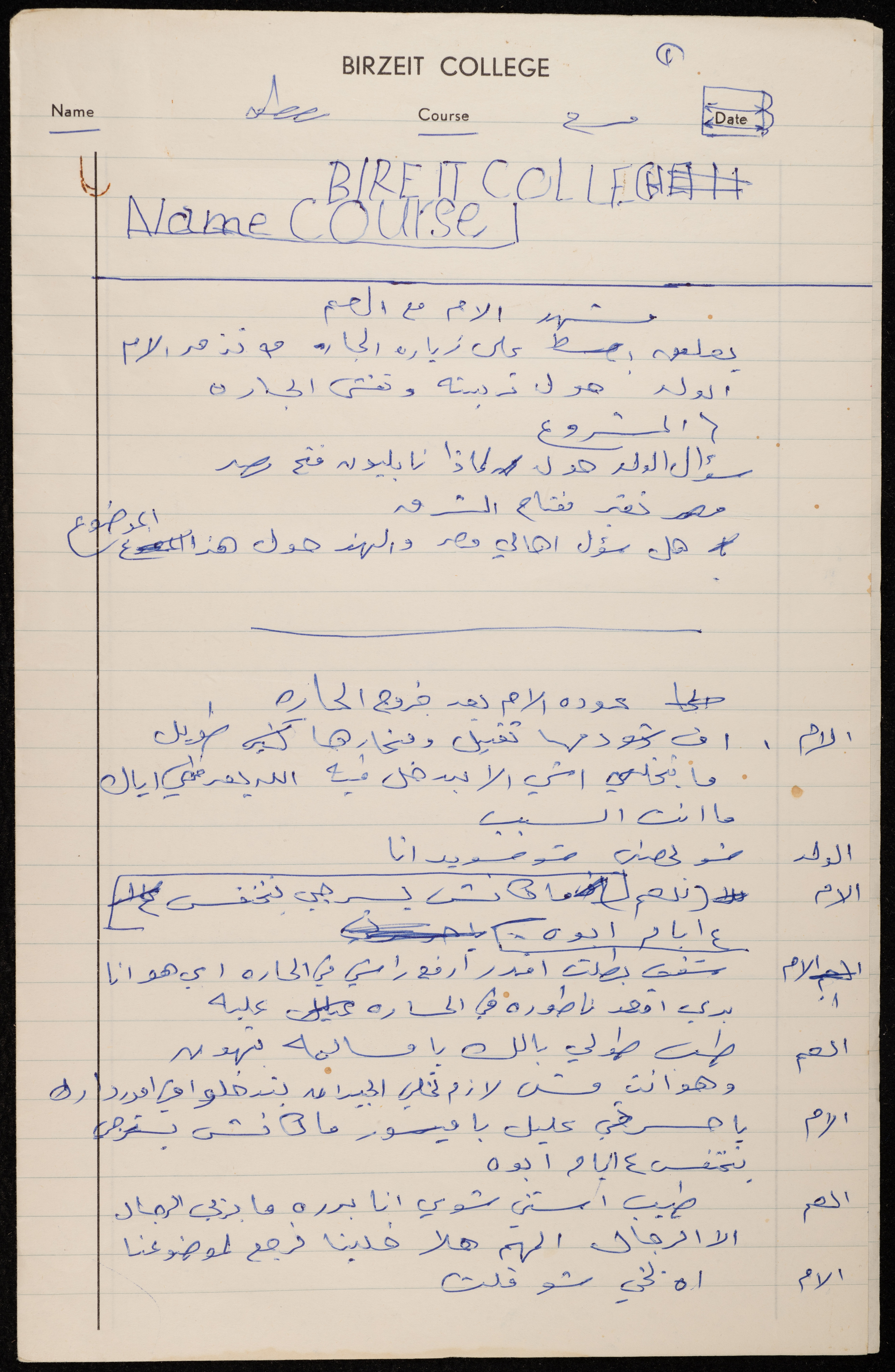 This document shows the text of a scene from the "Ta' Kharfak Ya Sahbi (Let Me Tell You Something, My Friend)", which was performed by the Balalin Theatre Troupe in August 1974. The play was written and directed by the Troupe, starring Hani abu Shanab, Mustafa and Majed al-Kurd, Adel Tartir, Sameh Abboushi and Emil Ashrawi.