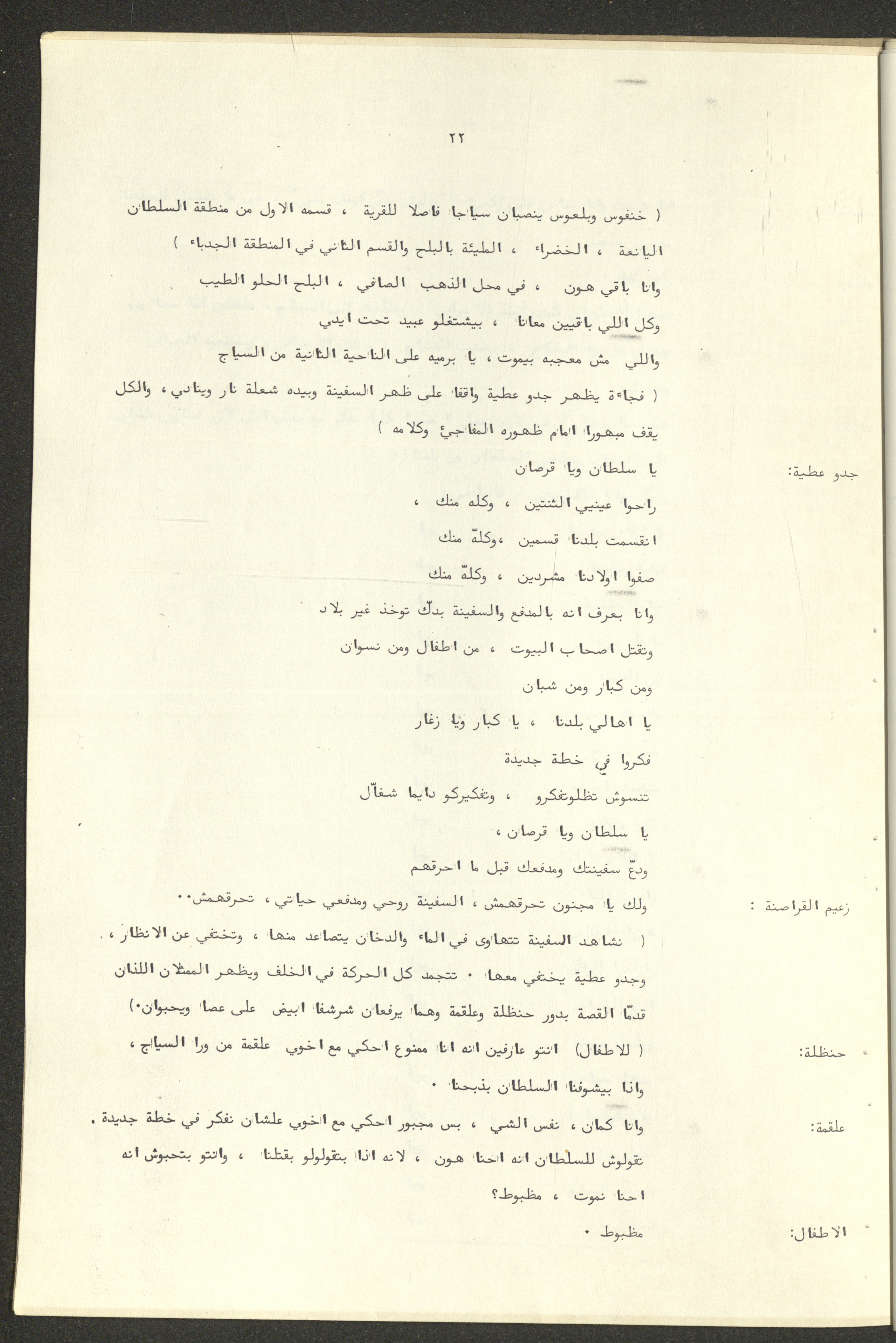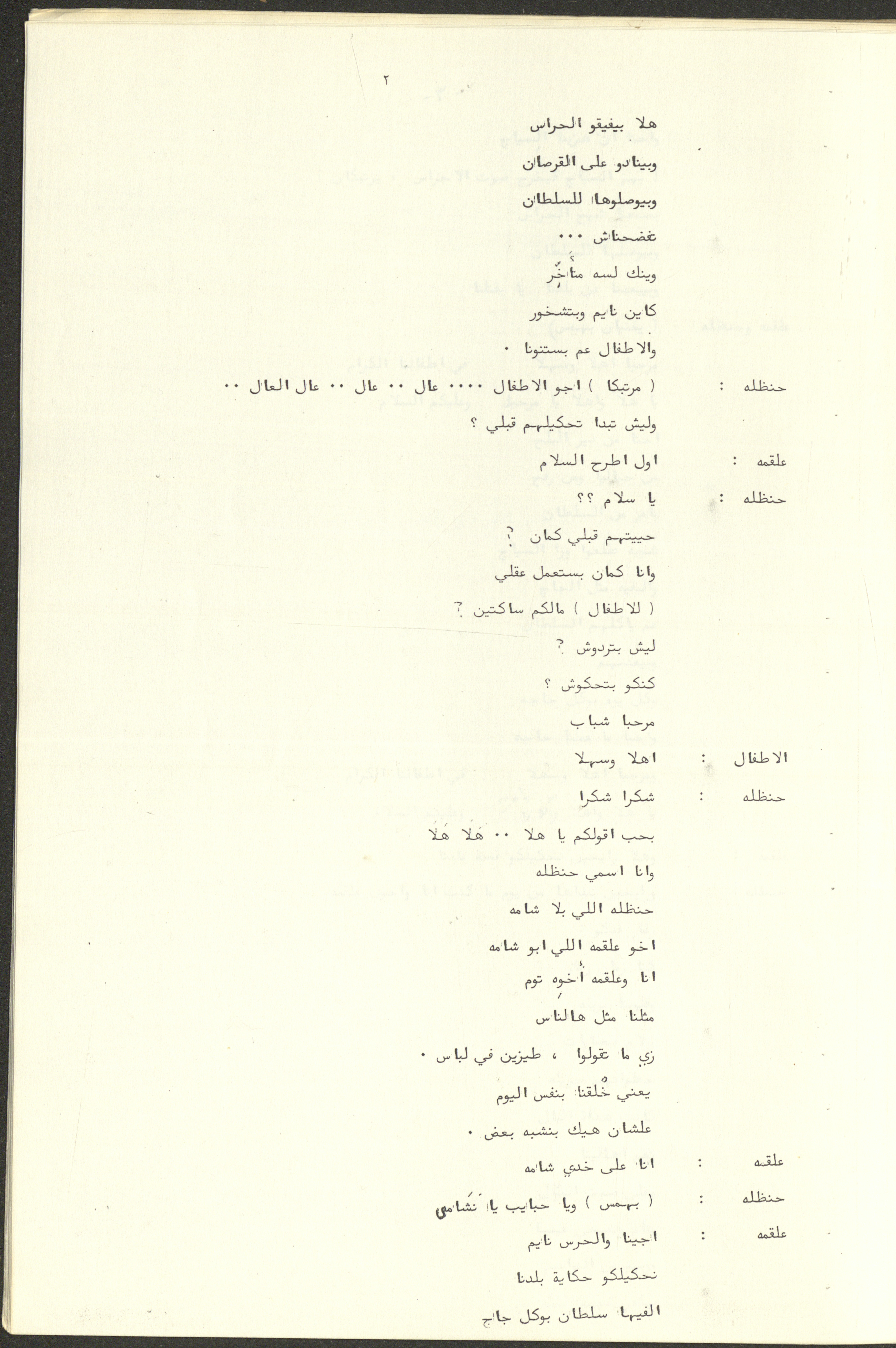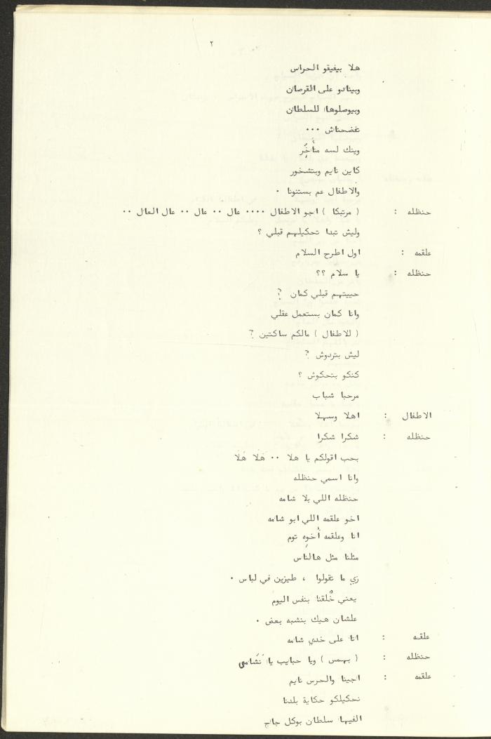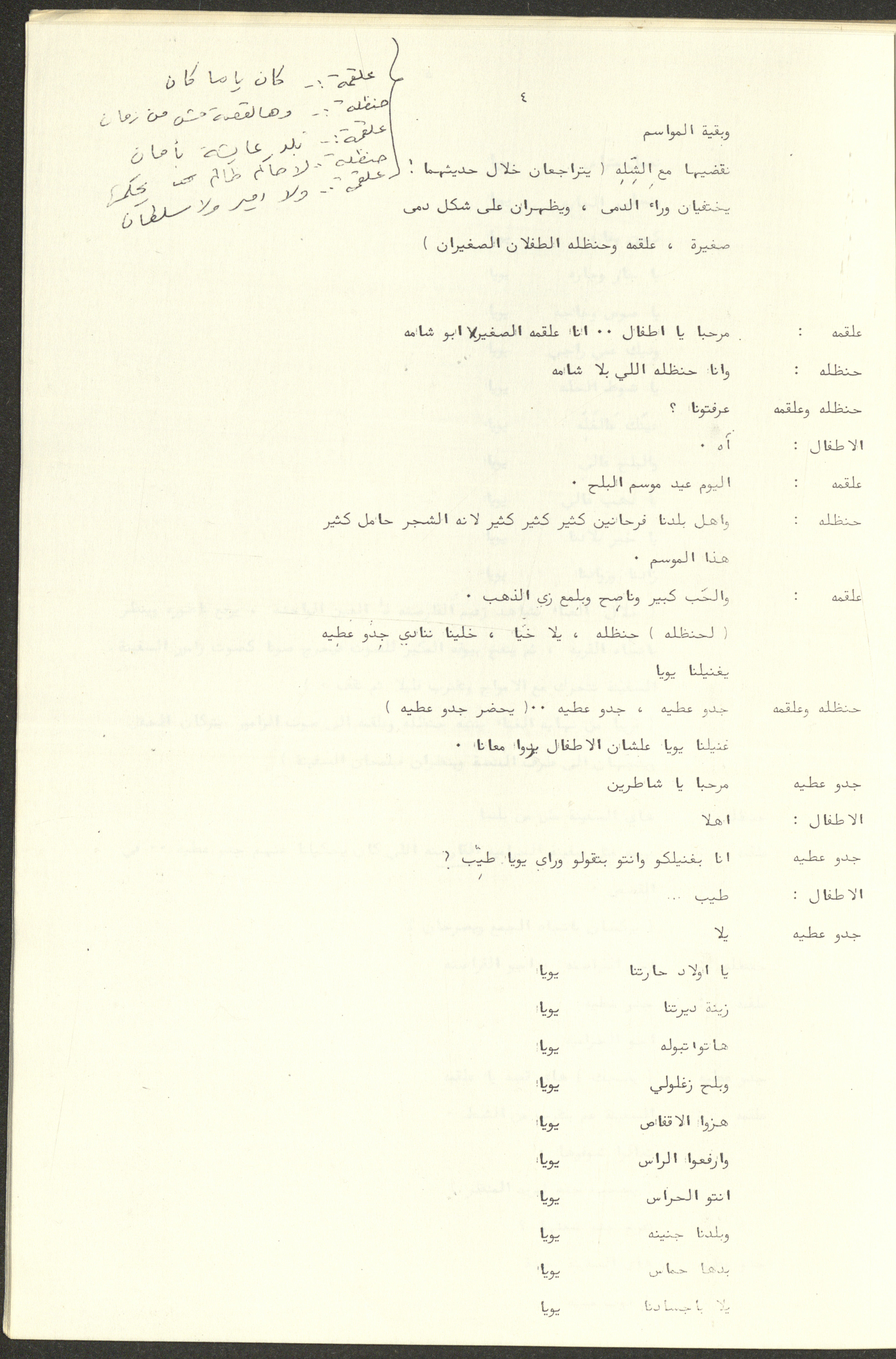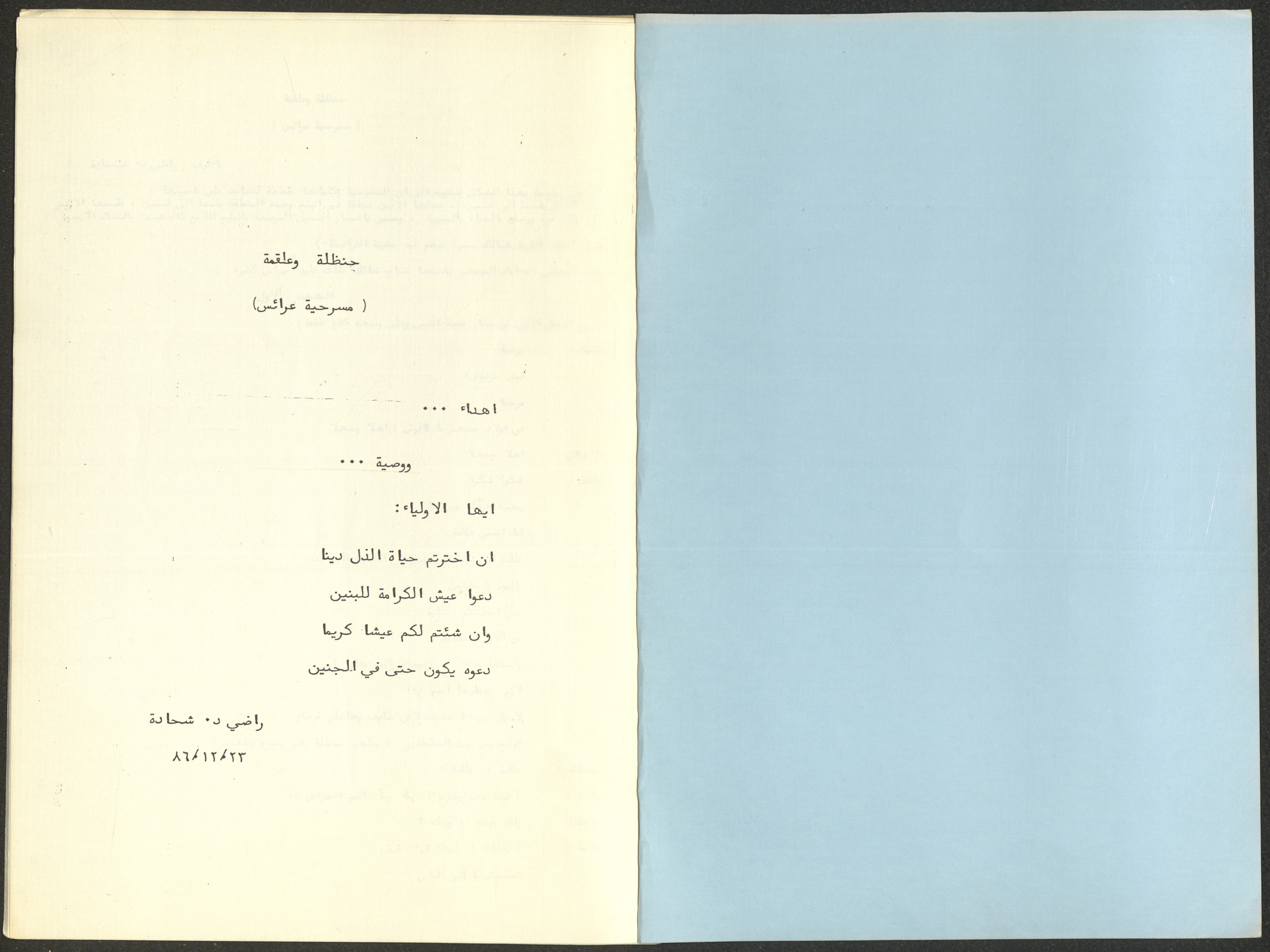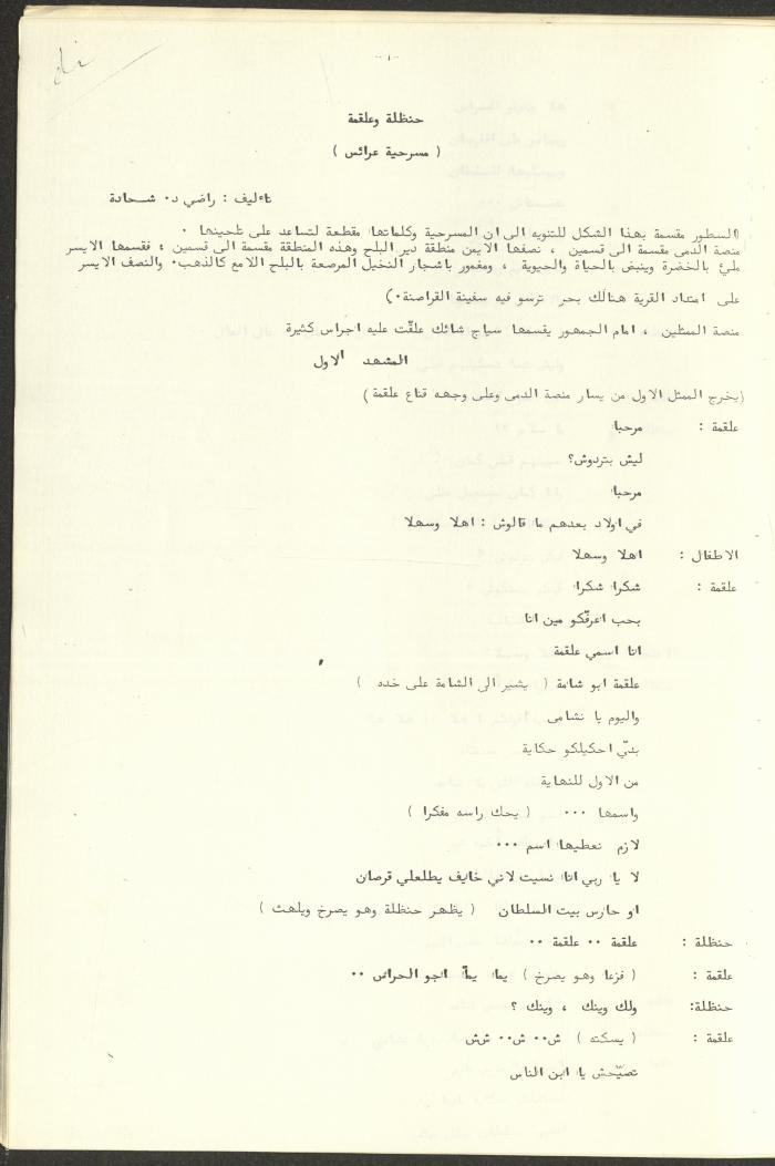 نص مسرحية العرائس "حنظل وعلقمة"، التي ألَّفها راضي شحادة في 23 كانون الأول 1986.