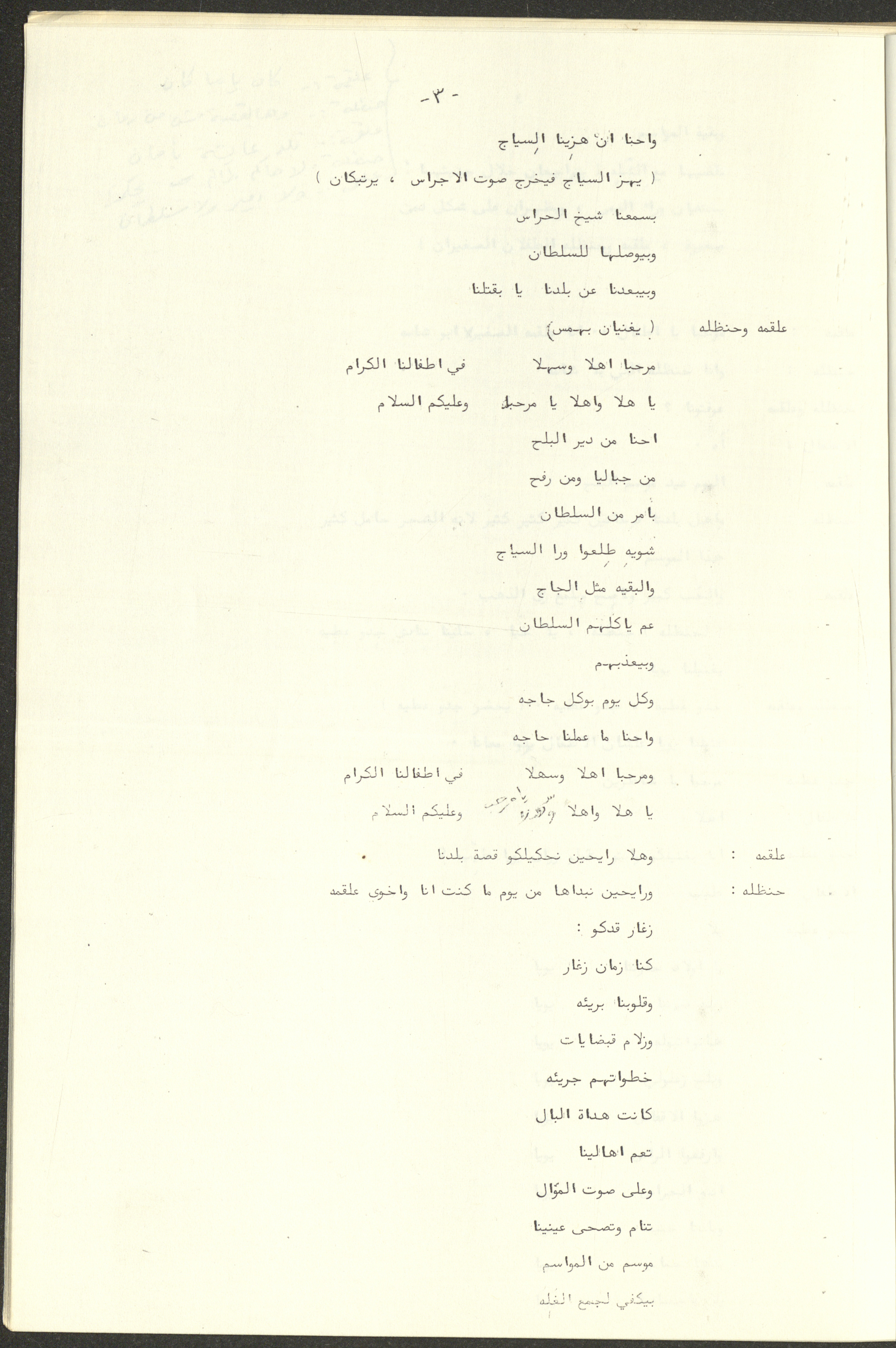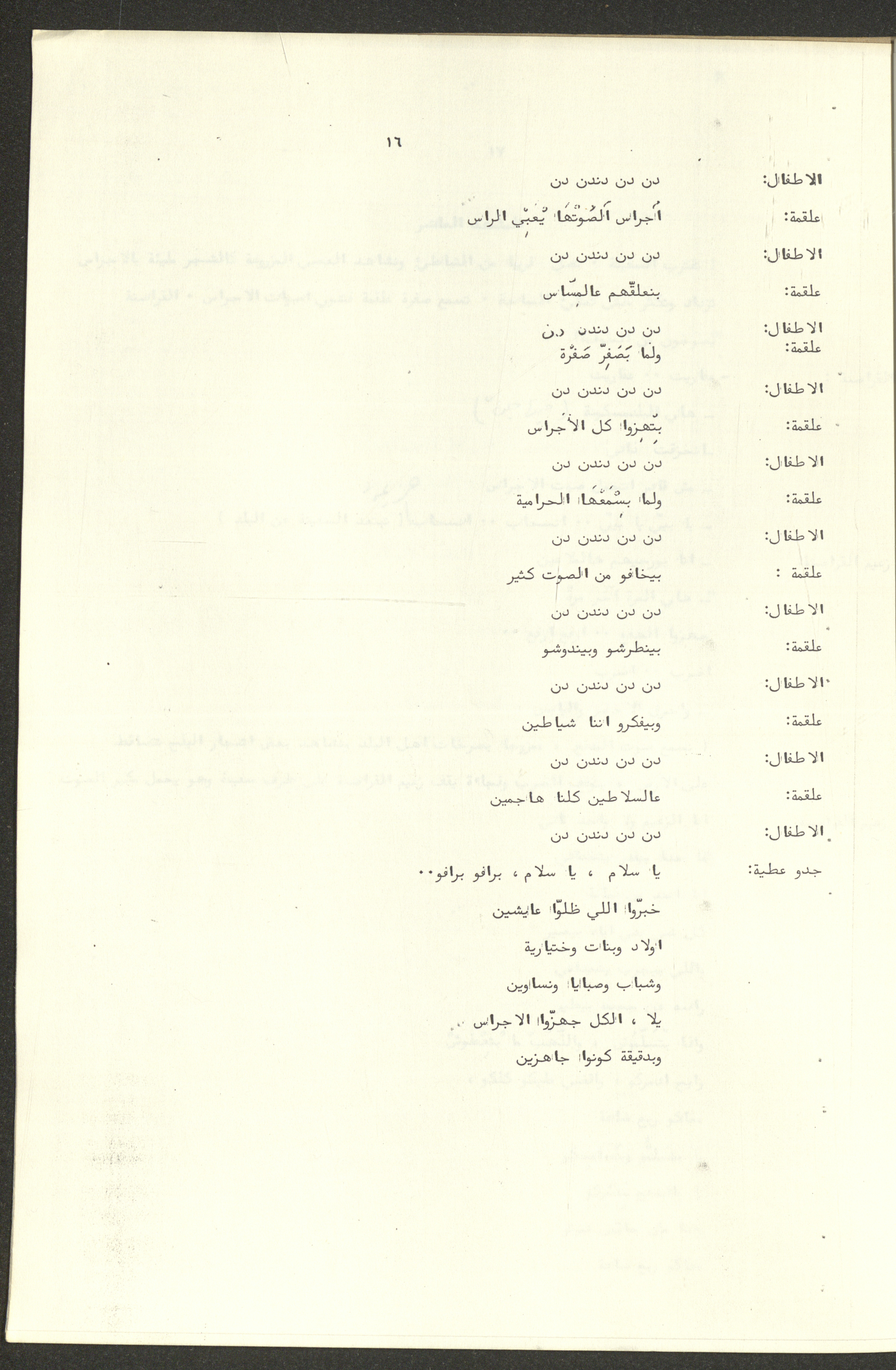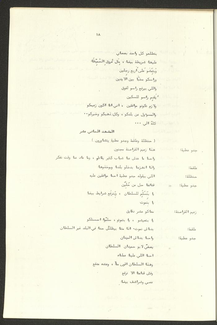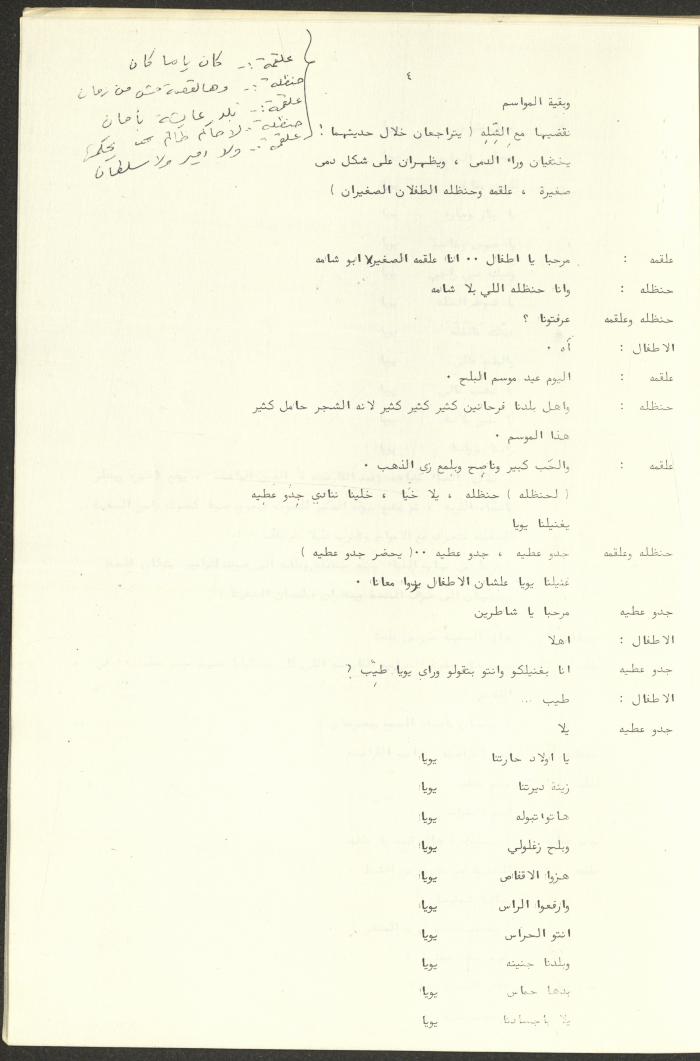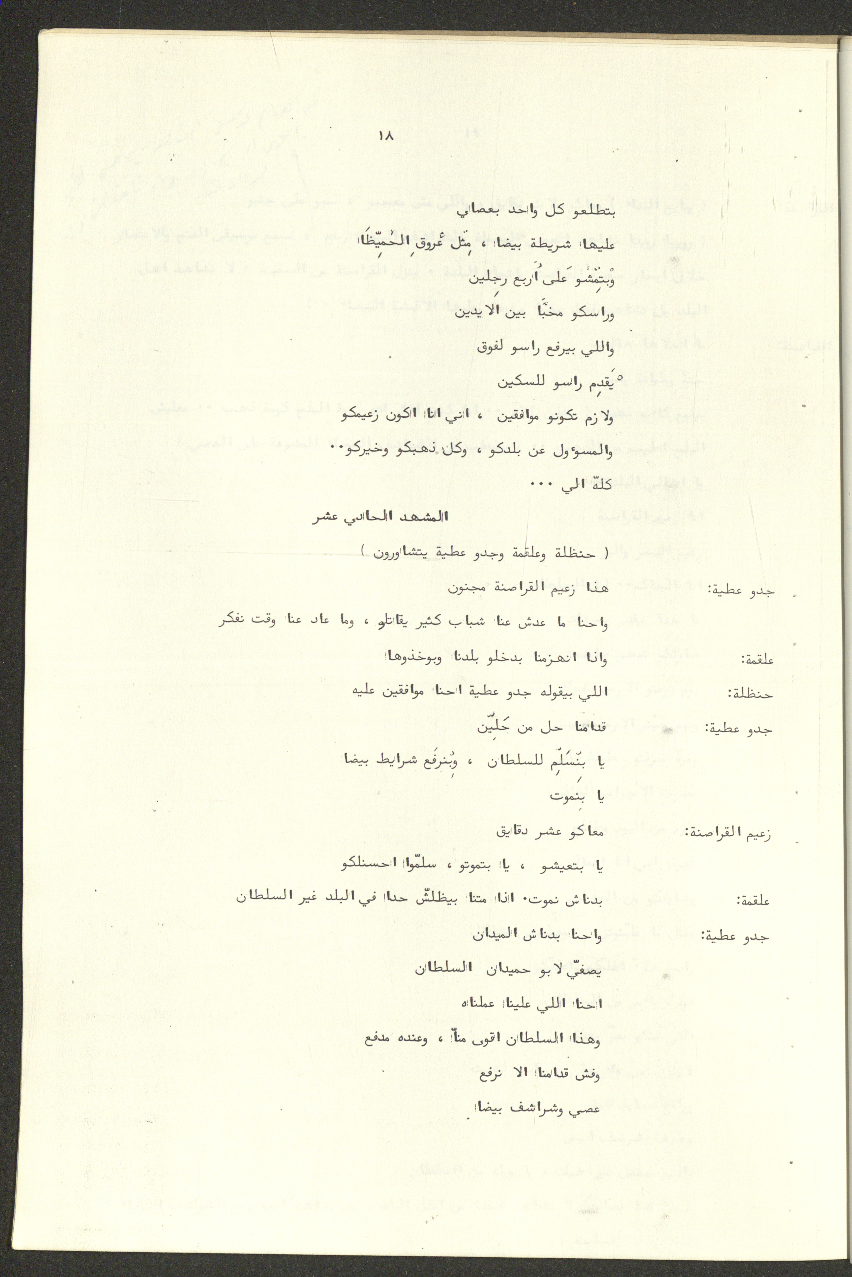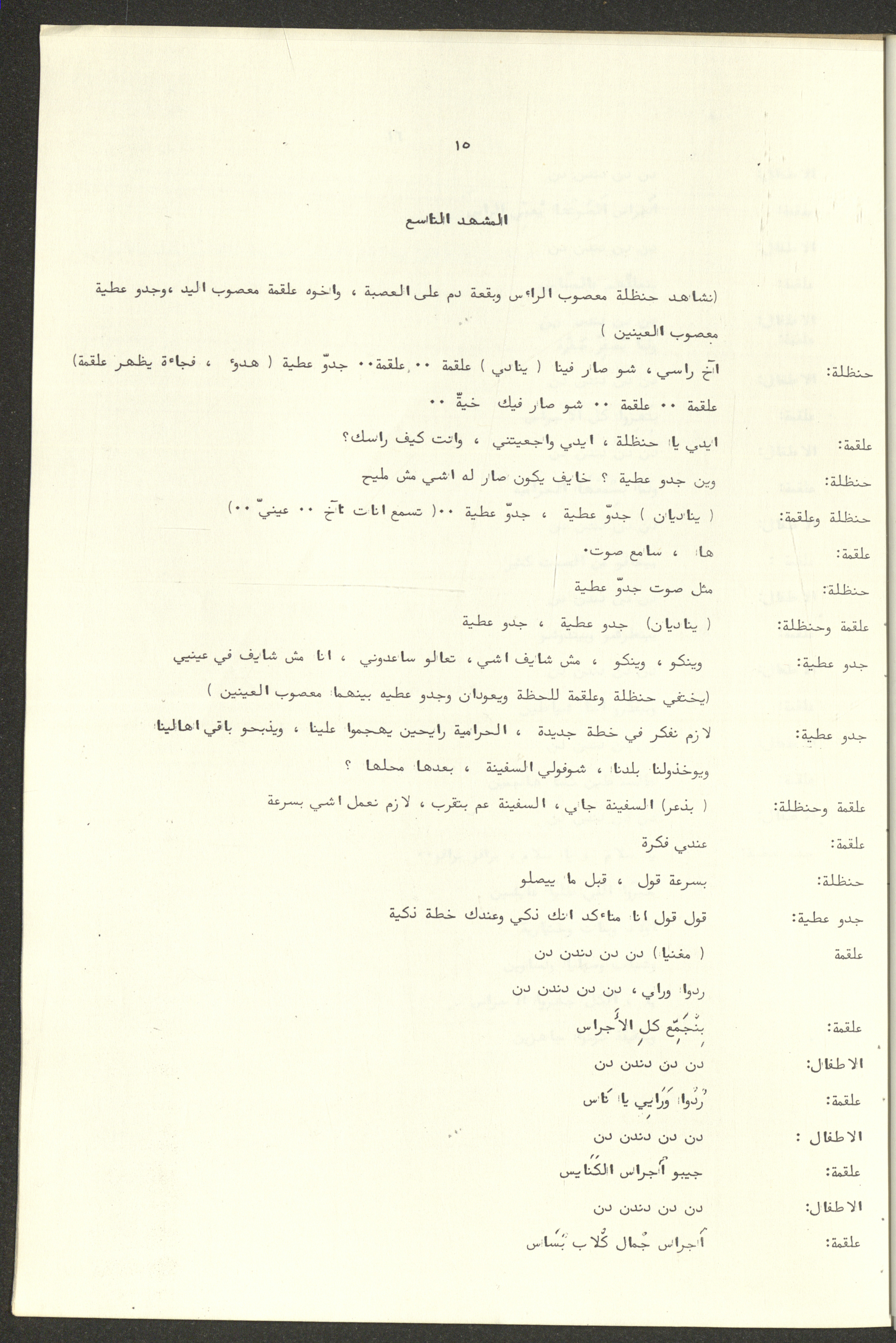 نص مسرحية العرائس "حنظل وعلقمة"، التي ألَّفها راضي شحادة في 23 كانون الأول 1986.
