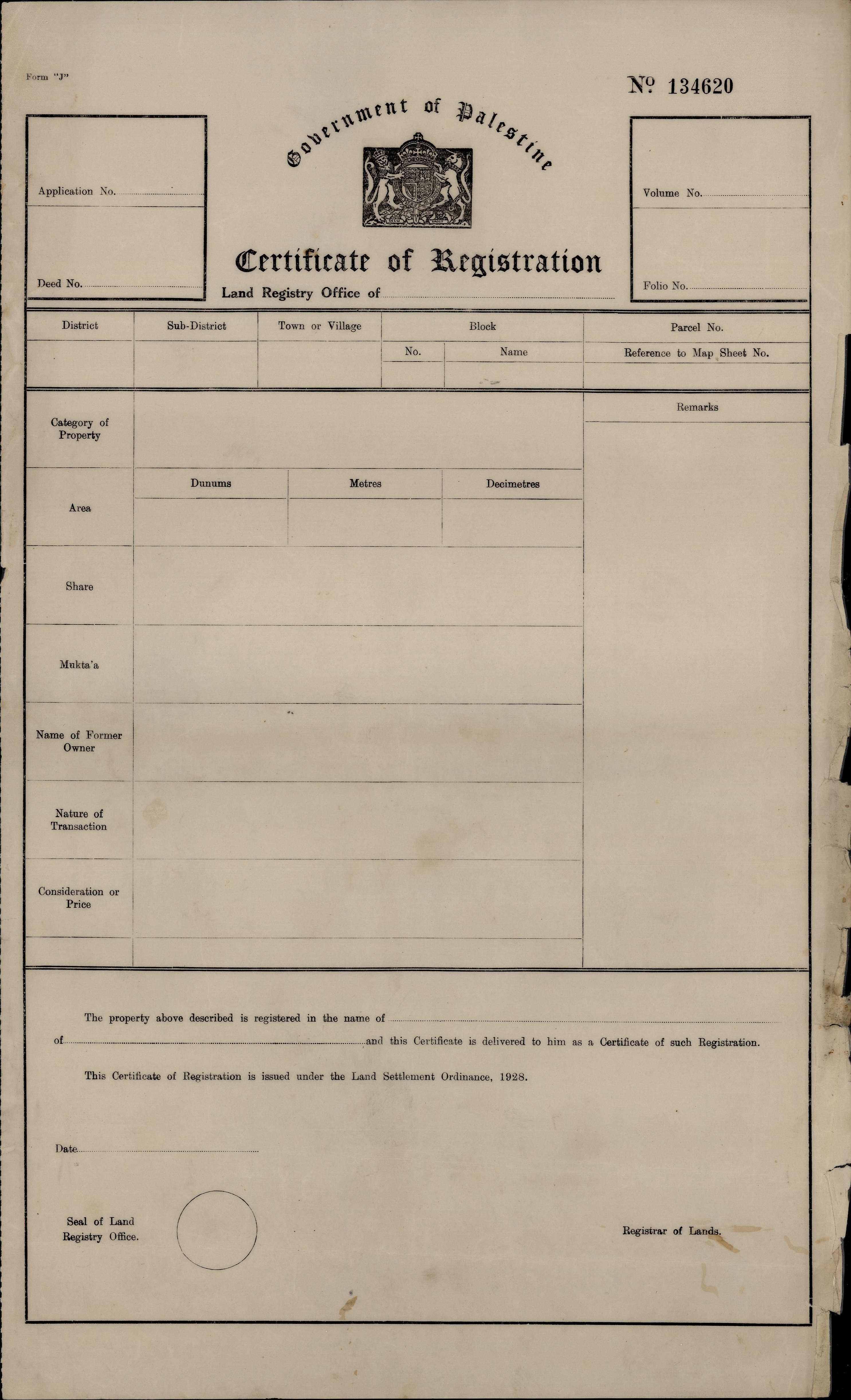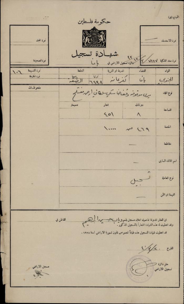 شهادة تسجيل صادرة عن دائرة تسجيل الأراضي في حكومة فلسطين، باسم دياب حسين إبراهيم، بتاريخ 20 آذار 1940، لأرض ميري موقوفة في كفر عانة قضاء يافا، نمرة القسيمة 106.