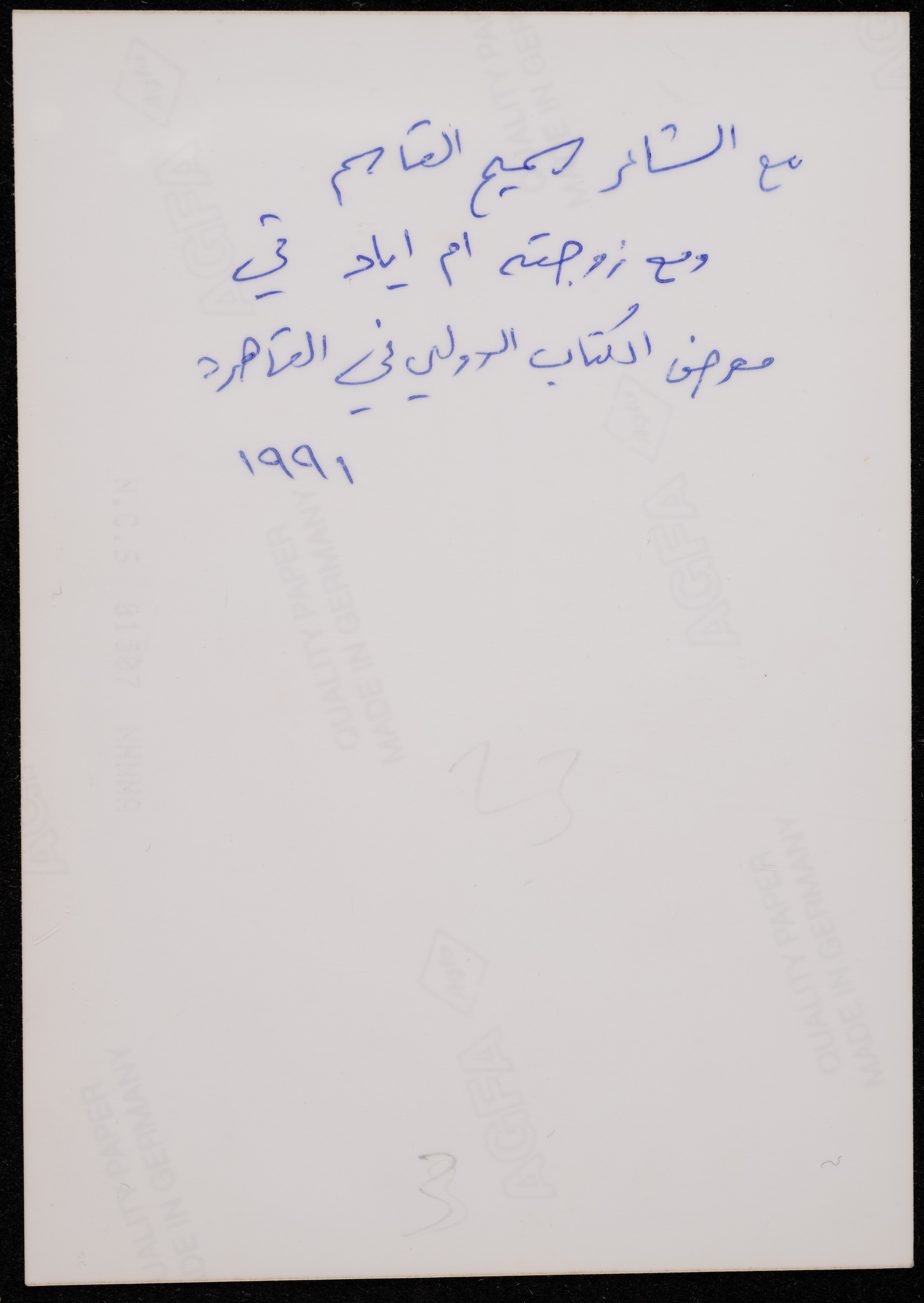 صورة التقطت عام 1991، يظهر فيها شكيب جهشان وزوجته إم إياد برفقة الشاعر سميح القاسم أثناء معرض الكتاب الدولي في القاهرة.