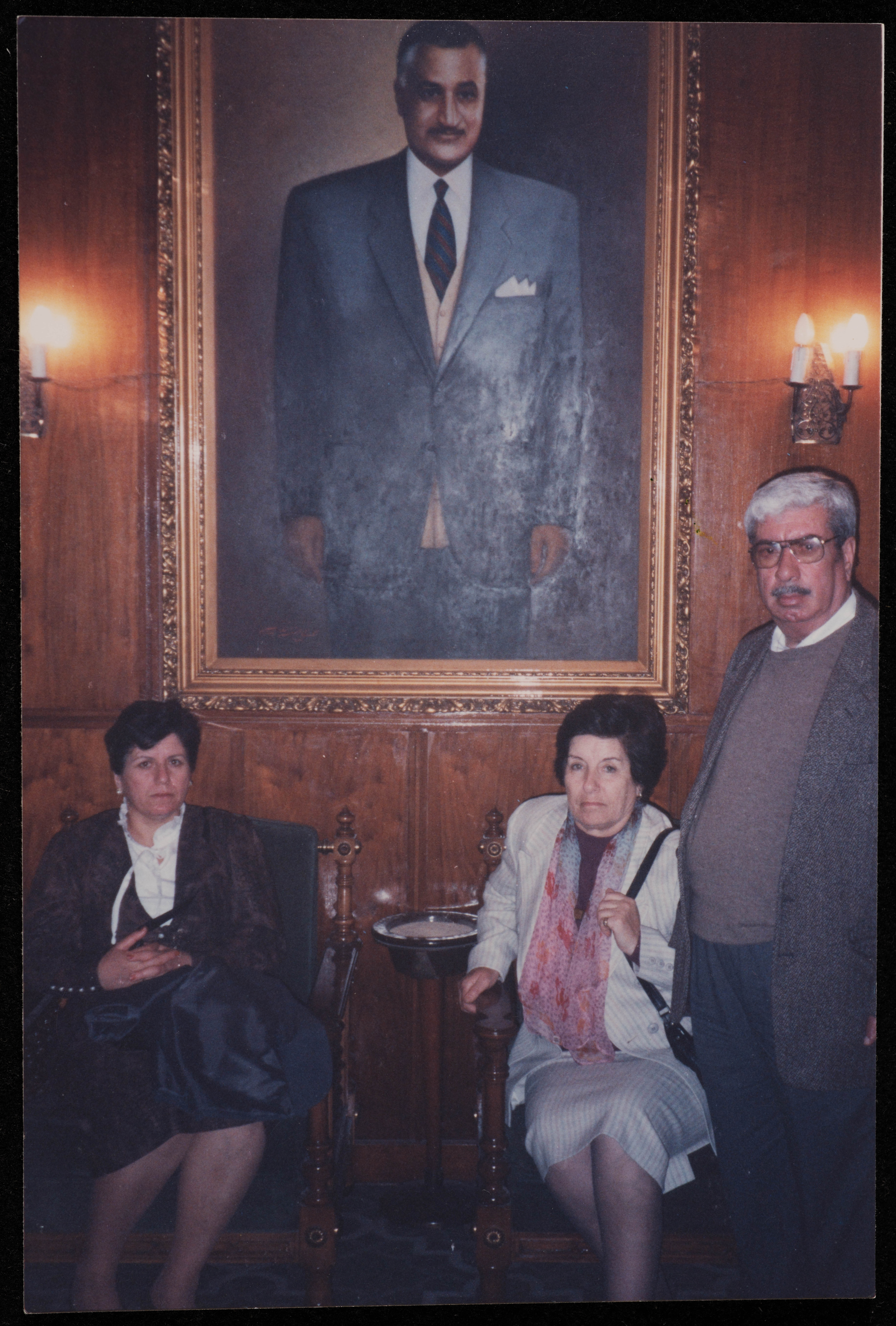 صورة التقطت في نهاية تسعينيات القرن العشرين، يظهر فيها شكيب جهشان وزوجته جورجيت وأمل جهشان أمام صورة لجمال عبد الناصر في مصر.