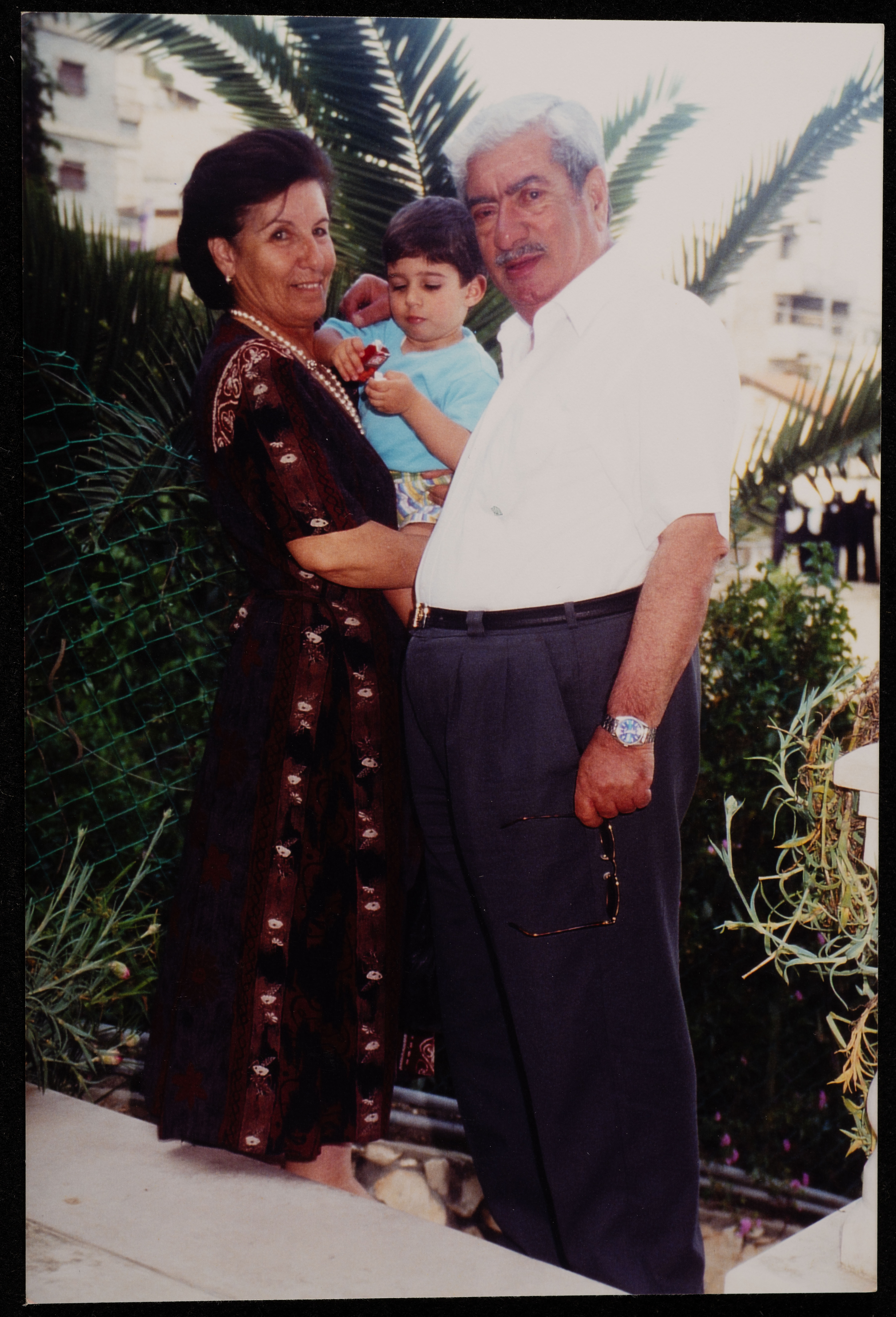 شكيب جهشان برفقة زوجته جورجيت وحفيدهم، الناصرة، مطلع تسعينيات القرن العشرين