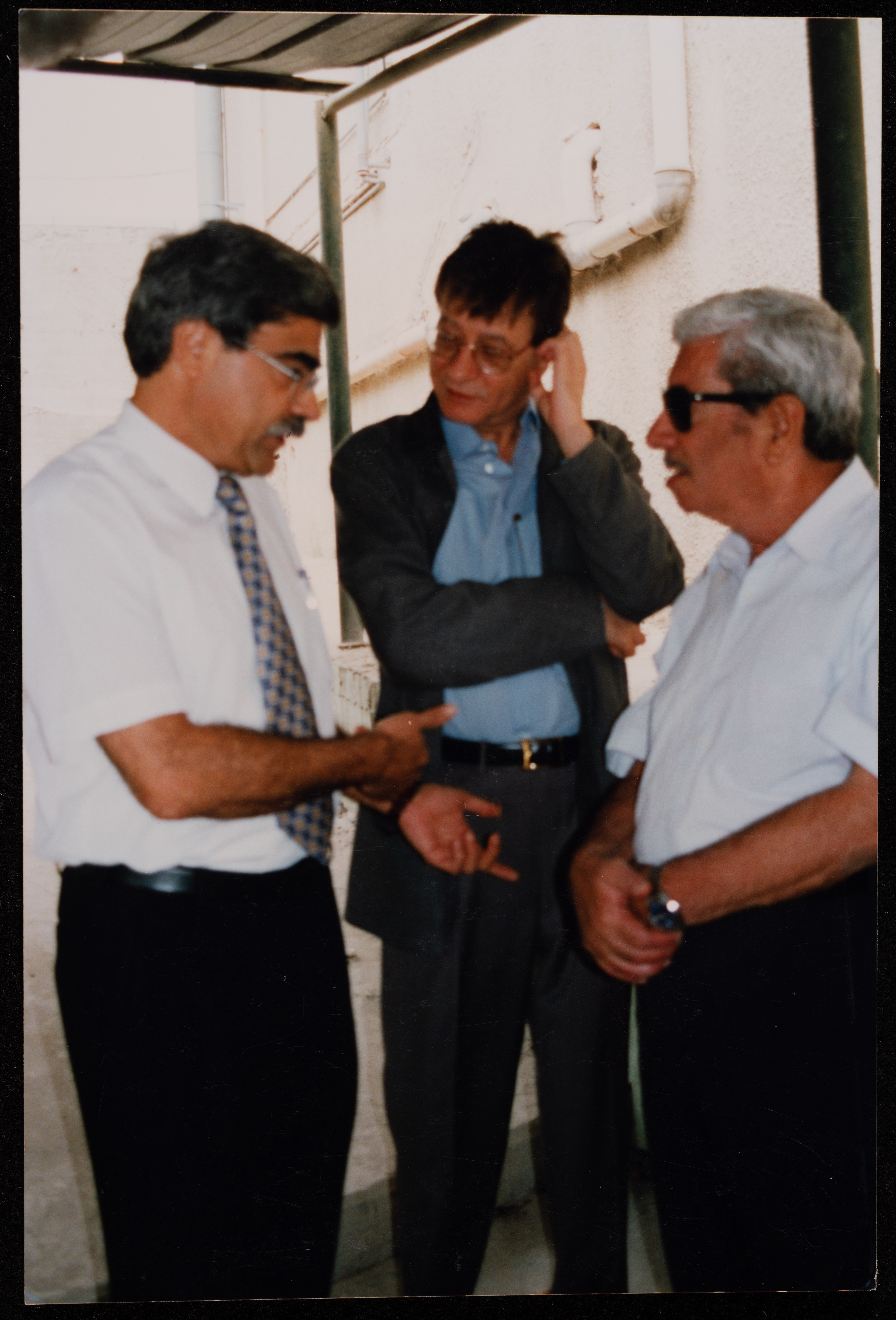 شكيب جهشان برفقة محمود درويش ورامز جرايسي، الناصرة، مطلع تسعينيات القرن العشرين