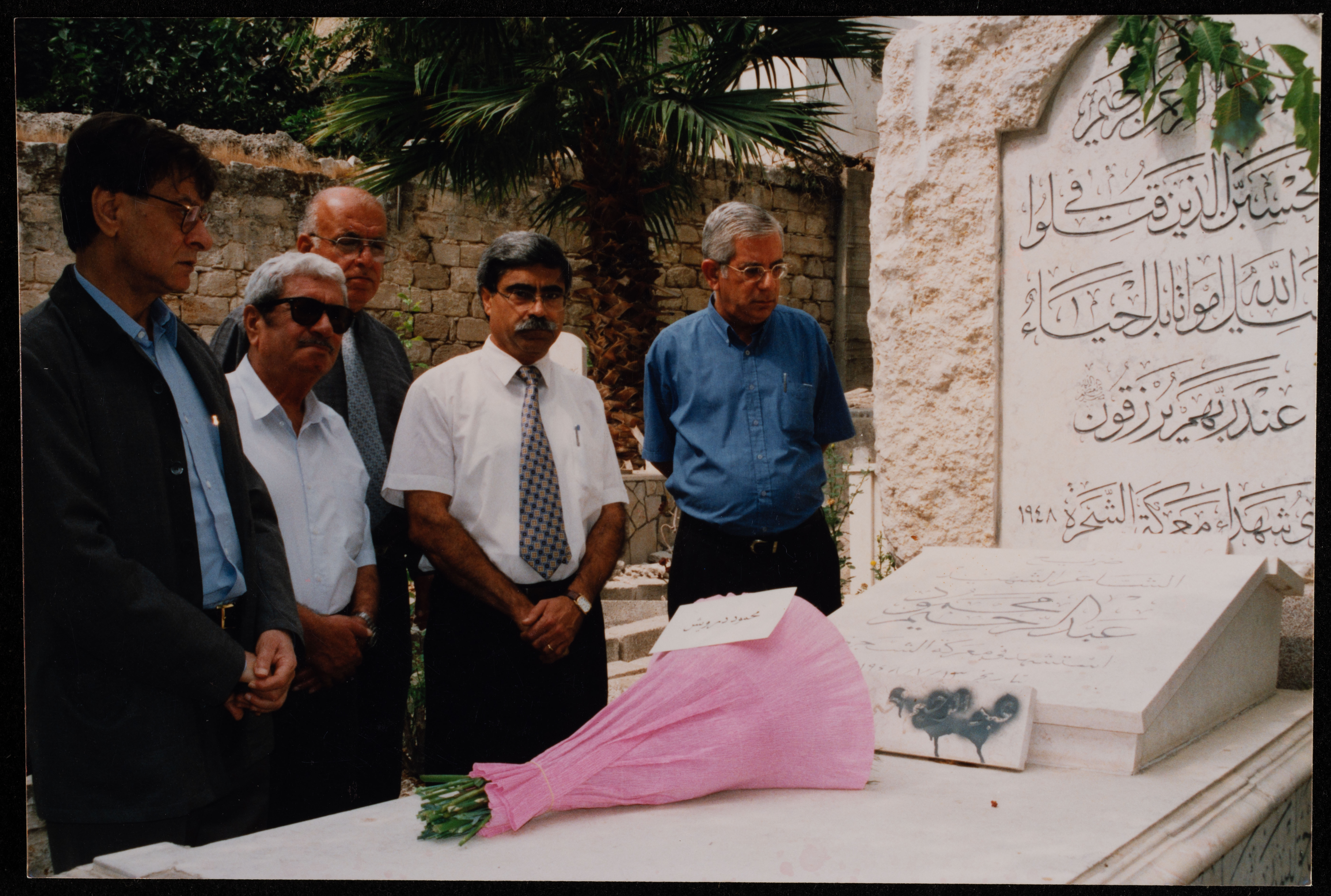صورة التقطت في مطلع تسعينيات القرن العشرين، يظهر فيها الشاعر شكيب جهشان برفقة الشاعر محمود درويش ورئيس بلدية الناصرة رامز جرايسي ونائب البلدية أديب أبو رحمون والشاعر سعودي الأسدي أثناء زيارة قبر عبد الرحيم محمود.