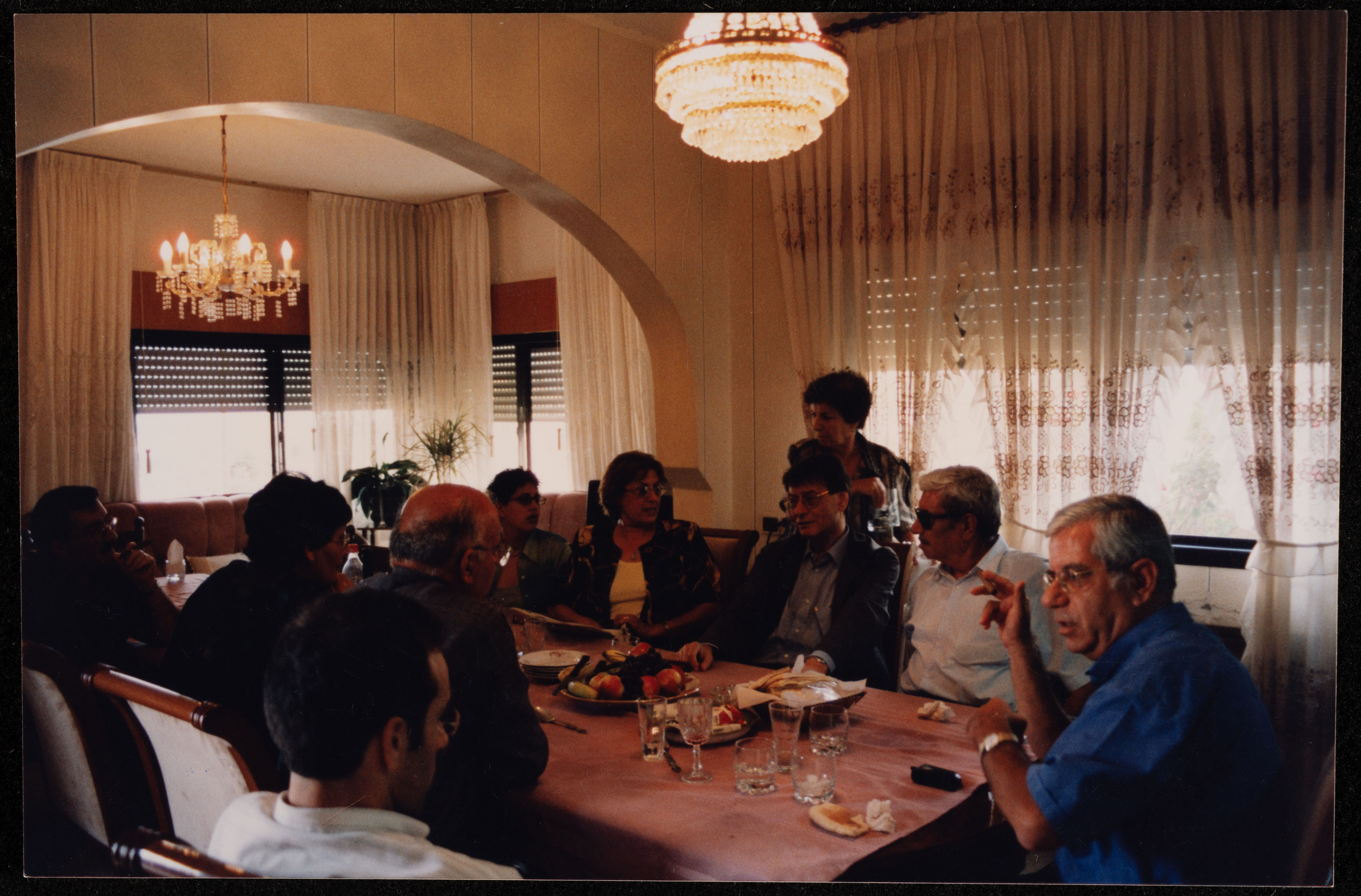 محمود درويش خلال زيارة عائلة شكيب جهشان، الناصرة، مطلع تسعينيات القرن العشرين