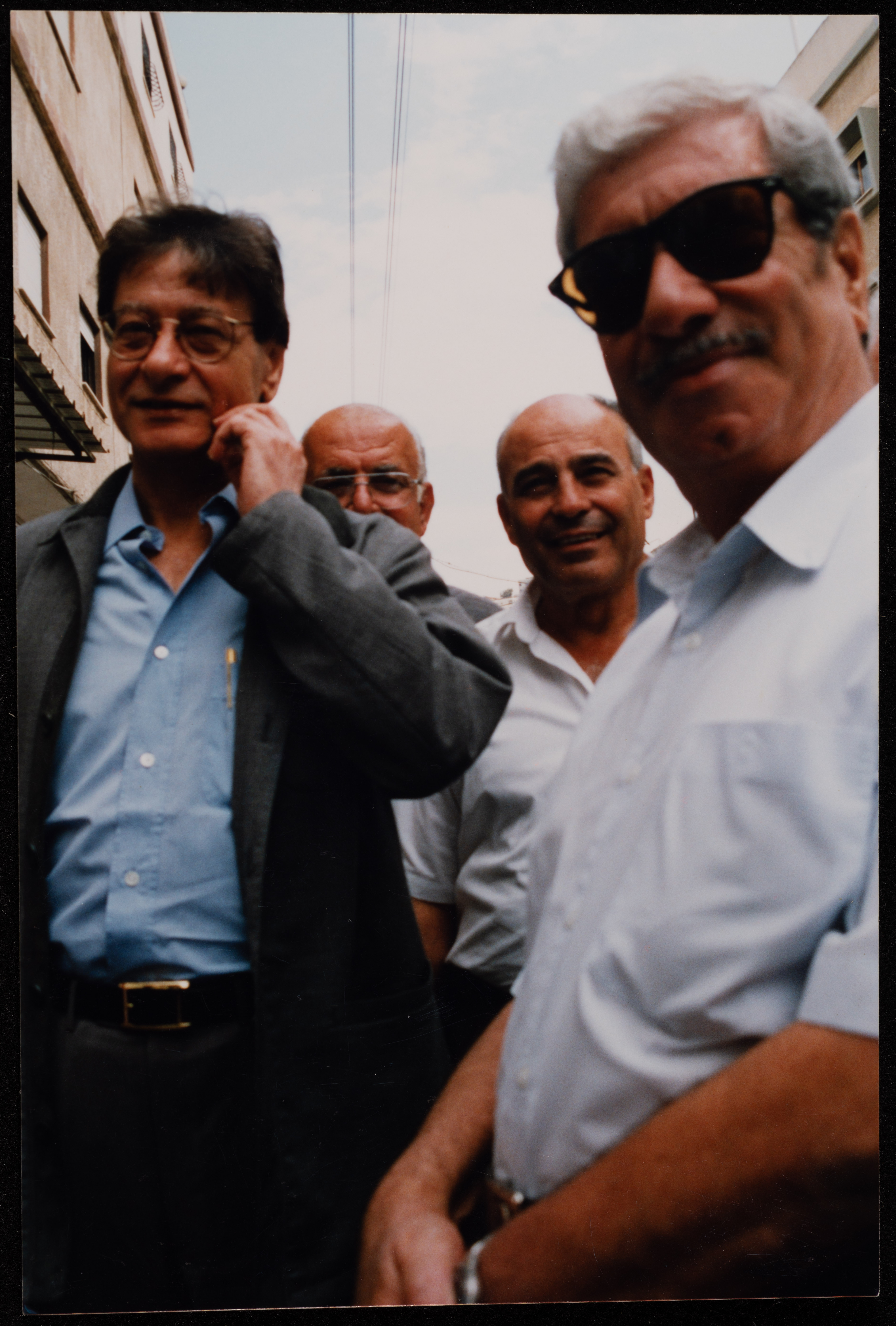صورة التقطت في مطلع تسعينيات القرن العشرين، يظهر فيها شكيب جهشان برفقة محمود درويش خلال زيارة مدينة الناصرة.