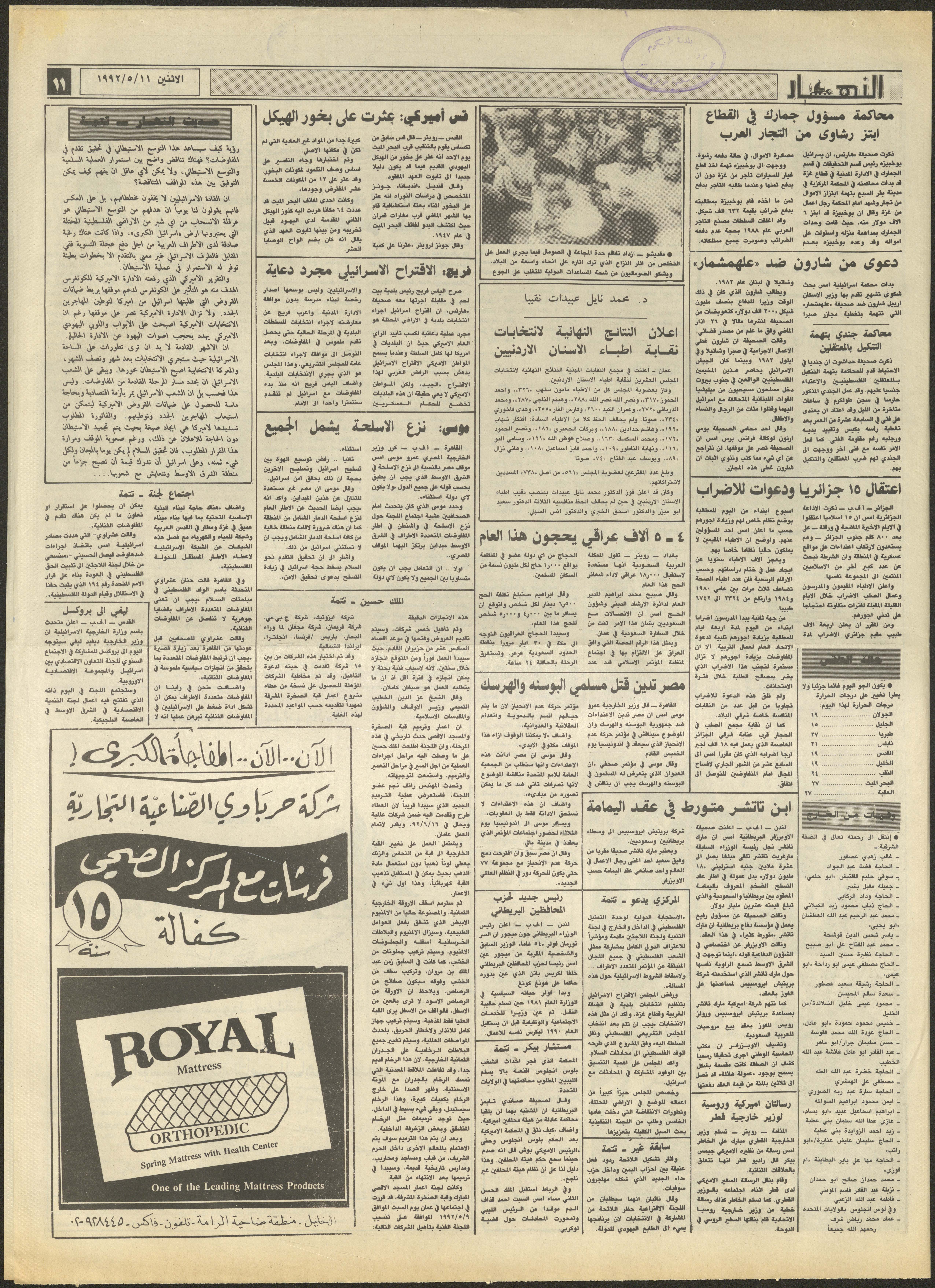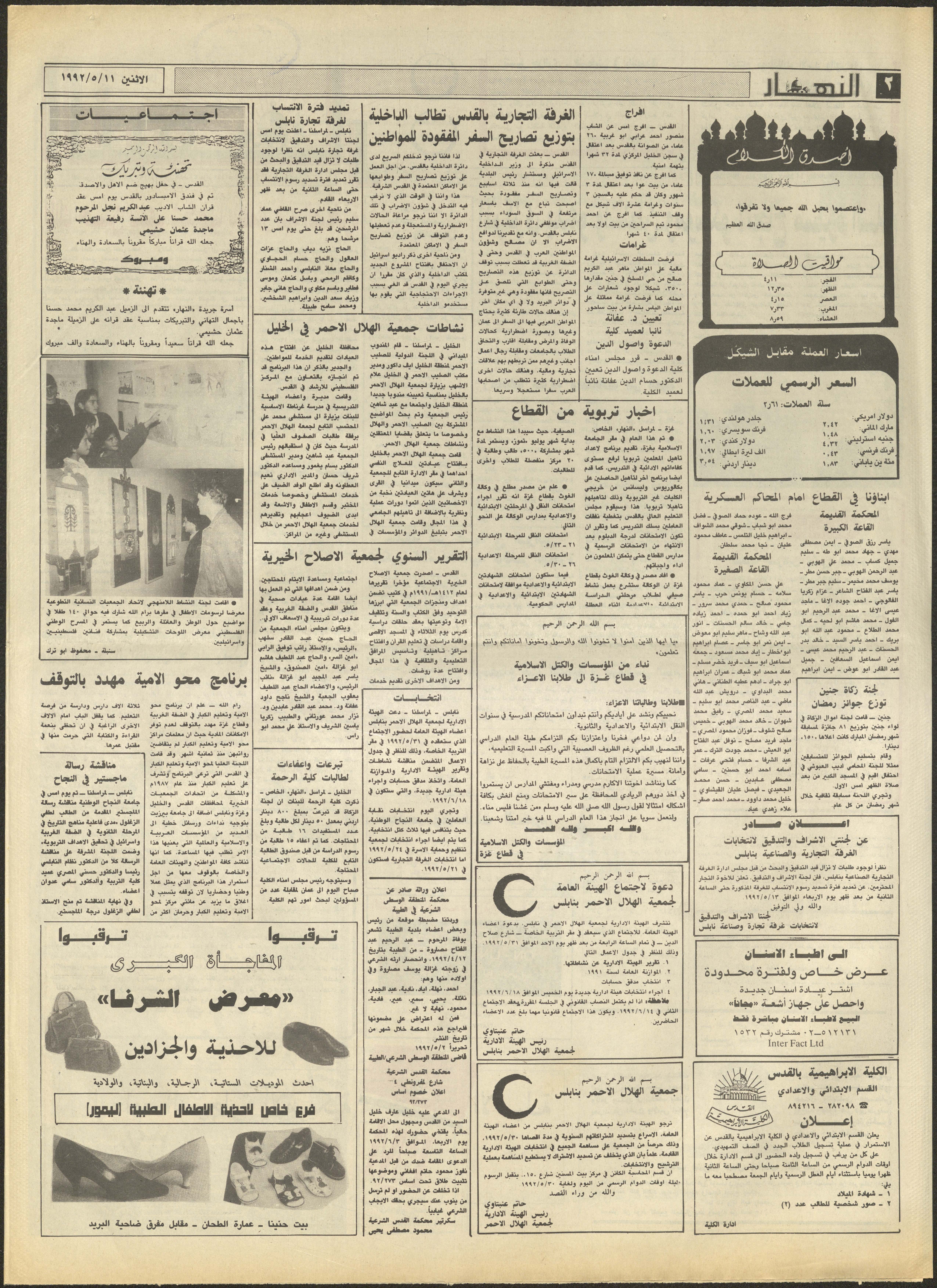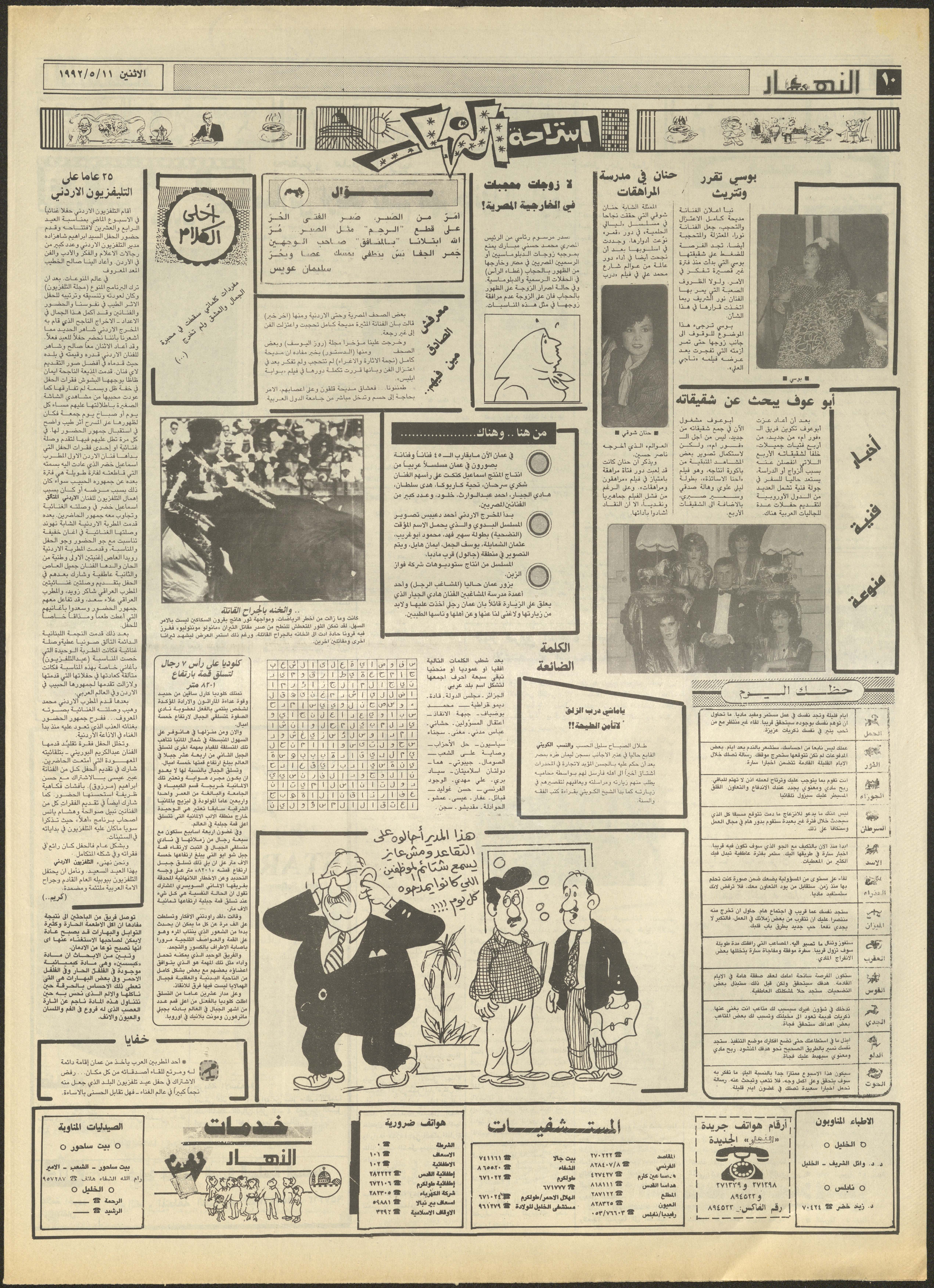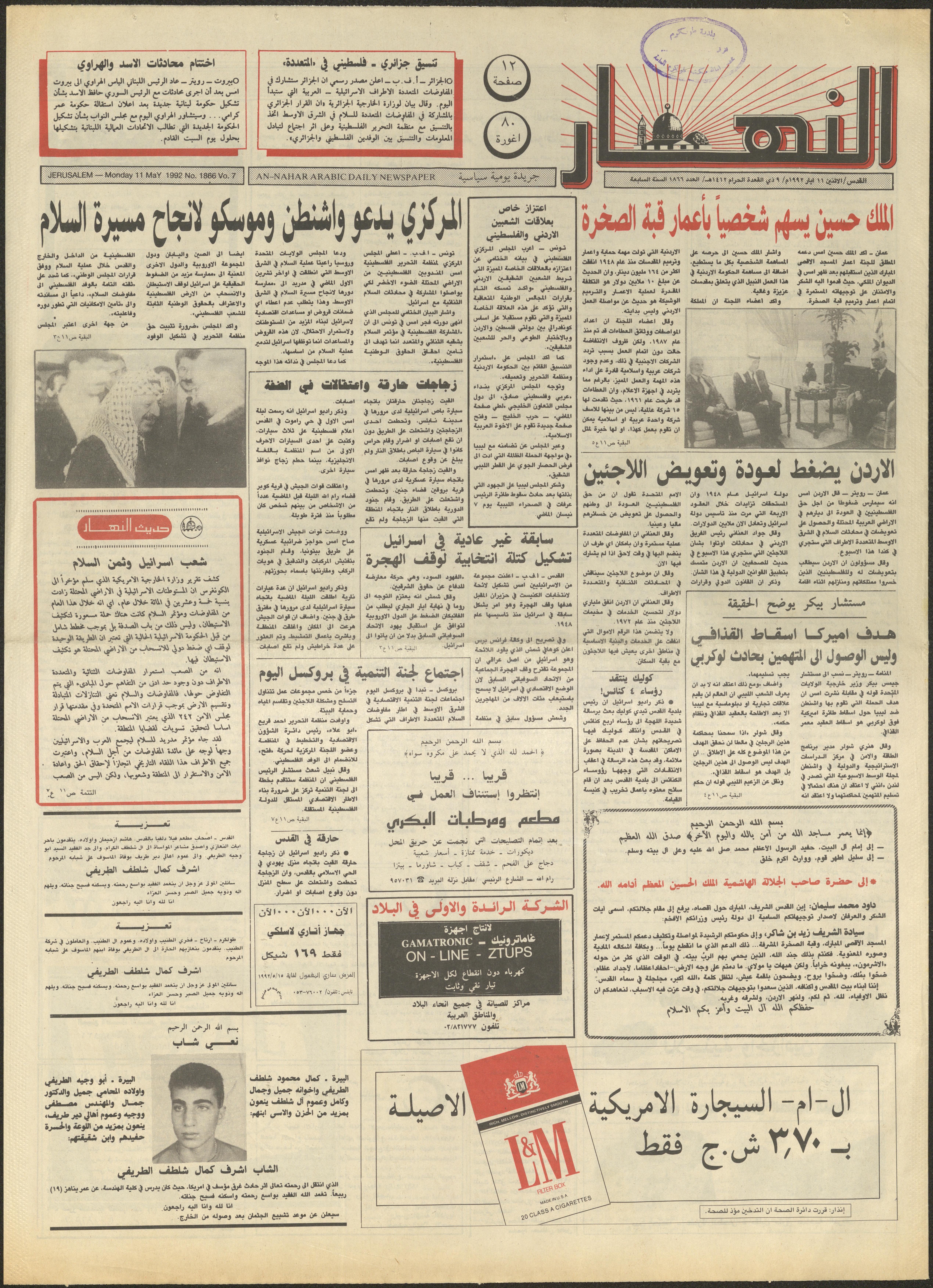 Issued in Jerusalem on 11 May 1992, this archival item documents issue 1866 of al-Nahar Newspaper, under the supervision of Otham al-Hallaq, Editor in Chief at the time. This issue features daily, political, cultural, educational and sports news, in addition to advertisements and women-related articles.