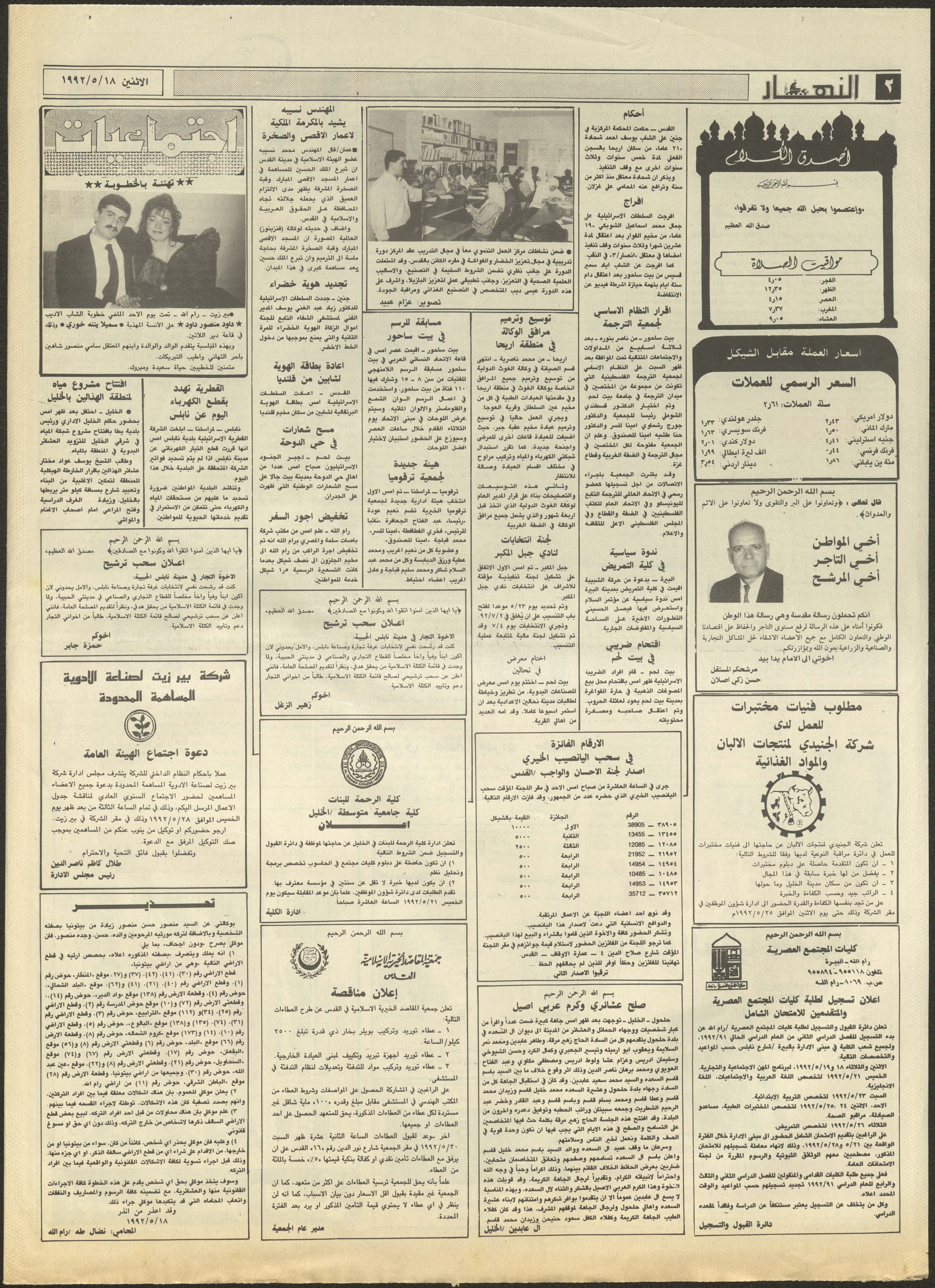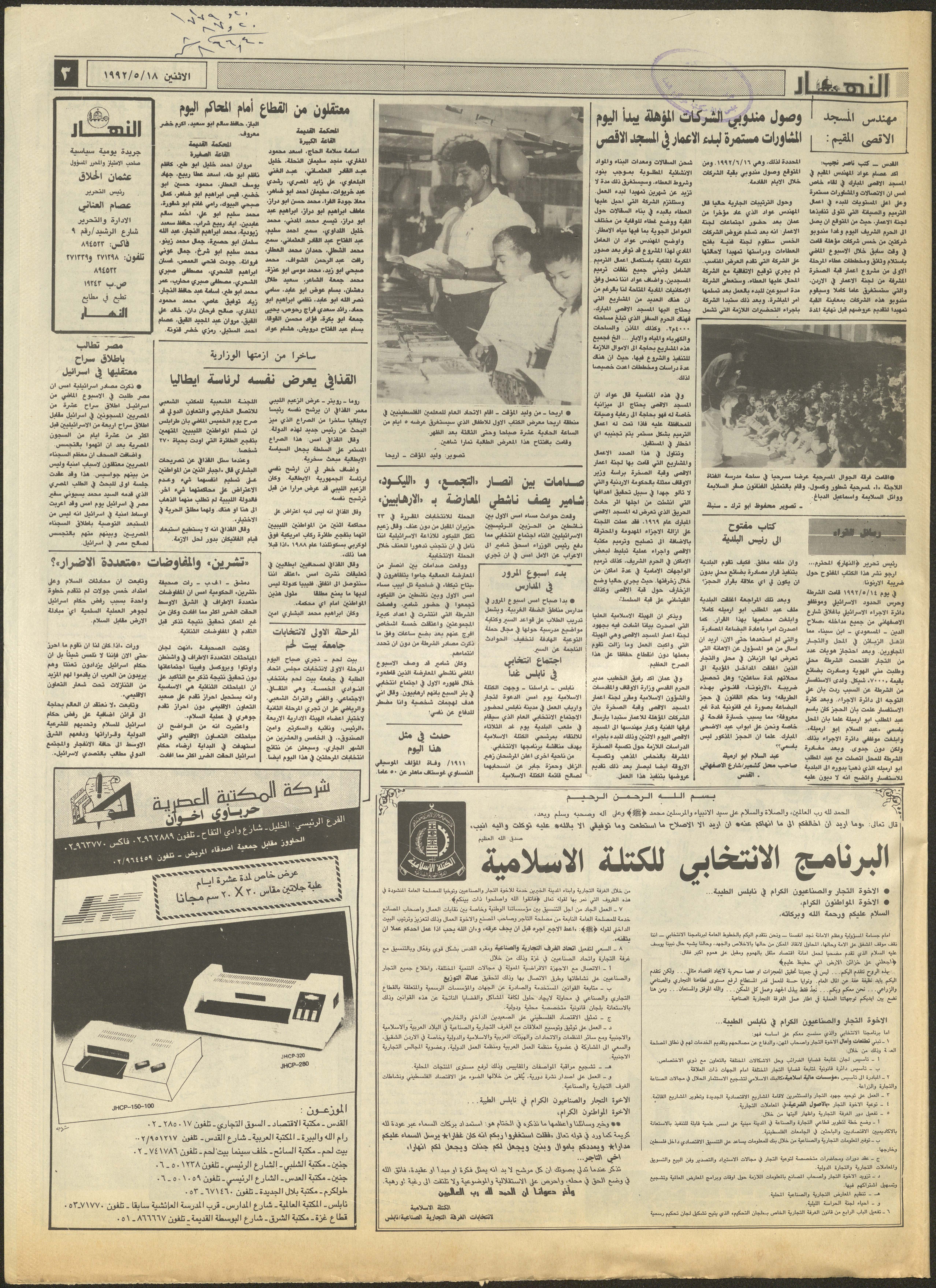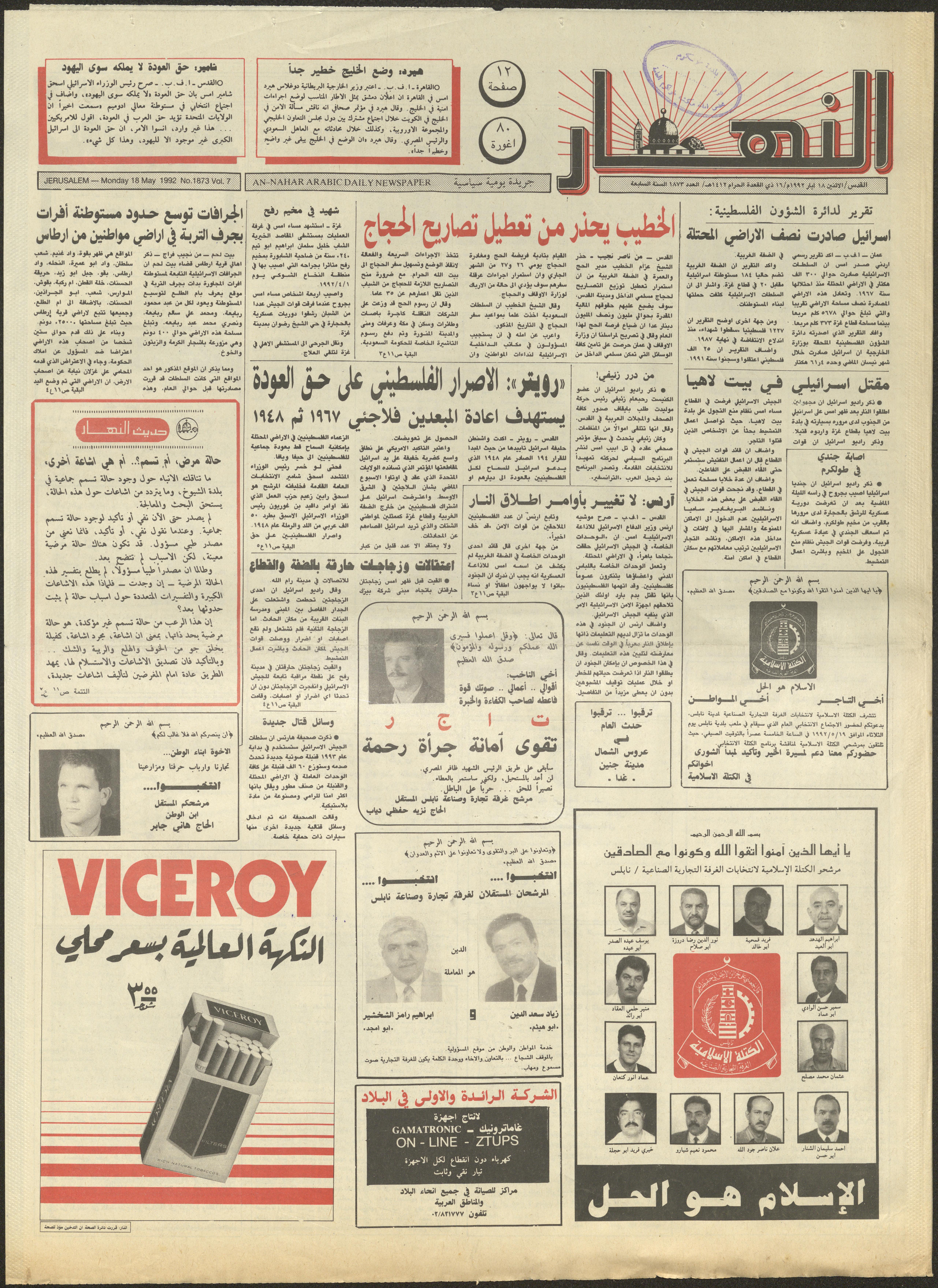 توثق هذه المادة الأرشيفية العدد 1873 من جريدة النهار، الصادر في القدس بتاريخ 18 أيار 1992 بإشراف عثمان الحلاق رئيس تحرير الجريدة في حينه، جاءت فيه أخبار يومية سياسية وثقافية وتعليمية ورياضية بالإضافة للإعلانات والمقالات المتعلقة بالمرأة.