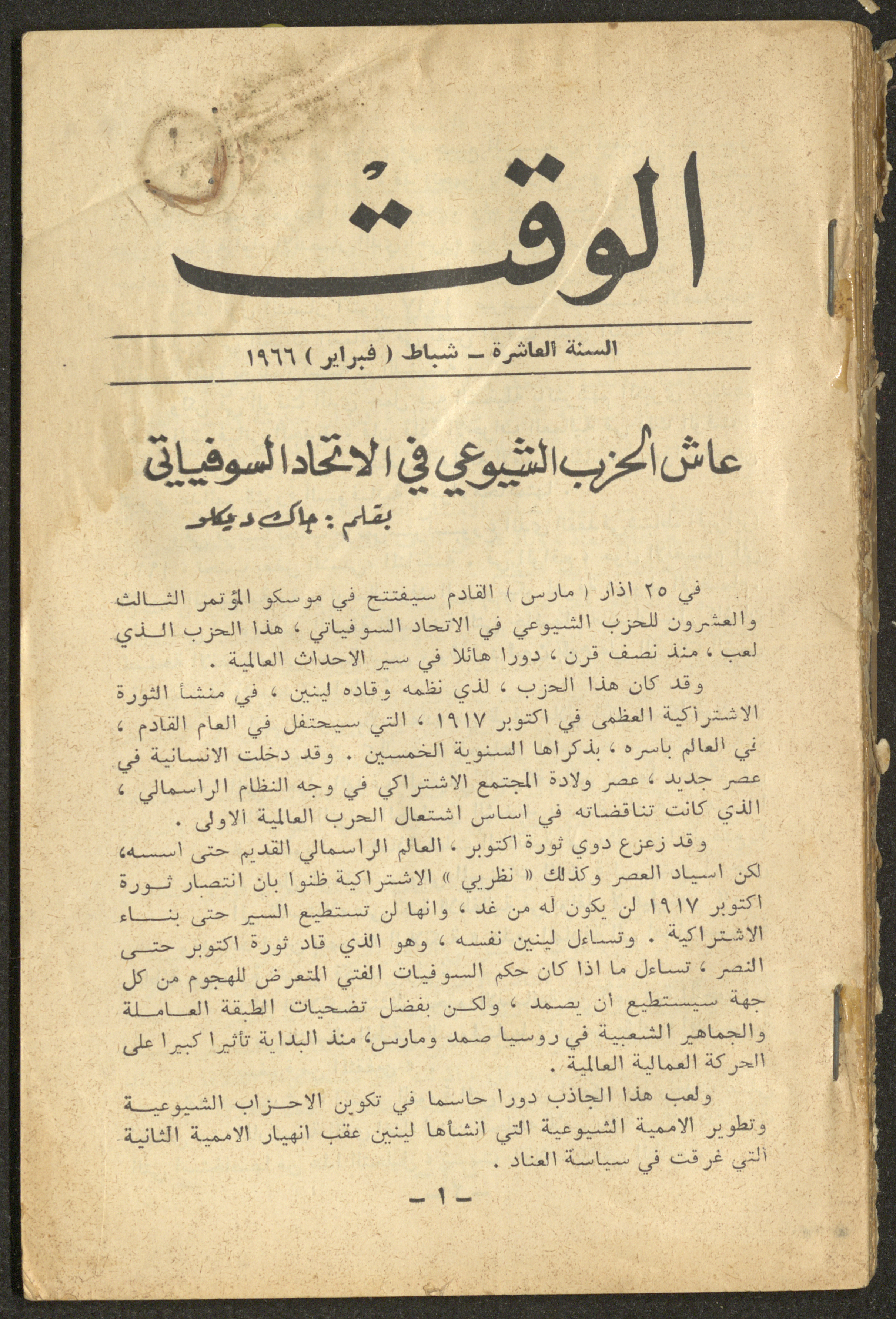 Issued in February 1966, this document shows a section of the 2nd issue of al-Waqt Magazine, which is a monthly literary and political magazine published in Beirut. It included news and articles about the communist movement in the world.