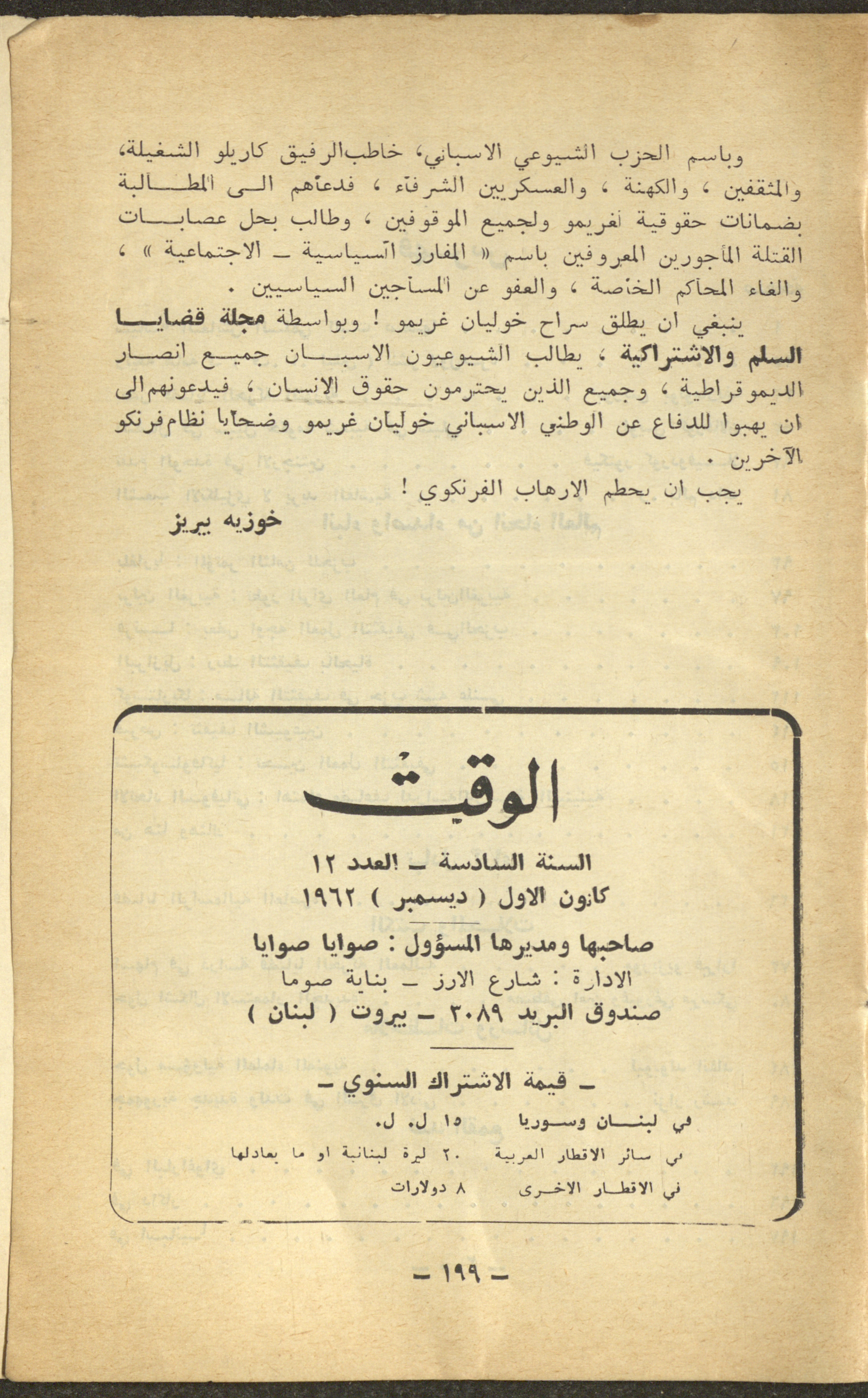 12th Issue of al-Waqt Magazine, Beirut, December 1962